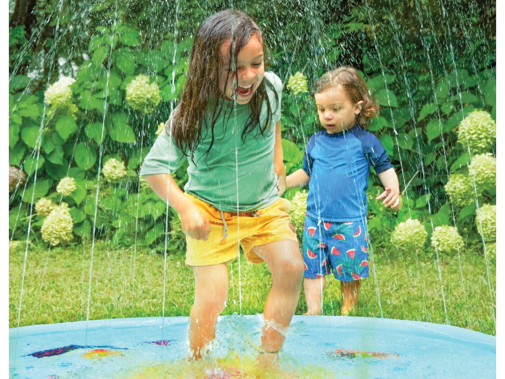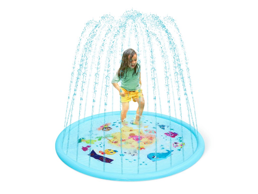 Zábava může začít – léto je tady! Tropická stříkací podložka Splish 'n' Splash od B. Toys je perfektní pro malé i větší děti. Ti nejmenší si užijí bezpečné brouzdání v mělké vodě, zatímco větší děti budou nadšeně poskakovat a cákat pod osvěžujícími vodními sprškami. Vestavěné trysky vytvářejí vodní oblouk až 120 cm vysoký – a pokud svítí slunce, můžete zahlédnout i duhu! Podložka nejen chladí v horkých dnech, ale podporuje i pohyb, koordinaci a smyslový rozvoj. • Velká vodní podložka s tropickým motivem pro letní dovádění • Vodní spršky stříkají až do výšky 120 cm • Dost místa i pro více dětí • Jednoduché připojení na zahradní hadici (5/8") • Po hře stačí vypustit vodu a nechat uschnout Hadice není součástí výrobku. Průměr podložky: cca 178 cm Vhodné pro děti od 12 měsíců.Doplňkové parametry