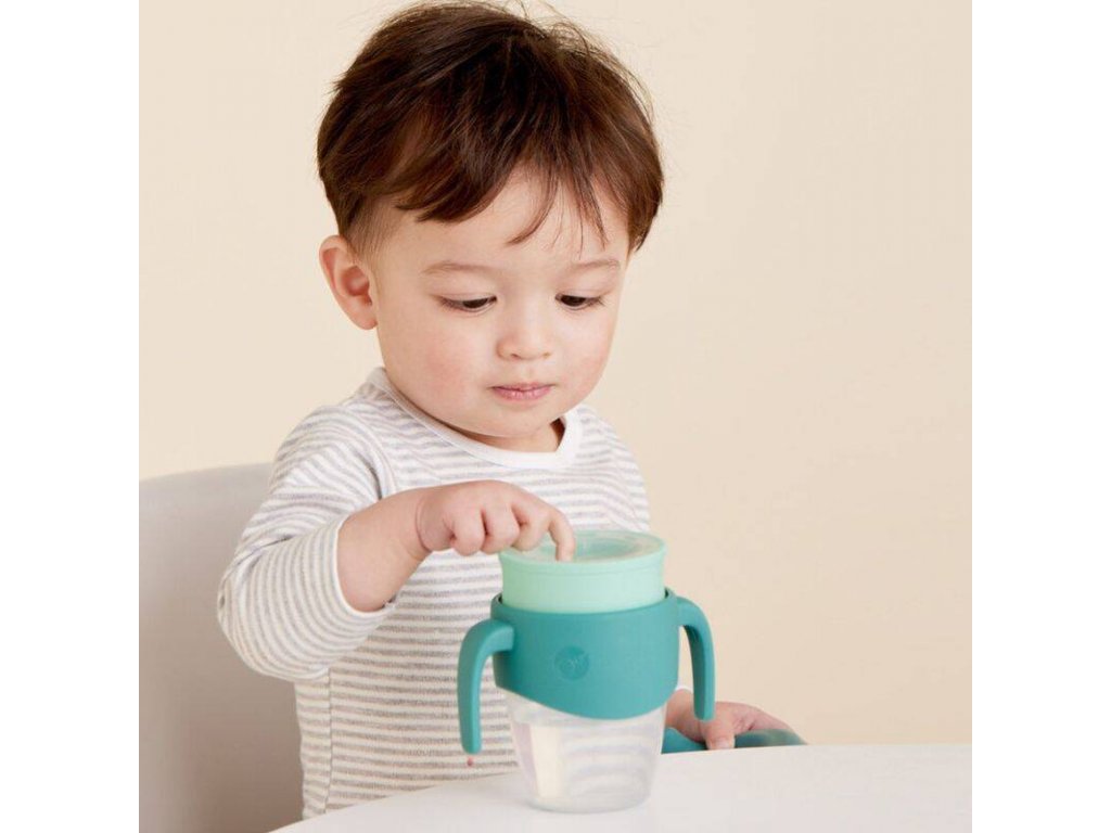 Doporučujeme od 6 měsíců věku, dokud si nebudete jisti, že vaše dítě může pít z otevřeného hrnečku doma nebo na cestách. Některé malé děti si na 360° kelímek mohou zvyknout hned, zatímco jiné mohou potřebovat pár pokusů, aby si zvykly na silikonový okraj a průtok, takže buďte trpěliví. Rukojeti jsou široké, aby je děti mohly snadno uchopit, ale také proto, aby jim v prvních dnech učení pomohli rodiče.