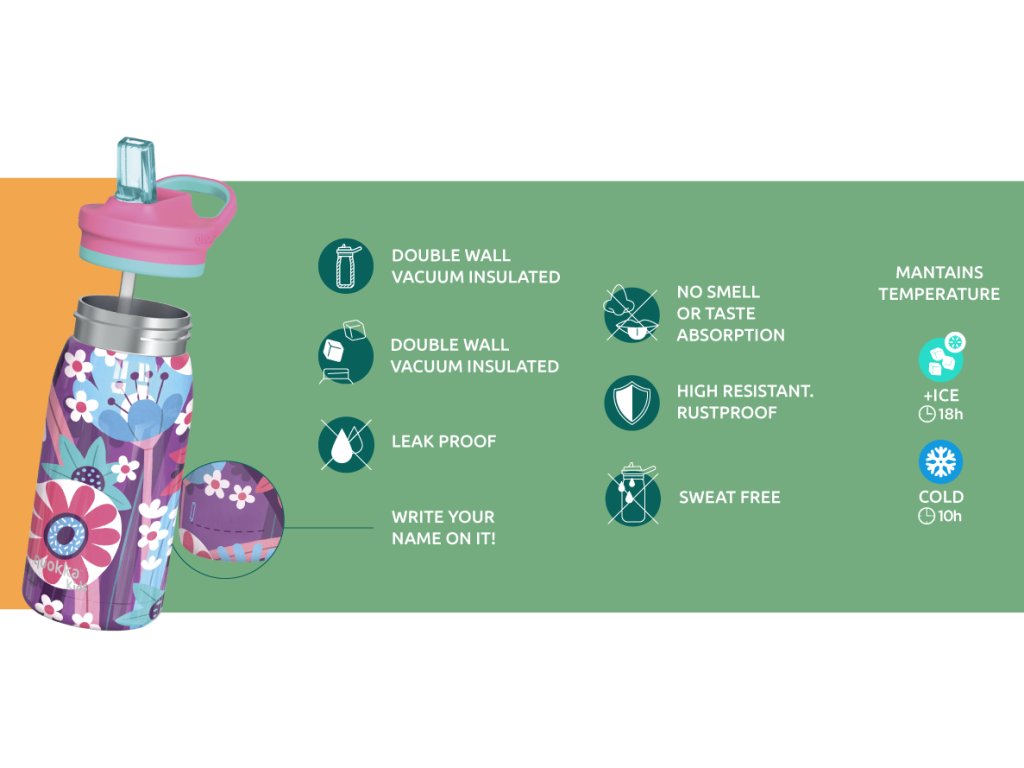 Dětská termoláhev Quokka Pop Kids z vysoce kvalitní dvoustěnné oceli udrží nápoj i během horkých letních dní příjemně studený. Láhev s pítkem a brčkem umožňuje snadné pití bez nutnosti naklánění láhve. Zaklapávací pítko brání vylití obsahu láhve. Široké hrdlo umožňuje vložení kostek ledu a zároveň se díky němu láhev snadno čistí. Údržbu usnadňuje i odnímatelné široké brčko. Díky držadlu se láhev snadno přenáší. Termoláhev udrží teplotu studeného nápoje až 10 hodin, při vložení kostek ledu až 18 hodin. Na spodní části láhve je prostor pro napsání jména nebo nakreslení obrázku, aby nedošlo k záměně ve školce či ve škole. Objem: 445 ml Rozměry: 184 x 72 mm Nerezový materiál neabsorbuje pachy a neobsahuje BPA. Termoláhev není vhodná do myčky ani mikrovlnné trouby.Doplňkové parametry