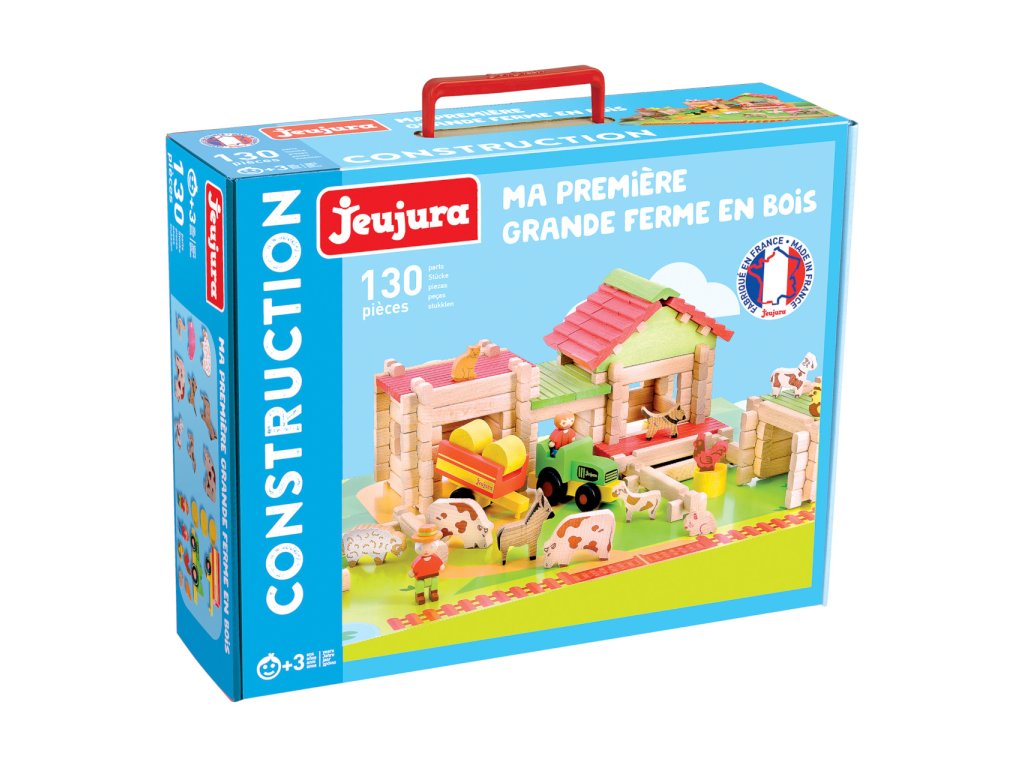 Dřevěná stavebnice, která seznámí malé stavitele se životem na farmě, stane se ozdobou dětského pokoje. Stavebnice Jeujura Constructions mají dlouhou tradici a patří mezi klasické francouzské hračky. Nabízí série tématicky věnované chatám, domkům a farmám, ale také divokému západu a středověku. Dají se mezi sebou volně kombinovat a k řadě z nich je také nabízeno příslušenství, figurky a vozidla. Jsou vyráběny ve Francii, z masivního bukového a borovicového dřeva francouzského původu. Dílky stavebnic jsou ošetřeny výhradně za použití barev a laků na bázi vody. Každá sada je balena v praktickém lepenkovém kufříku potištěném rostlinnými inkousty a součástí balení je snadno pochopitelný návod. Hlavní vlastnosti: 130 dílků z masivního dřeva a podložkapraktické balenívyrobeno ve FranciiSizing info