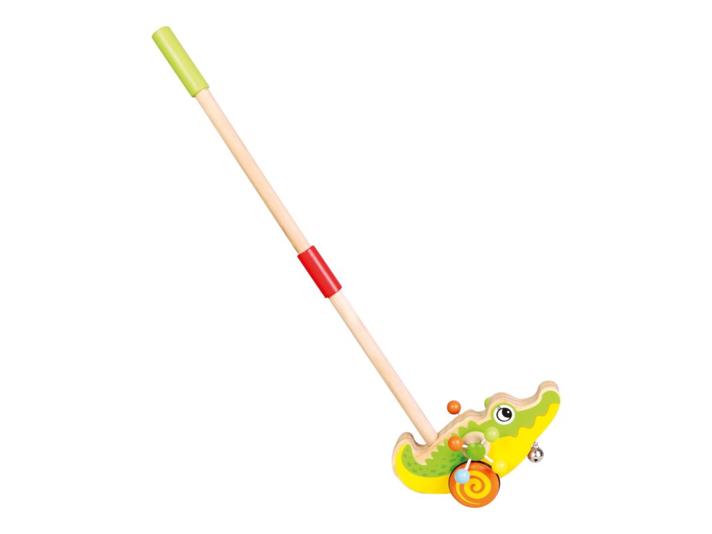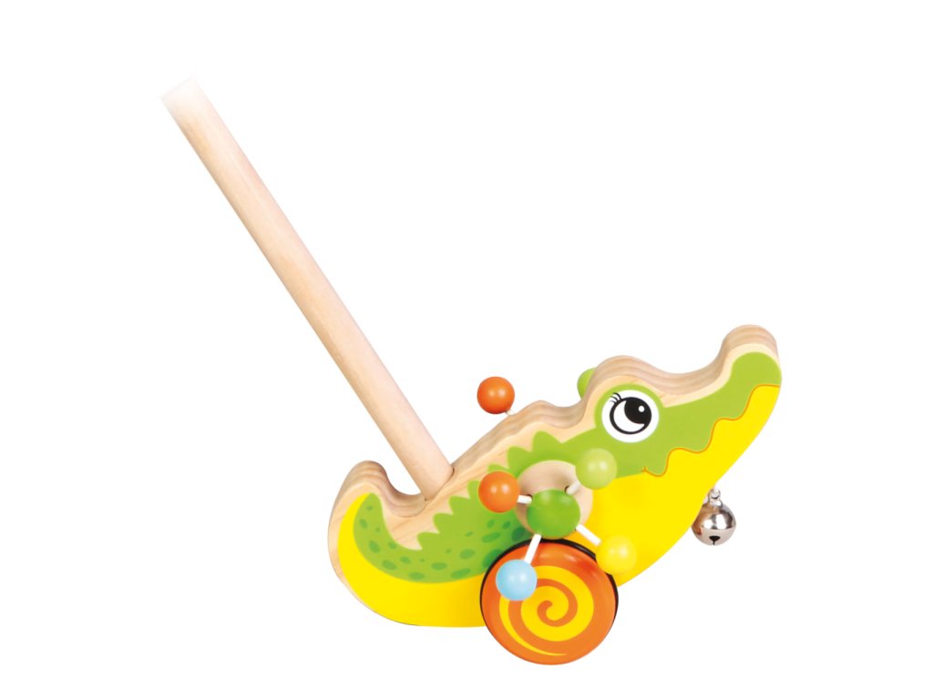 Vysoce kvalitní oblíbená dřevěná hračka v designu krokodýla. Krokodýl na tyči s rolničkou, při jízdě vydává zvuky. Hračka, kterou může dítě tlačit před sebou, pomáhá rozvíjet motorické schopnosti. Děti se také tímto způsobem učí rozlišovat barvy a zvířata. Jezdík má pogumovaná kolečka pro tichý chod. Děti ho mohou strkat nebo tahat doma i venku. Krásný dárek pro Vaše dítě. Hlavní vlastnosti: podporuje dítě v prvních krůčcíchzábavný a roztomilýrozvíjí motorické schopnostiSizing info
