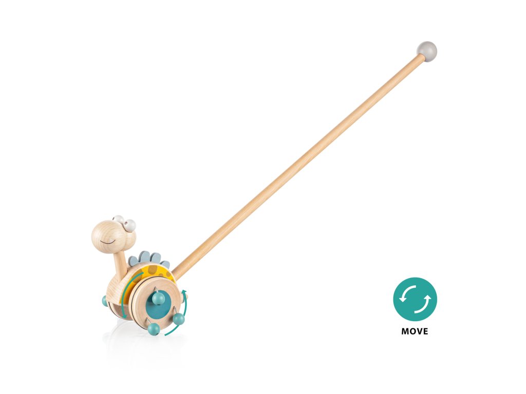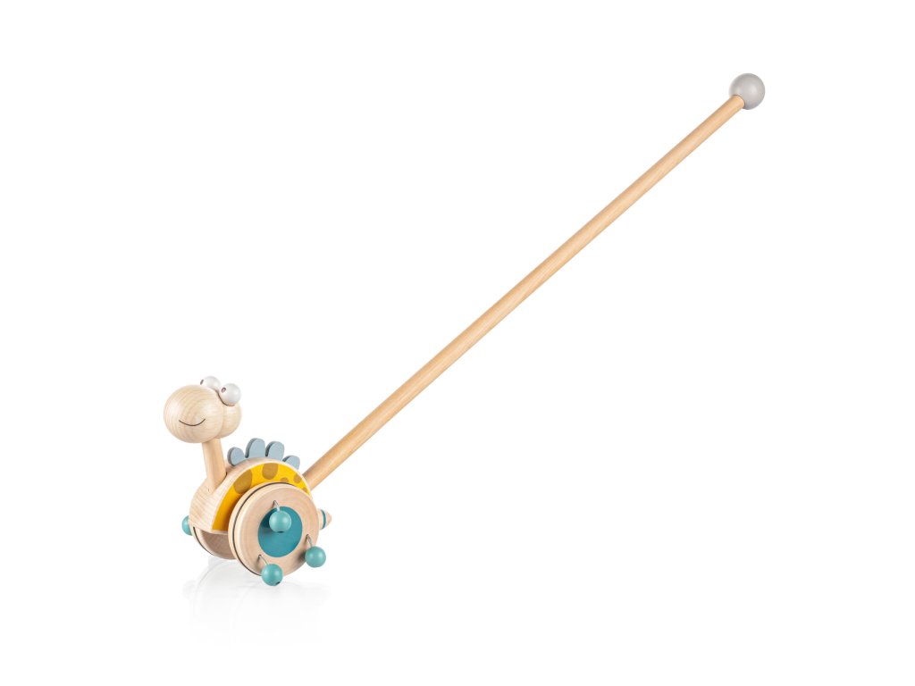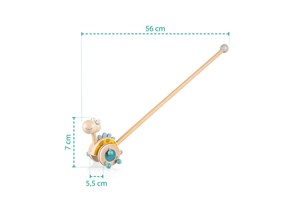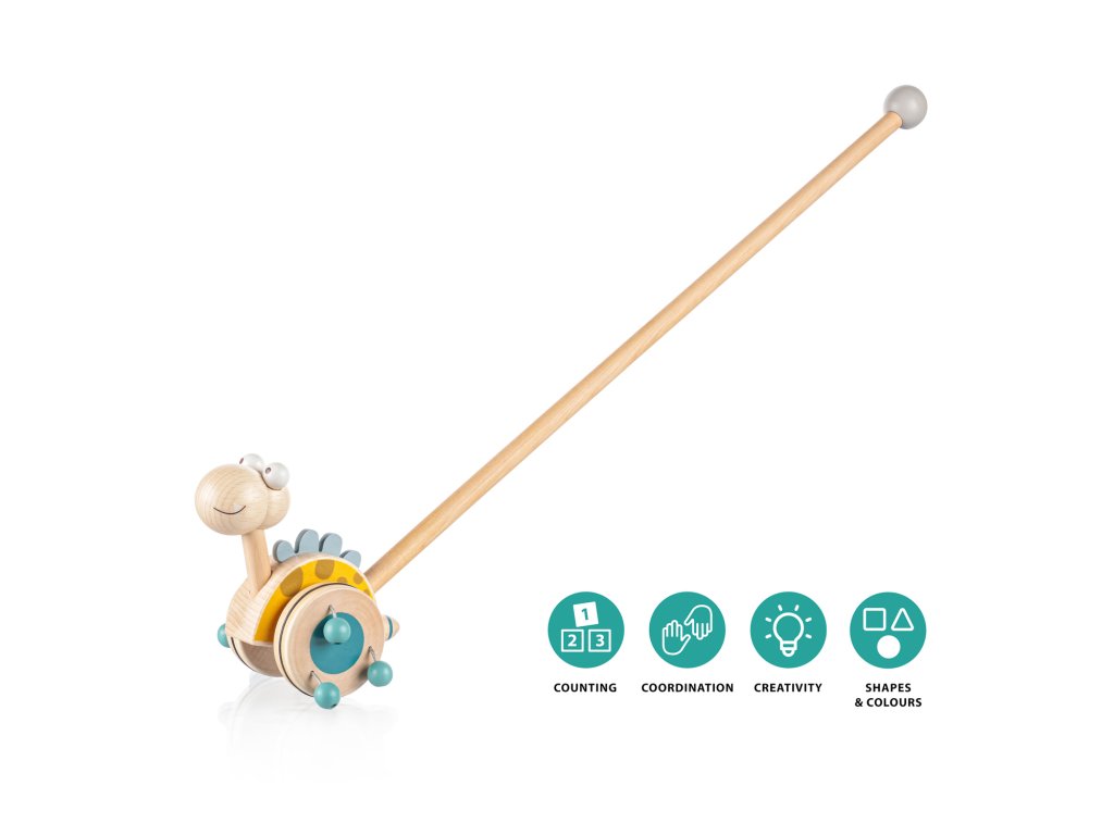 Jezdík na tyči je ideální hračkou pro děti, které začínají chodit. Zábavný dinosaurus na dlouhé tyči se při pohybu točí a díky dřevěným korálkům připevněných na kolečkách vydává zvuk, který dítě naláká k chůzi a zabaví na dlouhé hodiny.