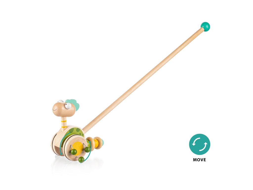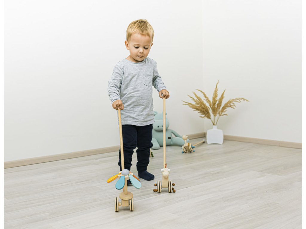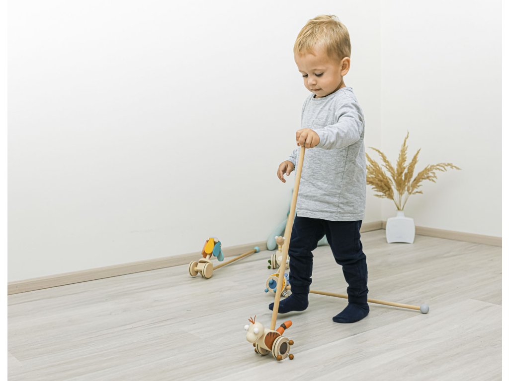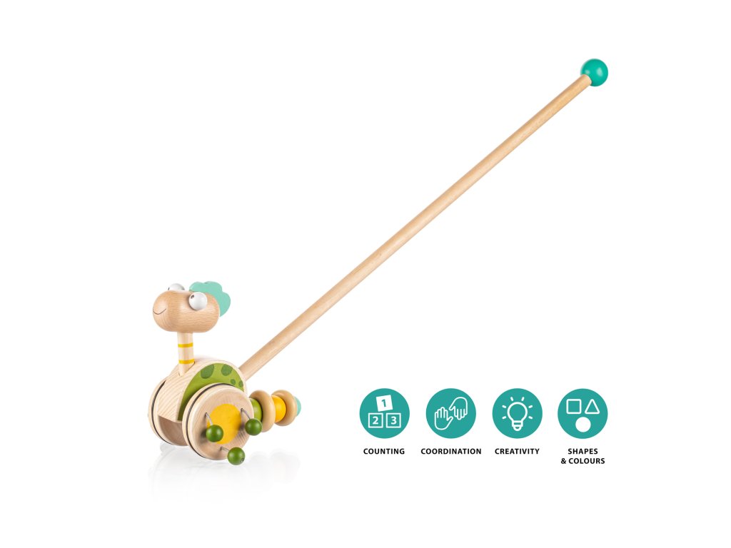 Jezdík na tyči je ideální hračkou pro děti, které začínají chodit. Zábavný dinosaurus na dlouhé tyči se při pohybu točí a díky dřevěným korálkům připevněných na kolečkách vydává zvuk, který dítě naláká k chůzi a zabaví na dlouhé hodiny.
