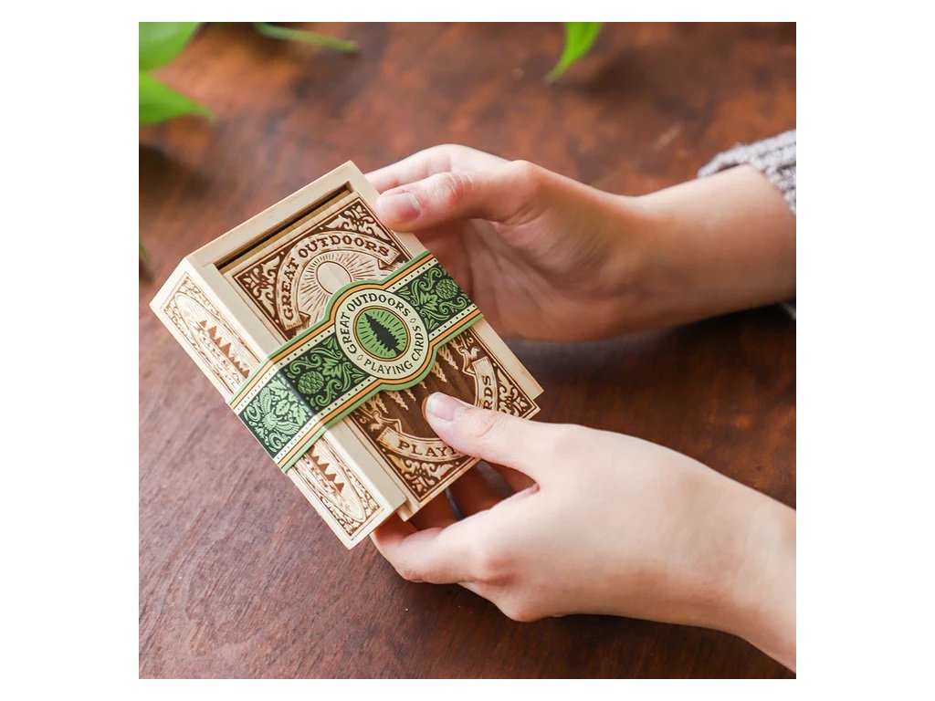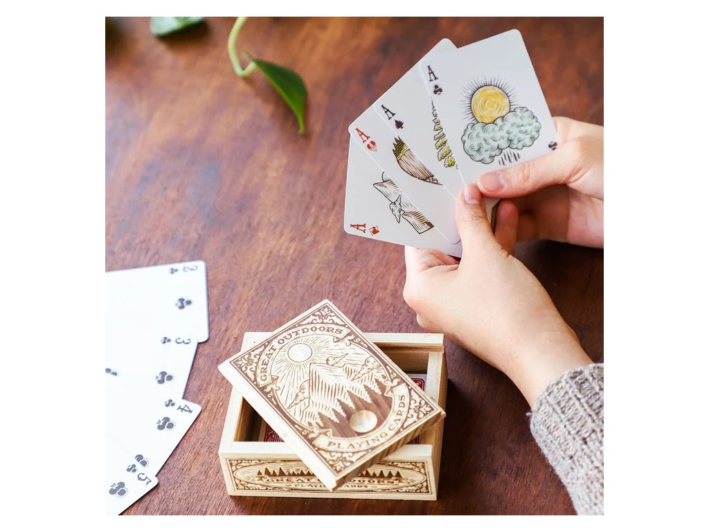 Tyto luxusní hrací karty vám přinášejí krásu přírody na dosah ruky. Čtyři barvy reprezentované rostoucími stromy, tekoucí vodou, majestátními horami a rozlehlým nebem, každý prvek v tomto ilustrovaném balíčku karet zobrazuje zázrak přírody. Tato sada karet je zabalena v dřevěné krabičce se zasouvacím víkem. Je velmi hezká, můžete si ji vystavit na stole nebo poličce, je také dostatečně lehká, abyste si ji mohli vzít na cesty. Jistě potěší outdoorové nadšence, milovníky přírody a umění i hráče karet. Obsahuje kompletní balíček 52 karet plus dva žolíky. Hlavní vlastnosti: 52 karet a 2 žolíkyvhodné na cestyvhodný dárek pro nadšence přírodySizing info