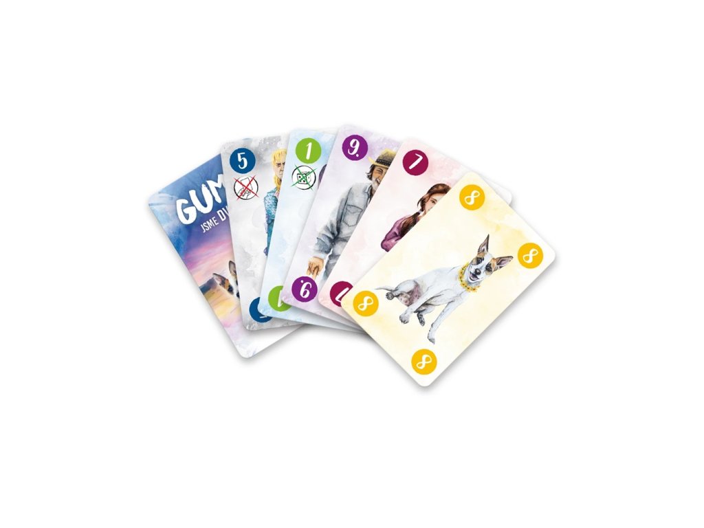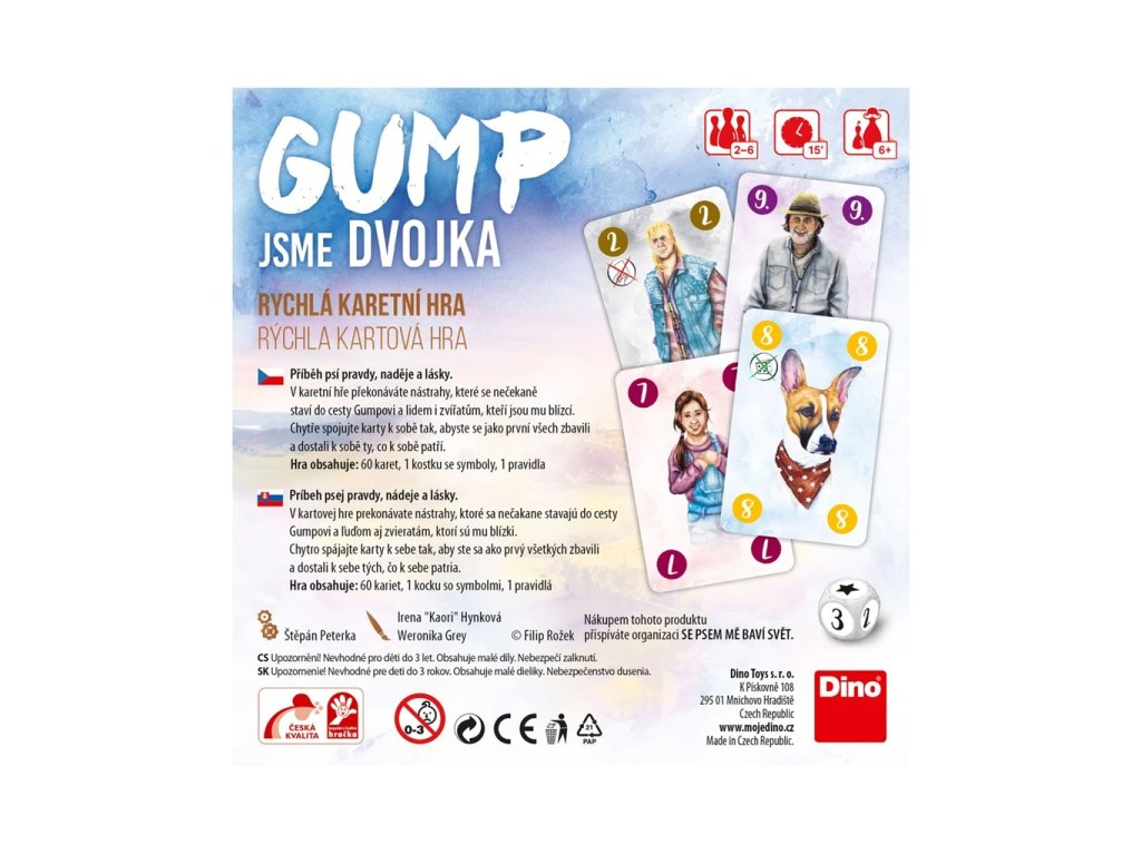 Vaším úkolem je spojit všechny dobré lidi a zvířata, aby nikdo nezůstal sám. Společné místo představuje odhazovací balíček karet a cílem každého z hráčů je dostat na něj všechny své lidi a zvířata dříve než ostatní. Hrajte rychle a šikovně, neboť zlý páníček Gumpovy sestřičky číhá, a jeho vlastní zájmy mohou ohrozit Vaši šťastnou rodinu. Připravte se na dobrodružství, které potěší nejen děti od 6 let, ale i dospělé. Obsah balení: 60 karet1 kostka se symbolynávod ke hře Hlavní vlastnosti: vhodné na cestovánípro děti od 6 letvyrobeno v ČR Zkrácený návod ke hřeKaždému hráči rozdejte 7 karet, zbytek karet tvoří dobírací balíček na stole. 1 karta se položí na stůl jako základ odkládacího balíčku. Hráči odkládají karty, hodnota karty musí být vyšší, než je karta na odkládacím balíčku. Hodnotu mohou také složit ze 2 a více karet, ale nesmí se karet zbavovat zbytečně. Pokud odkládají 2 a více karet, kutálejí kostkou a doberou si odpovídající počet karet. Vítězí ten, kdo se jako první zbaví všech karet z ruky.Sizing info
