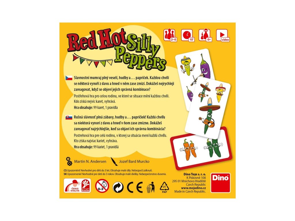 Jak ostrý máte zrak? To otestuje postřehová hra Red Hot Silly Peppers. Při té musíte nasbírat v souladu s pravidly co nejvíce pikantních papriček a udržet to tak až do momentu, kdy někdo z hráčů zahraje poslední kartu. Hlavní je umět rychle reagovat, když se objeví ta pravá kombinace papriček. Kdo v zábavné postřehové hře zvítězí, není jisté až do poslední chvíle, tak buďte stále ve střehu! Balení obsahuje: 99 karet, z toho 3 karty se zadáním a 96 karet s papričkami (na každé jsou 1 až 4 papričky 1 nebo 2 druhů), pravidla Hlavní vlastnosti: postřehová hra pro celou rodinuhra vhodná na cestyhra zaručí zábavu a procvičí paměť i zrakové schopnostiSizing info