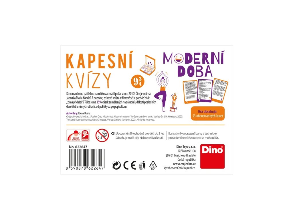 Pamatujete si, kterou slavnou pařížskou památku zachvátil požár v roce 2019? Víte, čím je proslulá Japonka Marie Kondo? A dokážete přiřadit citát „Zima přichází“ k jeho knižní a filmové sérii? Tyto originální kapesní kvízy jsou určeny pro dospělé i děti od 12 let a prověří vaše znalosti moderní doby. Obsahují 159 otázek zaměřených na nejdůležitější události posledních desetiletí napříč různými tématy – od sportu a filmu, přes kulturu a politiku, až po technologie, přírodu a další. Každá karta obsahuje několik otázek s nabídkou odpovědí. Správnou odpověď doplněnou o zajímavé a často překvapivé informace najdete na druhé straně karty. Připravte se na nečekaná fakta a zábavné perličky, které vás určitě překvapí. Hlavní vlastnosti: 53 oboustranných karet s texty v češtině159 otázekspousta zajímavých informací moderní doby ideální na cestySizing info