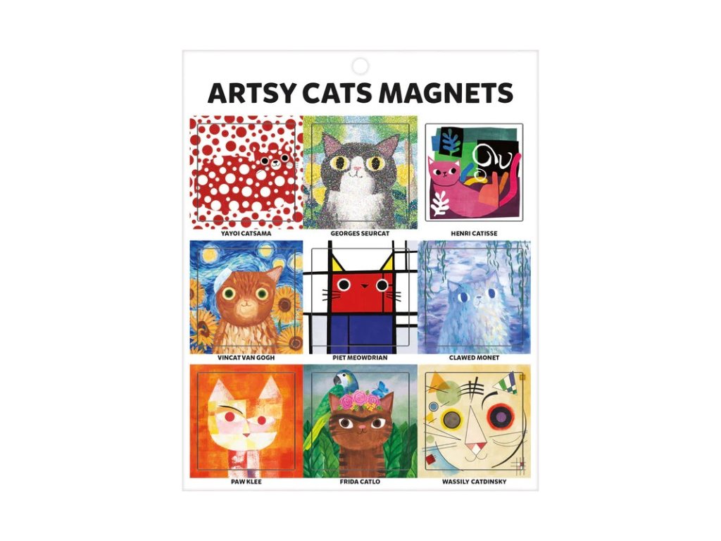 Představte si moderní umění s touto sadou magnetek, z nichž každá je inspirována ikonickým stylem umění. Sada obsahuje devět magnetek inspirovaných slavnými umělci: Clawed Monet, Henri Catisse, Frida Catlo, Vincat van Gogh, Yayoi Catsama, Paw Klee, Georges Seurcat, Wassily Catdinsky a Piet Meowdrian. Hlavní vlastnosti: 9 ks magnetekhravé ilustracedekorační prvek vhodný do pokoje i na ledniciSizing info