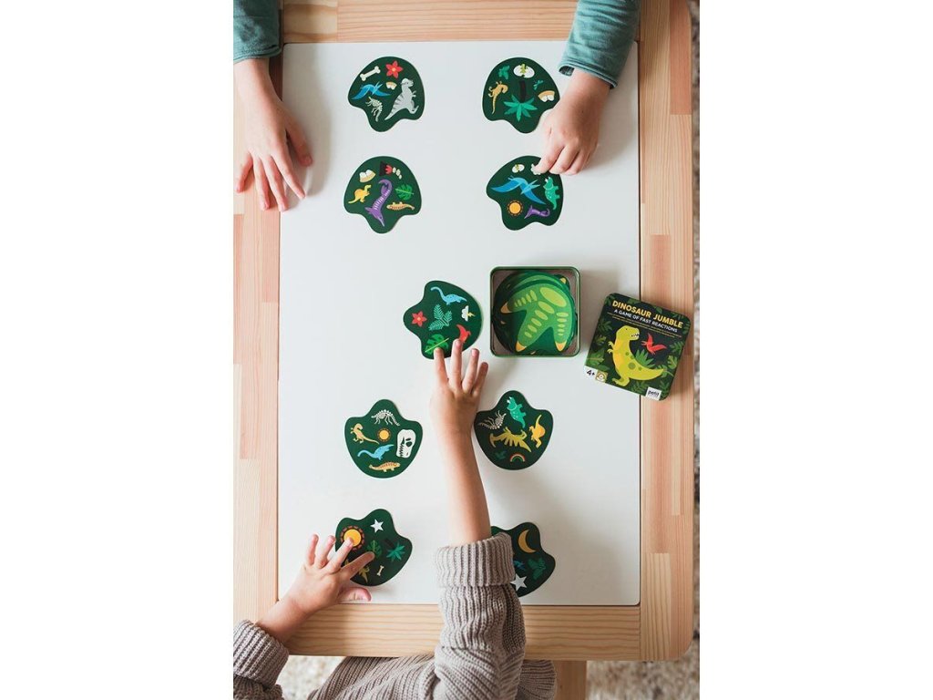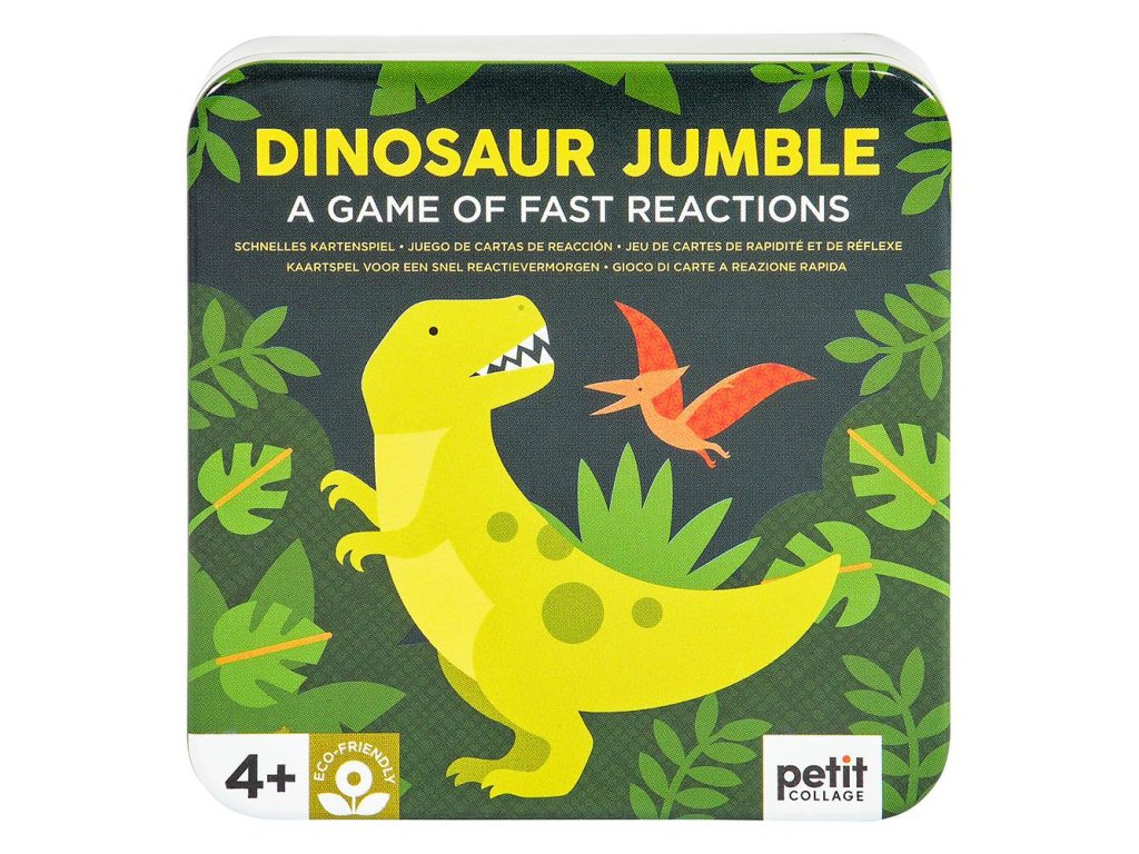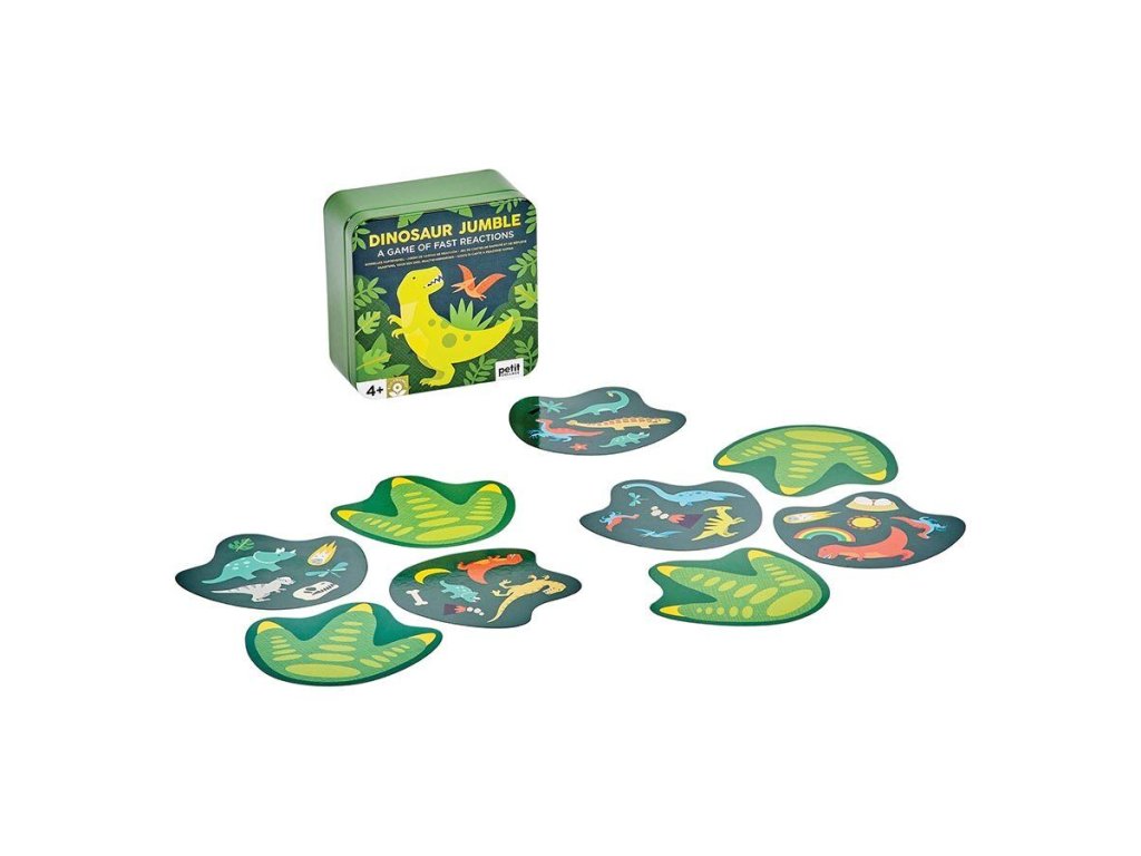 Trénujte svůj postřeh s dinosaury. Tato karetní hra nabízí až pět variant pravidel a je plná barevných ilustrací s tematikou dinosaurů. Jistě si ji rychle oblíbíte také pro její skladnost, je tak vhodná ke hře doma i na cestách. Baleno v kovové krabičce bez použití plastu. Hlavní vlastnosti pro 2–6 hráčů5 variant pravidelpraktické balení Návod ke hře: Základní varianta:Každému hráči rozdejte jednu kartu lícem dolů. Balíček otočený lícem nahoru umístěte mezi hráče. Na smluvený signál hráči otočí své karty. Hráč, který první nahlásí shodný symbol na své kartě a na kartě v balíčku, si kartu z balíčku vezme. Takto je balíček nakonec dobrán a vítězem se stává hráč s největším počtem karet. Obrácená varianta:Rozdejte mezi hráče karty tak, aby všichni drželi stejný počet karet a jedna karta zbyla. Hráči své karty v balíčku položí před sebe lícem dolů. Zbývající kartu, otočenou lícem nahoru, položte mezi hráče. Na smluvený signál hráči otočí svrchní kartu svého balíčku. Kdo jako první nahlásí symbol shodný na své kartě a kartě mezi hráči, svou kartu mezi hráče na vznikající kupku přiloží a otočí další svou svrchní kartu. Takto hra pokračuje, dokud nezůstane poslední hráč s kartami, a stává se tak poraženým. Hráč, který se karet zbavil jako první, je vítězem. Skupinová varianta:Hraje se na kola. V každém kole je před jednotlivce rozdáno po jedné kartě lícem dolů. Na smluvený signál hráči svou kartu otočí, a který z nich pojmenuje a nahlásí symbol shodný se symbolem na kartě jiného hráče, svou kartu mu předá. Takto hra pokračuje, dokud jeden hráč nepřijme všechny karty v jednotlivém kole rozdané. Cílem hry je zbavovat se karet, hráč, který v součtu kol přijal nejvíce karet, je poražený.Sizing info