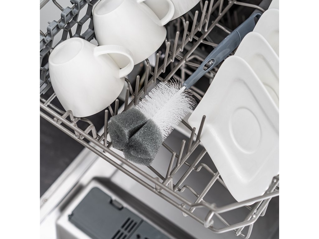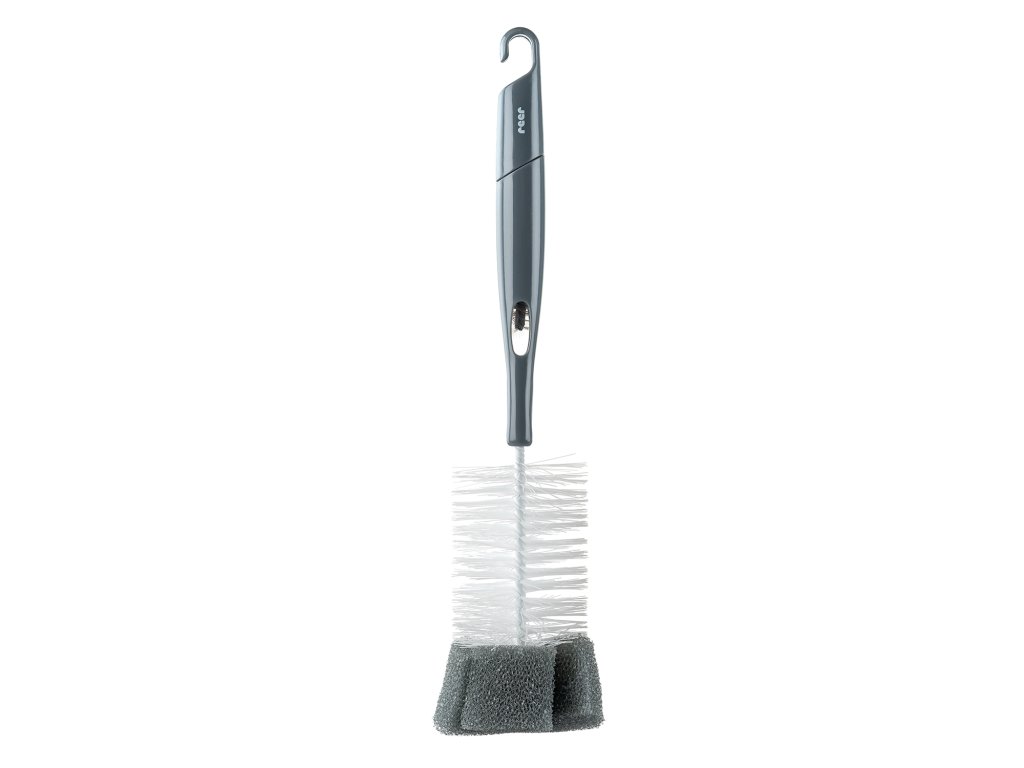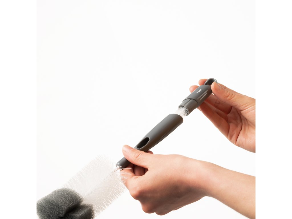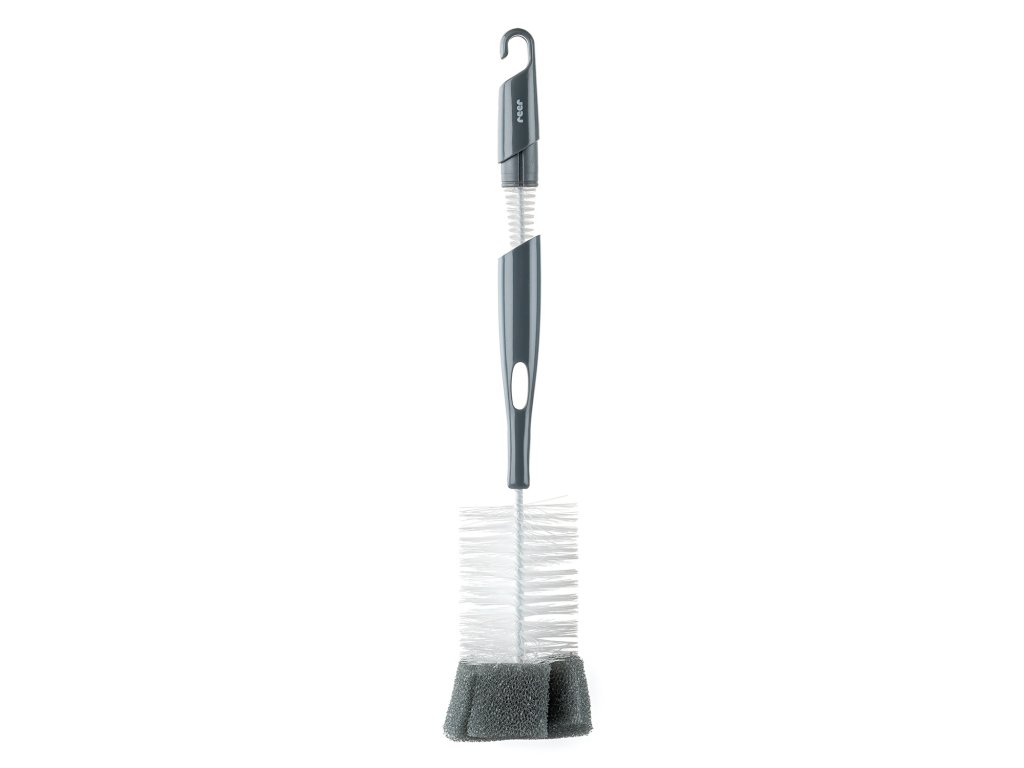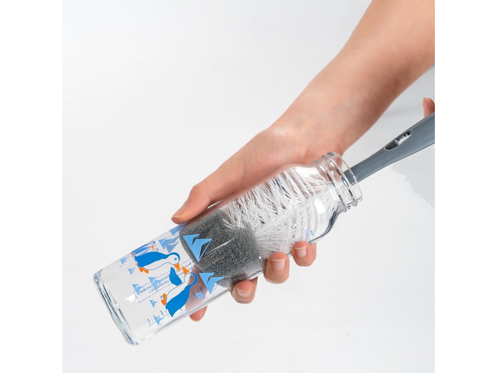 Kartáč na láhve se skládá ze dvou čisticích prvků: houby a rozměrově stabilních nylonových štětin. Houba zajistí pěnění mycího prostředku a přizpůsobí se každému tvaru dna - pro důkladné čištění až do posledního rohu láhve. Odolné, a přesto měkké nylonové štětiny uvolňují i ty nejodolnější zbytky mléka, aniž by láhev poškodily. Extra dlouhá rukojeť umožňuje snadné čištění i hlubokých lahví.