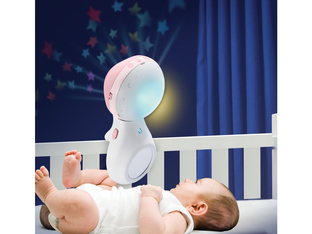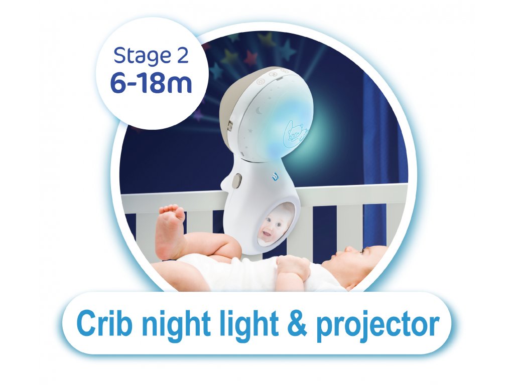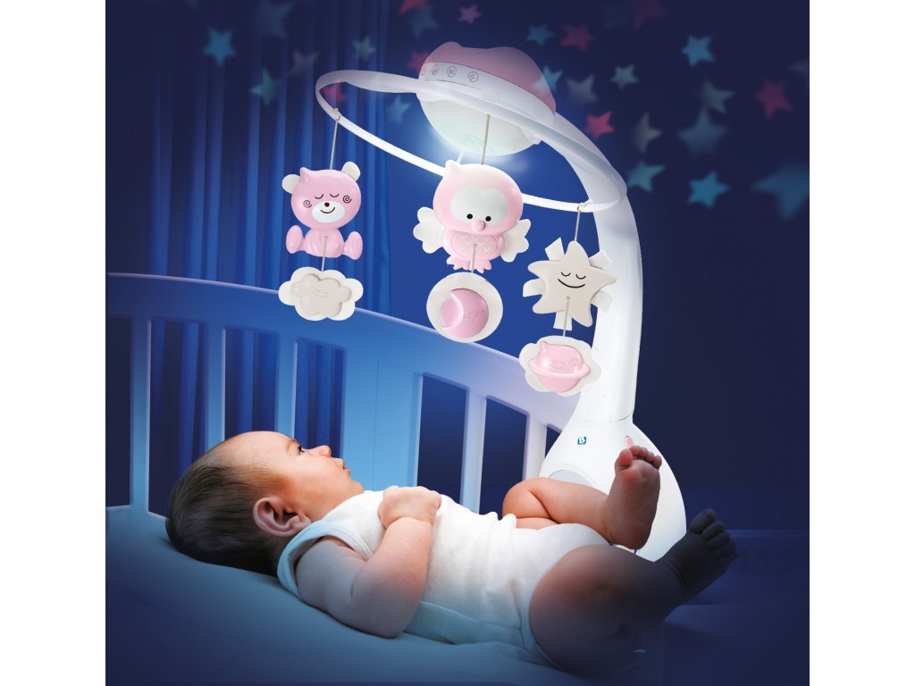 Hudební kolotoč pro snadné usínání i zabavení dítěte nabízí 3 možnosti použití: hudební kolotoč pro děti od narození do 5 měsíců noční světýlko a projektor do postýlky pro děti od 6 do 18 měsíců noční světýlko a projektor na noční stolek pro děti od 18 měsíců Světelný projektor promítá na stěnu či strop hvězdičky a jemně tak osvítí dětský pokoj. Spolu s uklidňující melodií pomůže vašemu dítěti v klidu usínat. Nabízí na výběr z deseti uklidňujících melodií a zvuků přírody. Baterie 3xAAA baterie nejsou součástí výrobku. Vhodné pro děti od narození.Doplňkové parametry