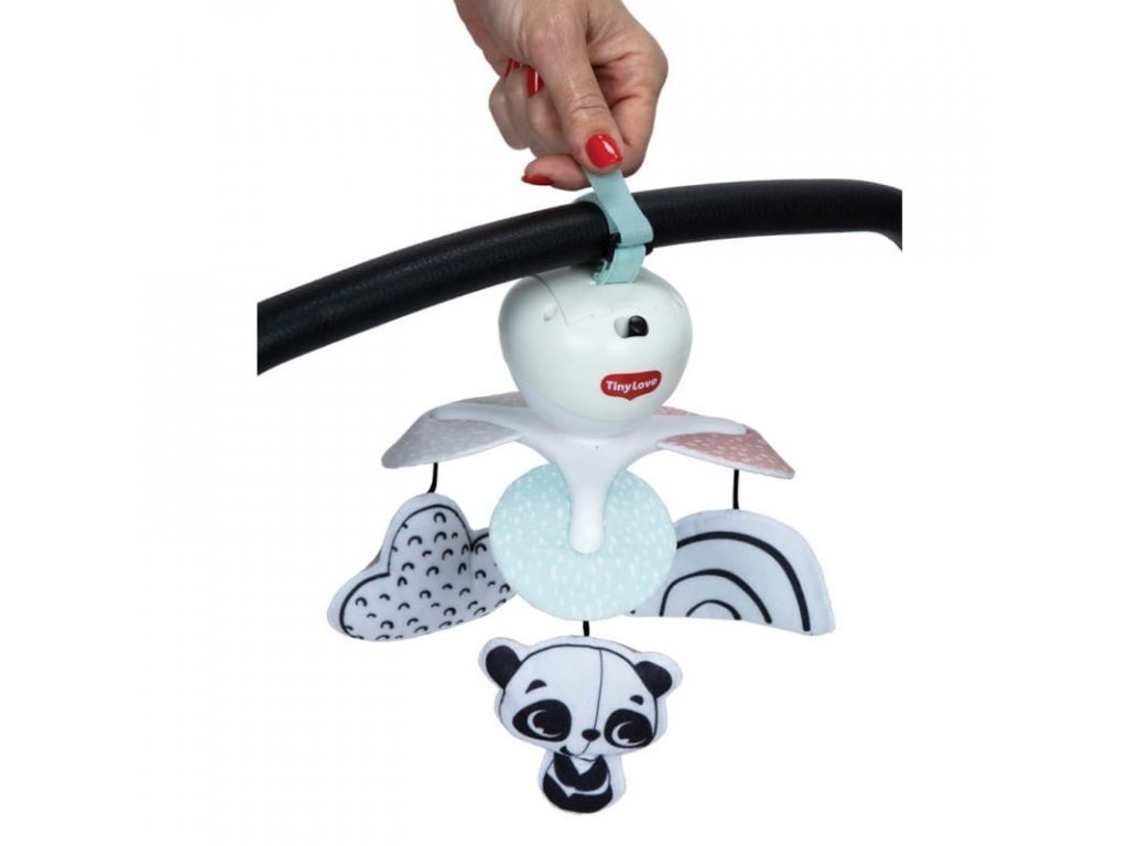 3+ měsíce: Povzbuzující KOMUNIKACE Postavičky rotující na mobilu motivují vaše ratolesti k vrkání a žvatlání, čímž podporují komunikaci. Doplňte to tím, že budete s dítětem mluvit o roztomilých postavičkách pomocí jednoduchých vět: „Podívej, tady je roztomilá panda“, „Oblak je tak měkký!“ atd.