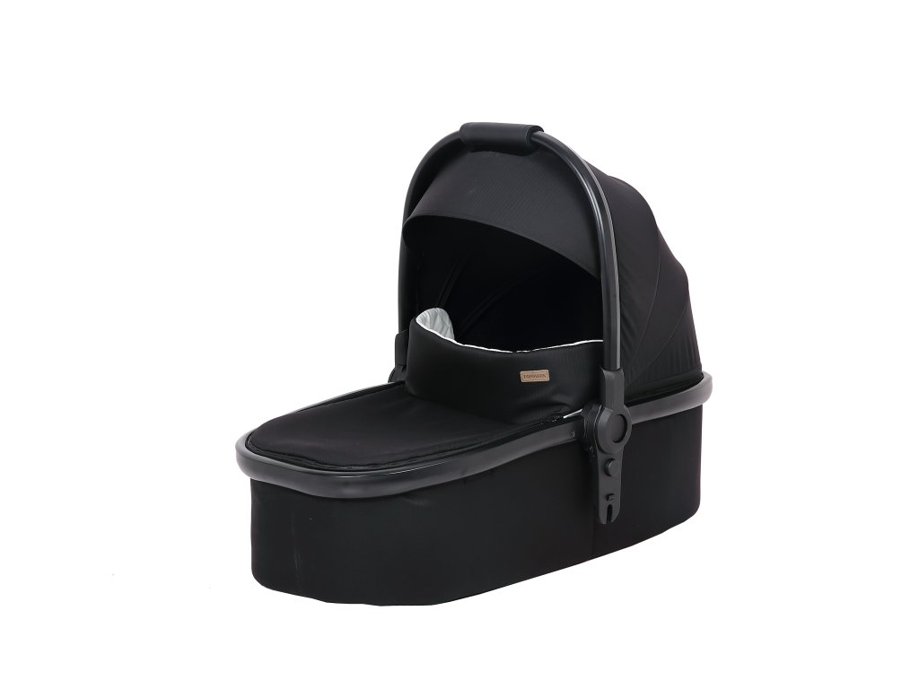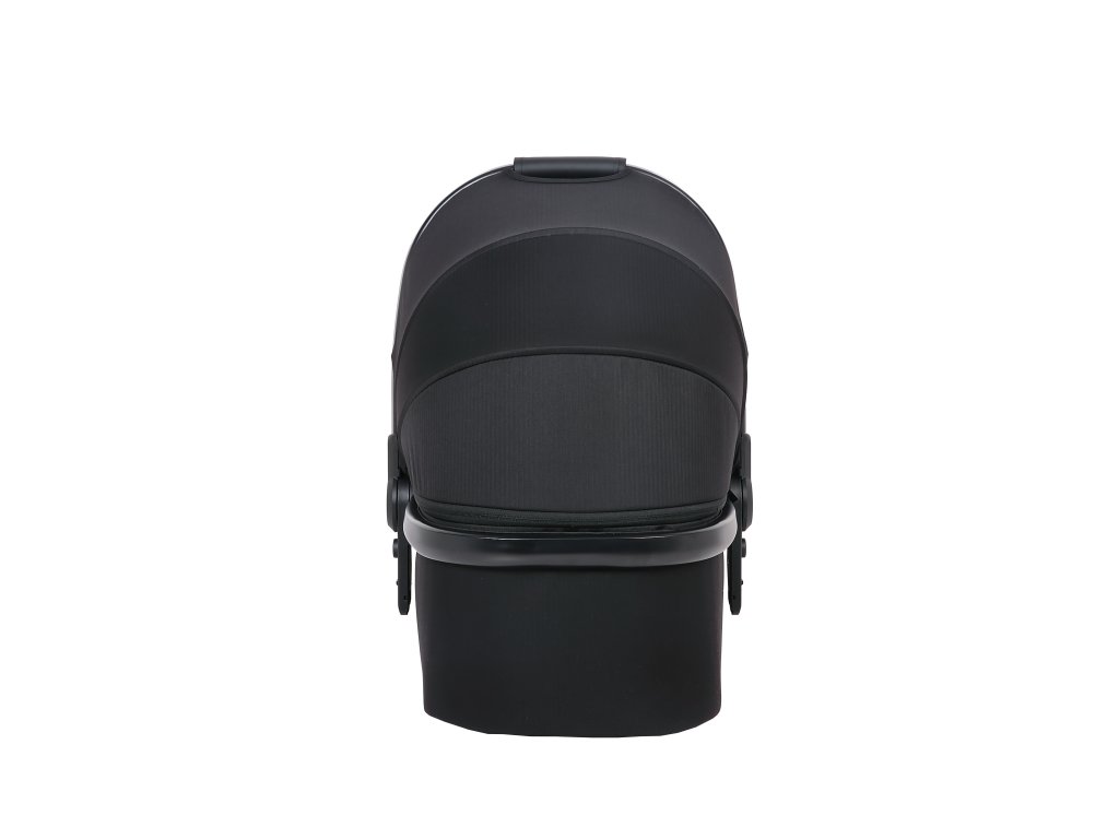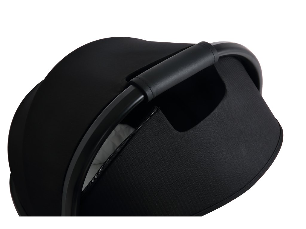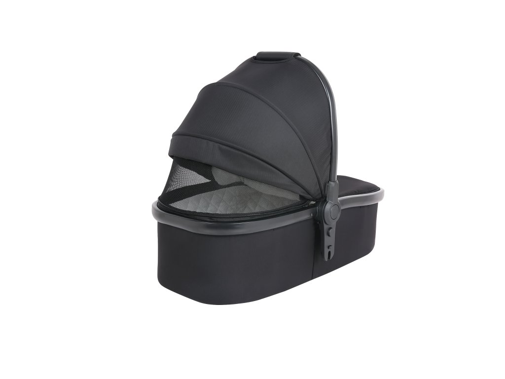 Korbička má hliníkový rám s černou úpravou, 3-dílnou prostornou boudu se slunečným kšiltem.