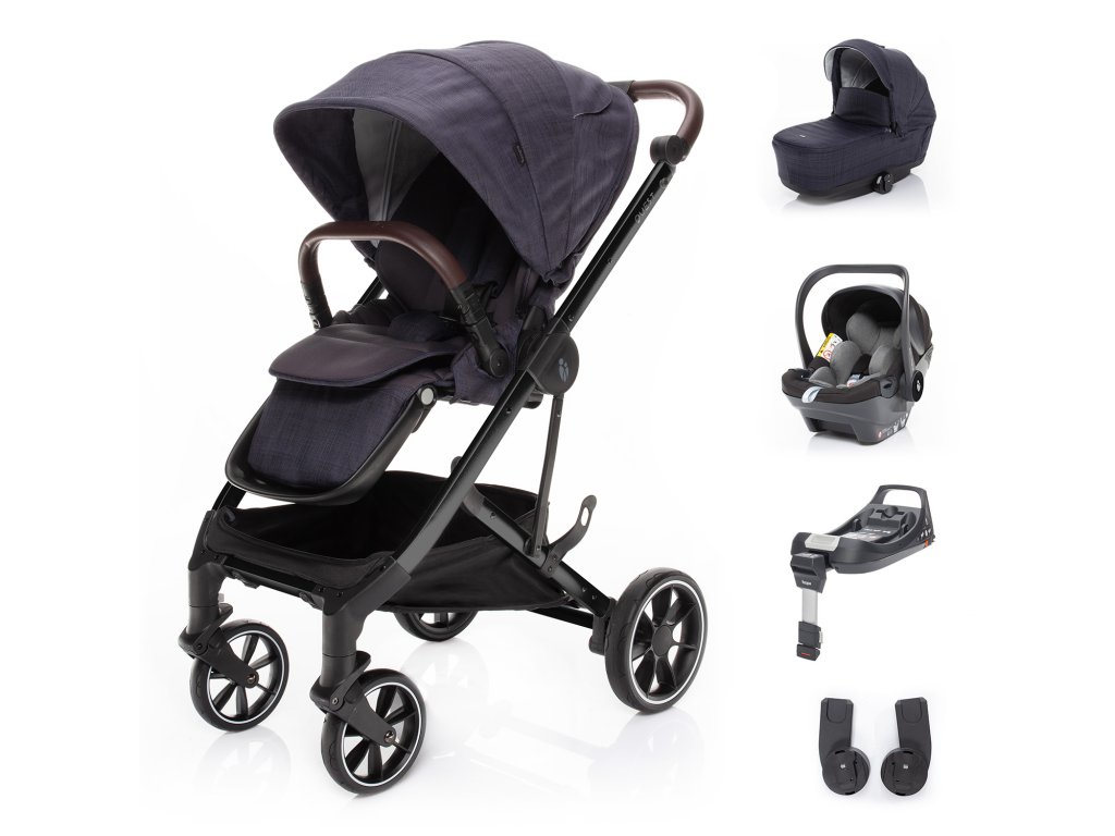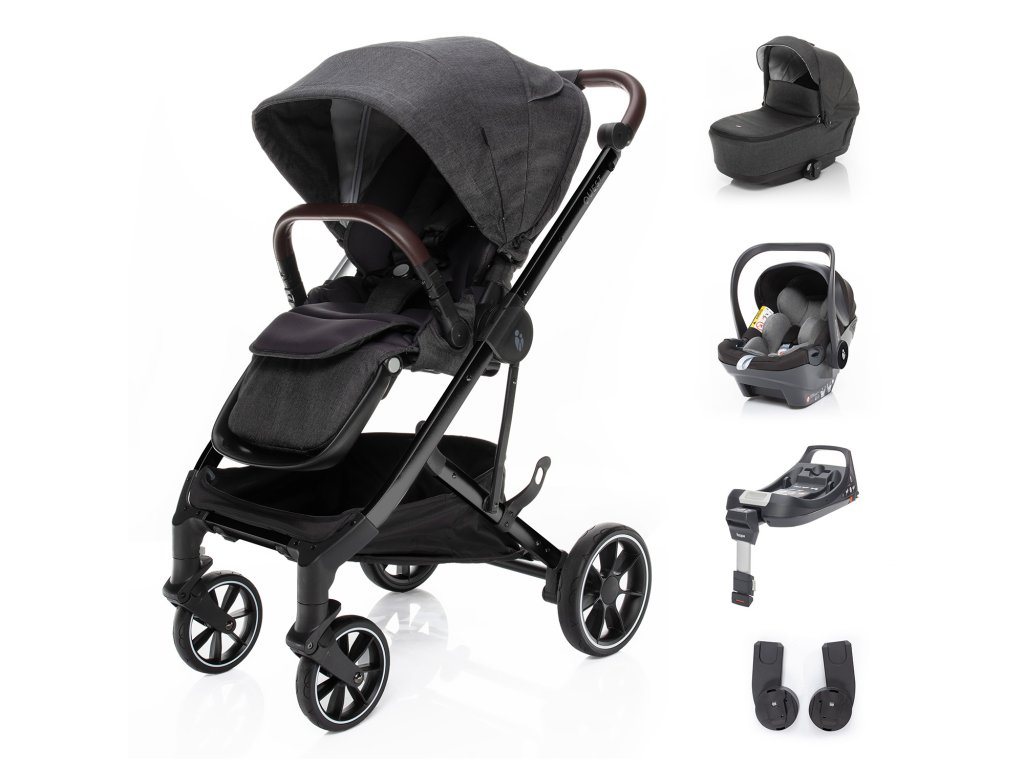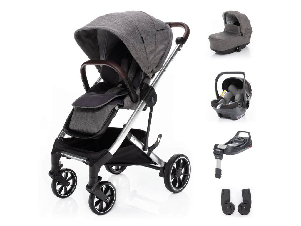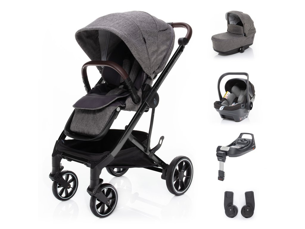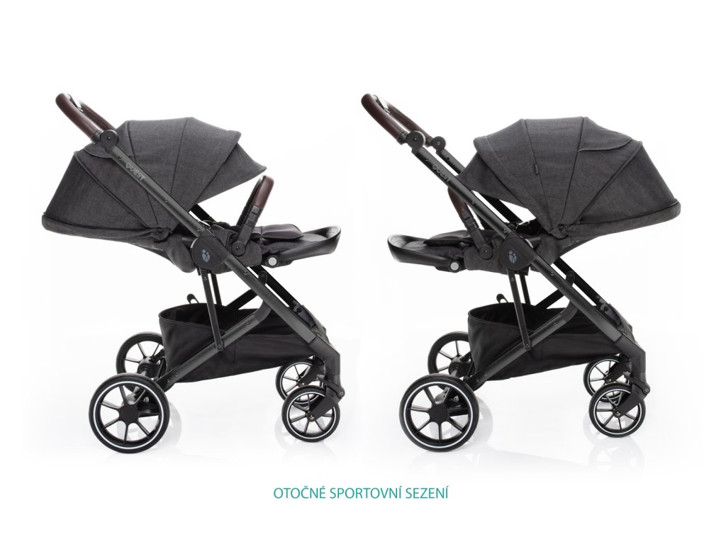 Součástí setu je podvozek se sportovním sezením, hluboká korba, adaptéry, autosedačka a isofixová báze na autosedačku.