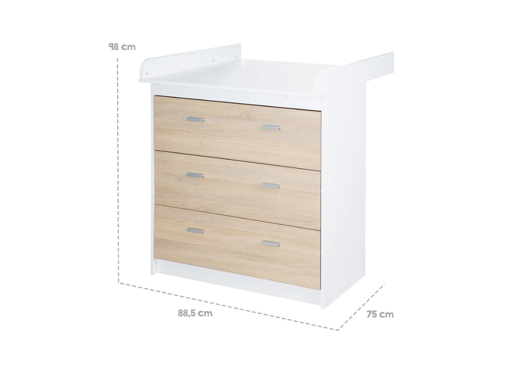 - Přebalovací pult roba se svým dvoubarevným vzhledem v dekoru dub/bílá upoutá pozornost v dětském pokoji.