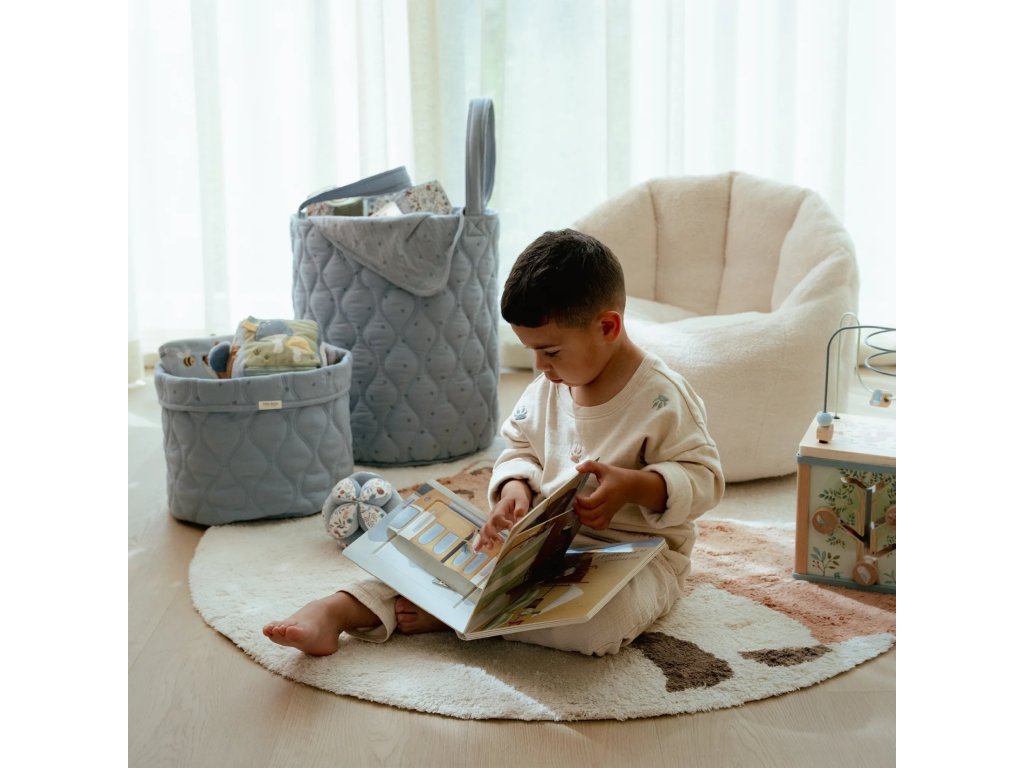 Extra velký úložný košík Little Dutch pomůže udržet dětský pokoj krásně uklizený. Je ideální na hračky, plyšáky, deky apod. a díky svému elegantnímu designu se stane stylovým doplňkem každého interiéru. Oboustranné provedení umožňuje volbu vzhledu košíku dle vašich preferencí. Velkorysý úložný prostor - perfektní pro přehledné ukládání hraček, oblečení či doplňků Pohodlné přenášení - praktické textilní úchyty usnadňují manipulaci a přenášení Měkký a odolný materiál - vyroben z 100% organické bavlny, s prošívanou, polstrovanou strukturou, která působí luxusně a je příjemná na dotek Stylový design - jemný potisk v odstínu modré dodá pokojíčku přirozený a klidný vzhled Univerzální využití - hodí se jako praktický i dekorativní doplněk do dětského pokoje, herny i obývacího pokoje Košík je součástí designové kolekce textilních doplňků Little Dutch Pure. Složení: 100% organická bavlna, výplň 100% polyester Rozměry: 35 x 35 x 45 cm Možno prát v pračce.Doplňkové parametry
