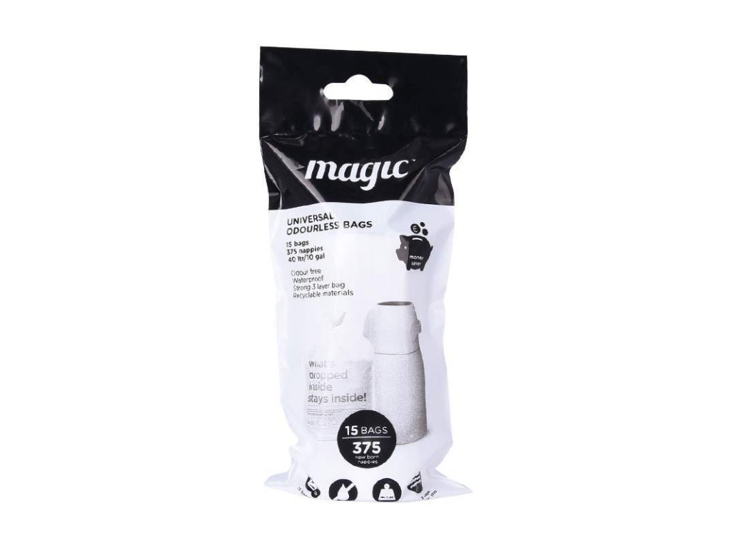 Univerzální sáčky do košů na pleny Magic. 3-vrstvý extra silný materiál brání protékání a chrání před šířením zápachu. Balení obsahuje 15 ks sáčků, vystačí přibližně pro 375 ks plen pro novorozence (počet plen záleží na jejich velikosti). Vyrobeno z recyklovaného materiálu.Doplňkové parametry