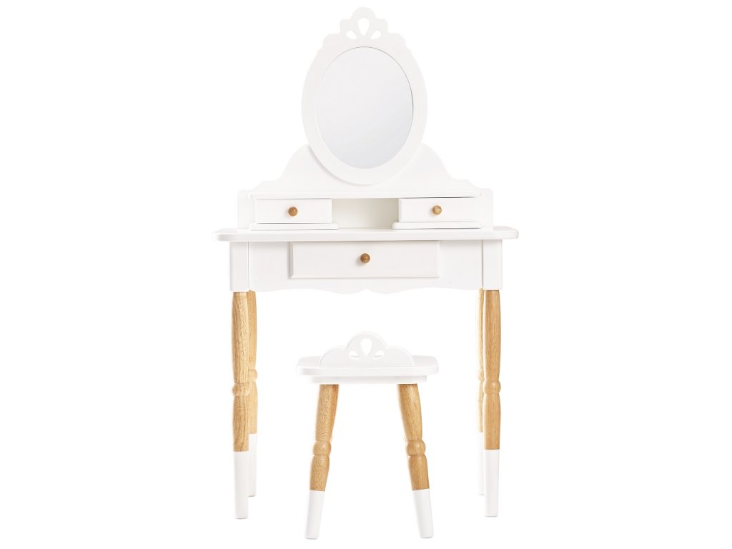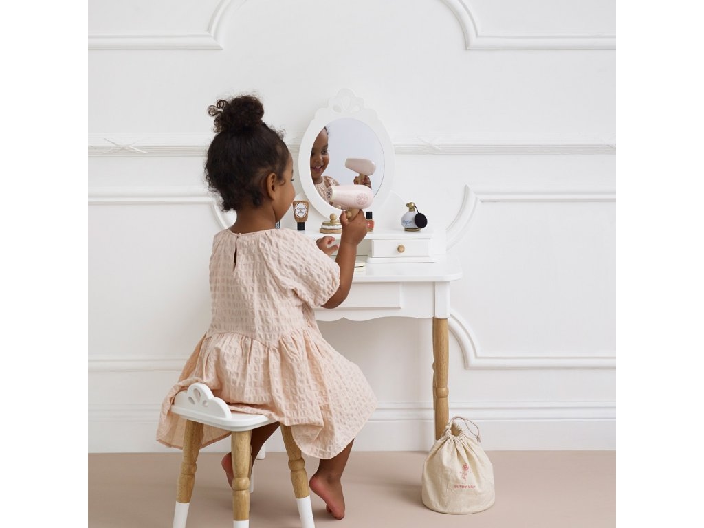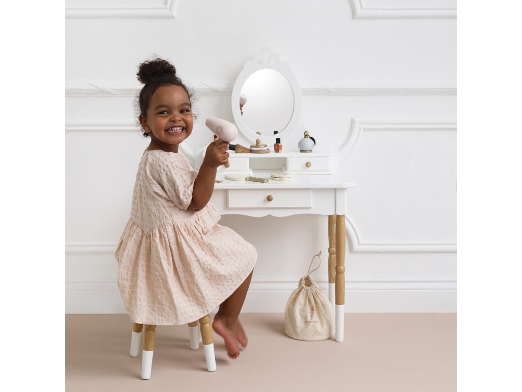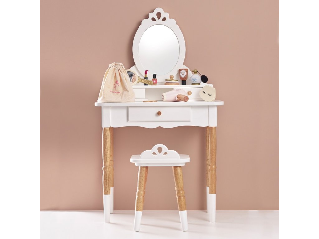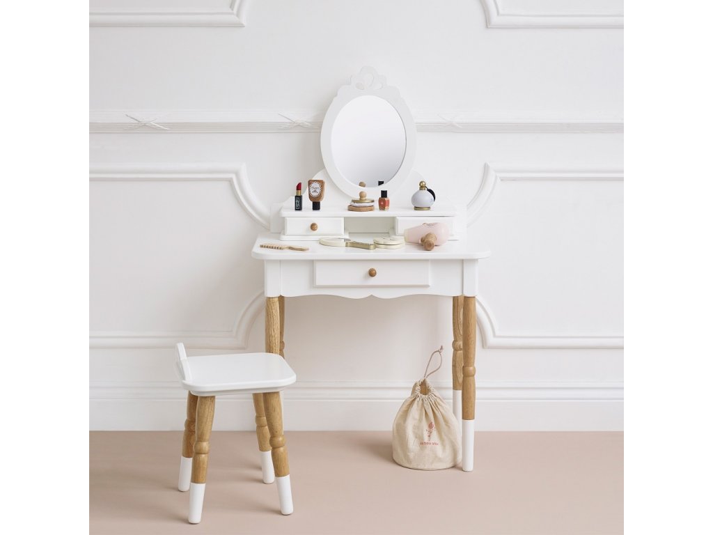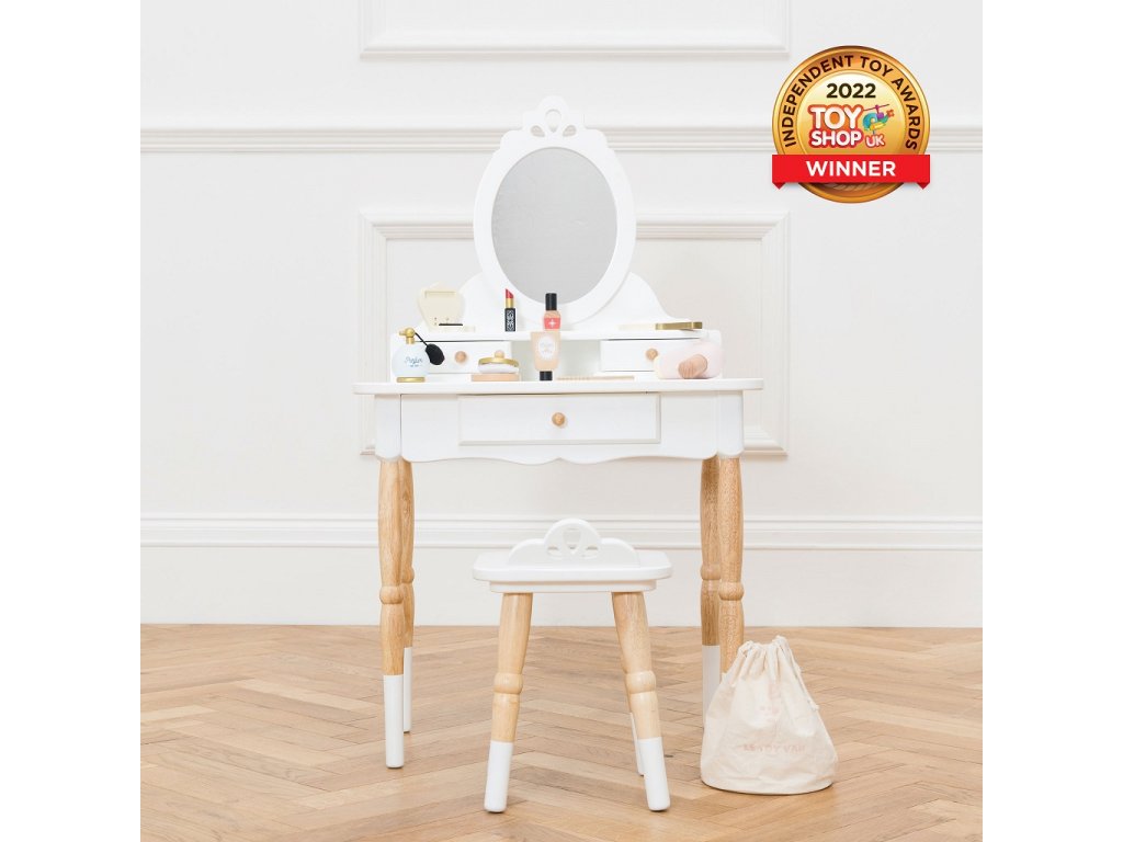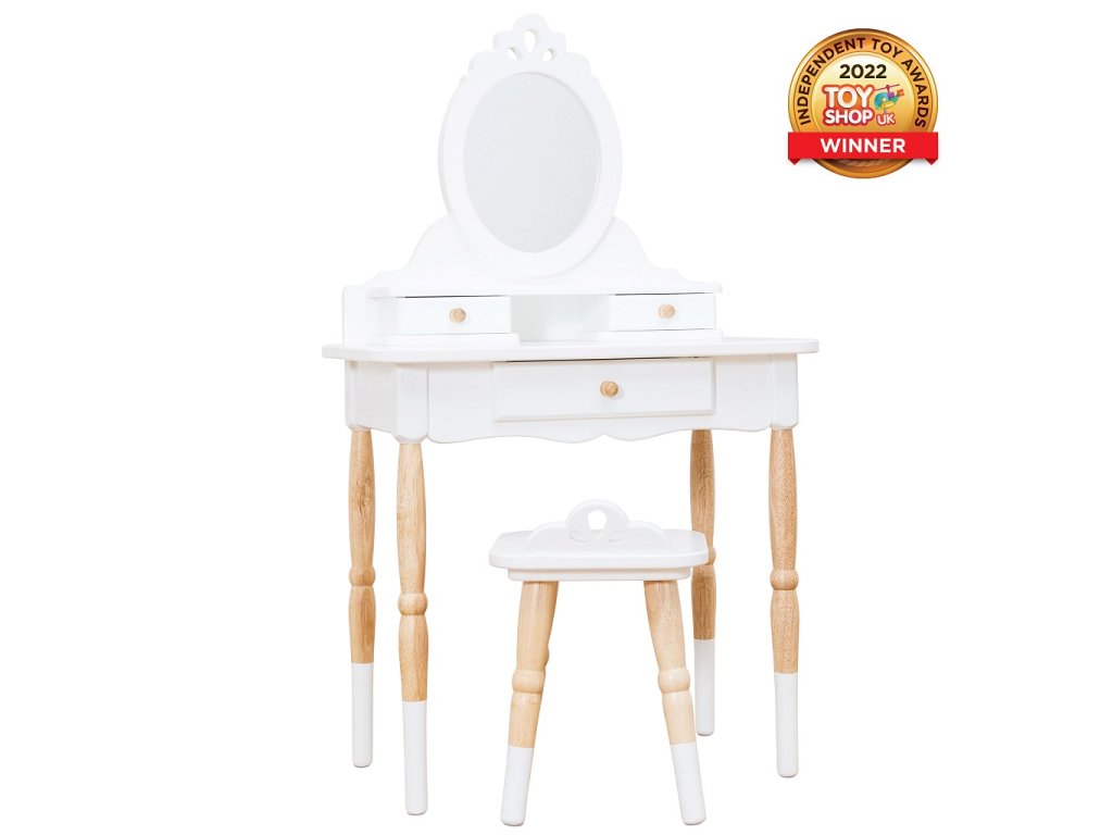 Krásný toaletní stolek v retro stylu, jistě naplní sny nejednoho dítěte. Bude se vyjímat v dětském pokoji nebo herně, je velmi elegantní a při hře opravdu upoutá pozornost dětí. Viktoriánské oválné zrcadlo z prvotřídního, nerozbitného akrylátu, dvoupatrový stolek, 3 šuplíky – perfektní pro skrytí pokladů a cetek. Vyrobeno týmem talentovaných hračkářů za použití udržitelného kaučukového dřeva, krásný kousek je vyroben s důrazem na detaily. Stůl i židle mají nohy zajímavého tvaru. Kombinace bílé a přírodního dřeva pro nadčasový vzhled. Krásný nábytek si můžete předávat z generace na generaci. Hlavní vlastnosti: toaletní stolek s židlípro děti od 3 do 6 letmaximální nosnost 50 kgvyrobeno eticky z udržitelného dřevamalováno netoxickými barvami na bázi vody Ocenění hračky:Independent Toy Gold Award Winner 2022 Honeybake kolekce: Hračky v této kolekci jsou vhodné k objevování, pomohou dětem s rozvojem představivosti, sociálních a verbálních dovedností a kognitivních funkcí. Tradiční design s moderními detaily děti jistě bude bavit. Honeybake je kolekce Le Toy Van, která vyhrála nejvíce ocenění, a to za design, kvalitu, bezpečnost a také za vzdělávací a herní hodnotu.Sizing info