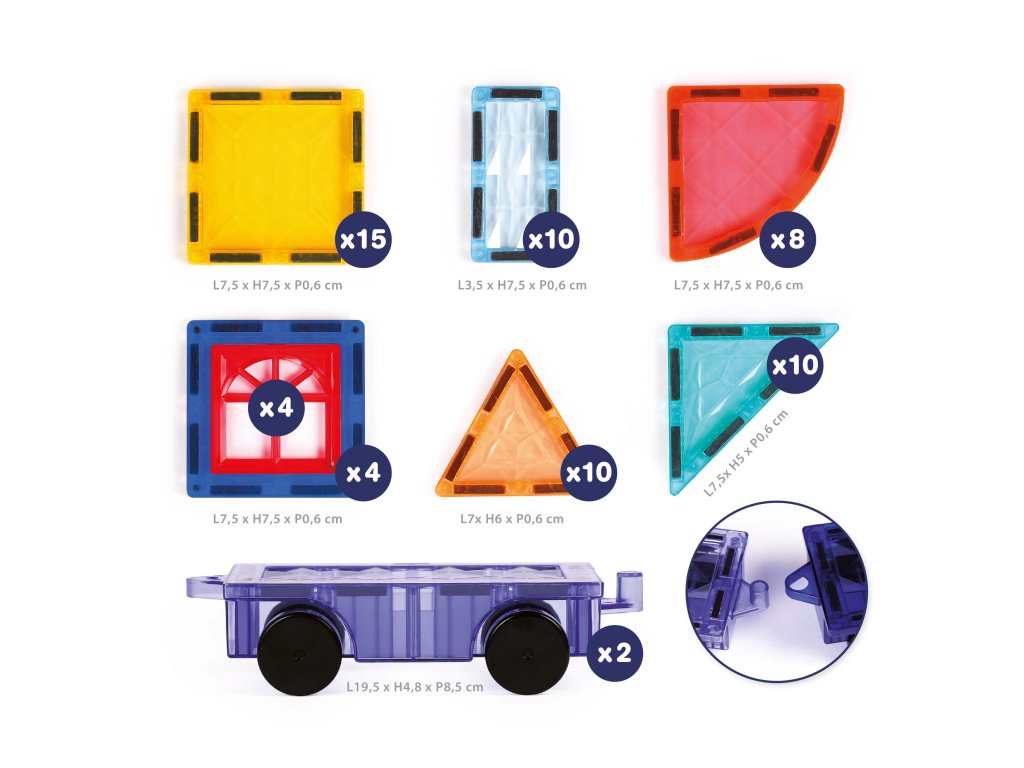 Objevte svět plný pohybu a fantazie s magnetickou stavebnicí Ludi! Praktický plastový box s držadlem ukrývá 63 magnetických dílků, mezi nimiž jsou i 2 podvozky s kolečky, díky kterým mohou děti stavět vlastní auta, náklaďáky nebo třeba pohyblivé stavební stroje. Děti mohou kombinovat různé části a vytvářet nekonečné množství vozidel a stavebních struktur. Každý dílek má integrované magnety po stranách, takže není potřeba žádné klipy ani složité zámky Dílky k sobě přilnou okamžitě, což umožňuje i menším dětem samostatně stavět vlastní výtvory Rozmanité barvy a tvary pro neomezené možnosti Podporuje logické myšlení díky zkoumání magnetických spojů Rozvíjí jemnou motoriku při manipulaci s jednotlivými dílky Podněcuje kreativitu prostřednictvím nekonečného množství kombinací a konstrukcí Perfektní dárek pro malé stavitele a tvořivé duše Všechny díly lze po skončení hry jednoduše uložit do průhledného boxu s držadlem, ideálního na cesty nebo pro přehledné uskladnění doma. Materiál: průhledný ABS plast s magnetickými spoji Vhodné pro děti od 3 let.Doplňkové parametry