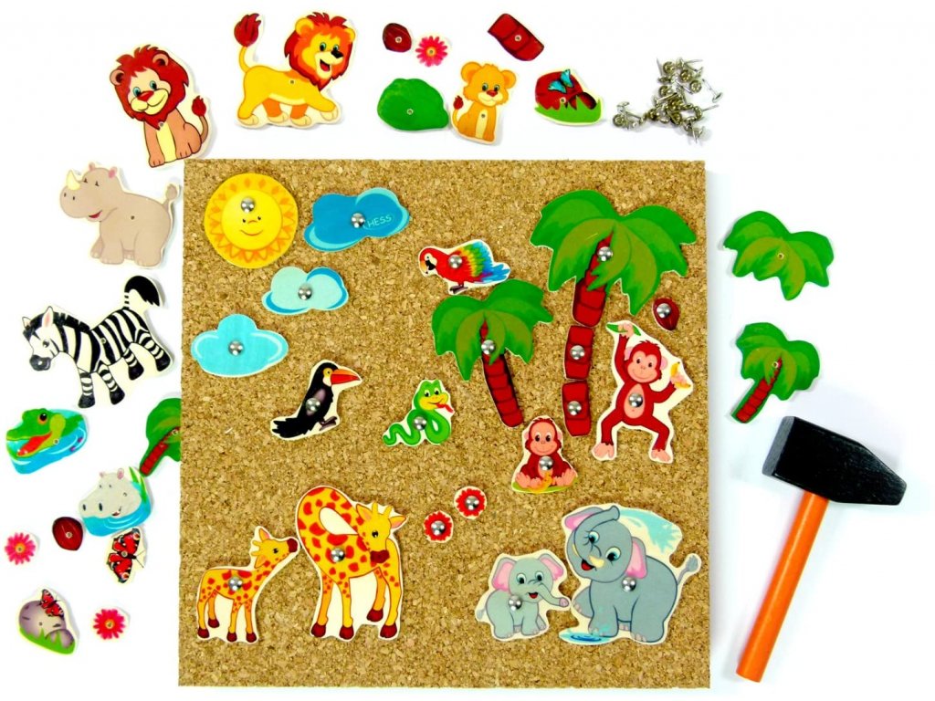 S touto zatloukací hrou se nebudete nudit. Použité barvy a tvary stimulují představivost. Tvořte rozmanité obrazy a cvičte jemnou motoriku Vašeho dítěte. Součástí sady jsou tvarové dílky z tištěné překližky, dřevěné kladívko, korková podložka a 50 ks hřebíčků s velkou půlkulatou hlavičkou. Hlavní vlastnosti: kompletní sada bezprostředně připravená ke hřevyrobeno eticky z ekologicky obhospodařovaných lesůpoužity ekologické a odolné barvySizing info