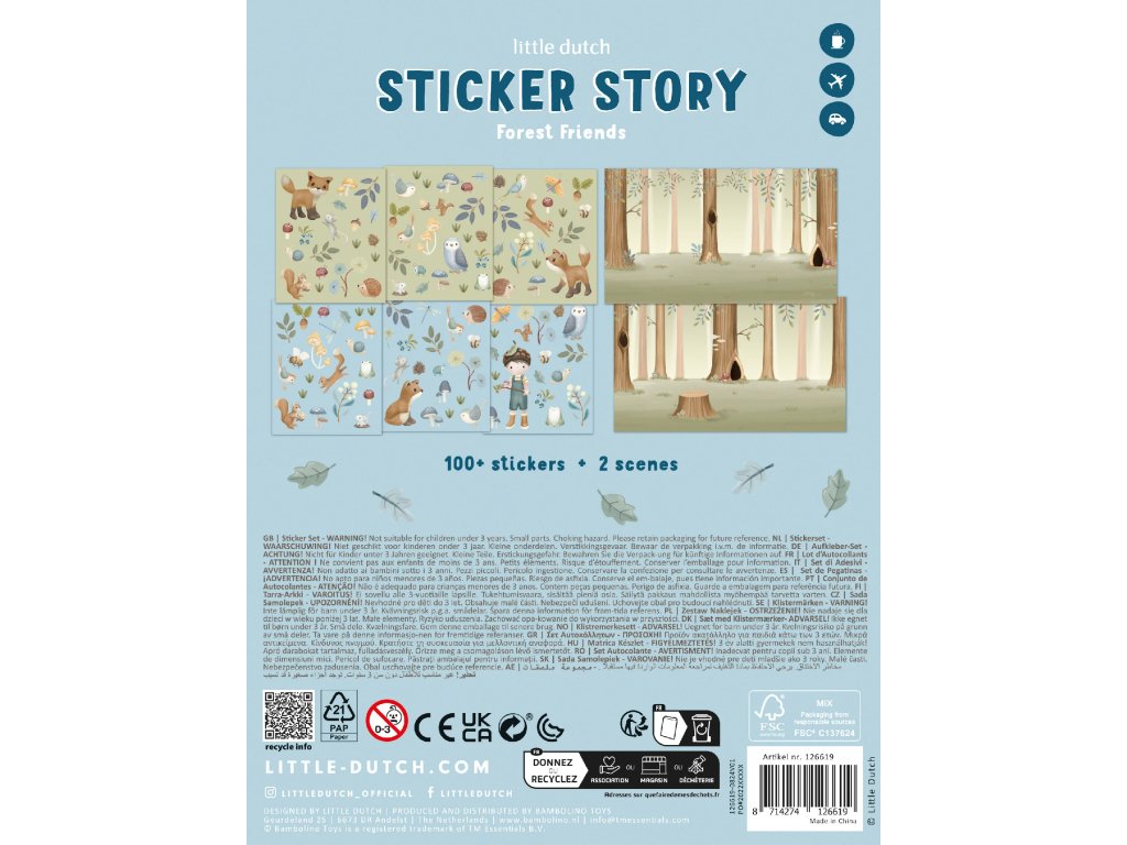 Sada šesti archů krásných samolepek z kolekce Little Dutch Forest Friends s krásnými motivy ze života v lese. Samolepky jsou vhodné pro lepení na papír. Balení obsahuje více než 100 papírových samolepek na šesti arších a dva obrázky, které je možné využít jako pozadí vlastního originálního obrazu se samolepkami. Sada je součástí designové kolekce hraček a doplňků Little Dutch Forest Friends inspirované životem v lese. Rozměry: 19,5 x 12,5 x 0,5 cm Vhodné pro děti od 3 let.Doplňkové parametry