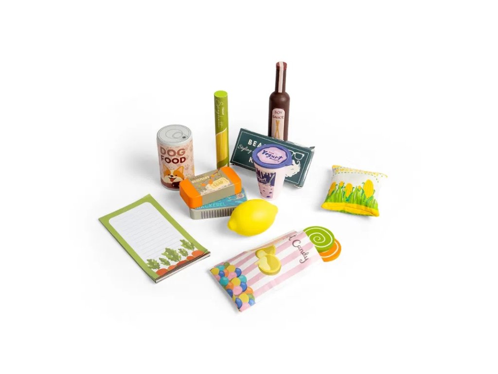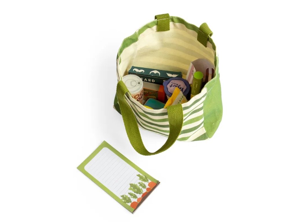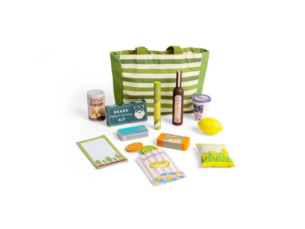 Na nákupním seznamu je tento týden několik základních položek, které nesmí chybět v žádné domácnosti. Uvnitř pruhované tašky najdete špagety, sojovou omáčku, makrelu, kukuřici, jogurt, citrón, psí žrádlo, balíček se sladkostma, pomerančové a rozmarýnové mýdlo a sadu na úpravu vousů. Nechybí také poznámkový blok, do kterého si děti mohou napsat vlastní nákupní seznam. Ponořte se do role zákazníka nebo obchodníka a rozvíjejte si základní životní dovednosti jako je zlepšení slovní zásoby, komunikace, kreativity, seběvědomí a sociální inteligence. Vyrobeno z materiálů z prvotřídní kvality a barveno netoxickými laky a barvami. Splňuje všechny aktuální evropské bezpečnostní normy. Hlavní vlastnosti: ideální pro hru na obchod17 hracích příslušenstvívyrobeno z materiálů prémiové kvalitySizing info