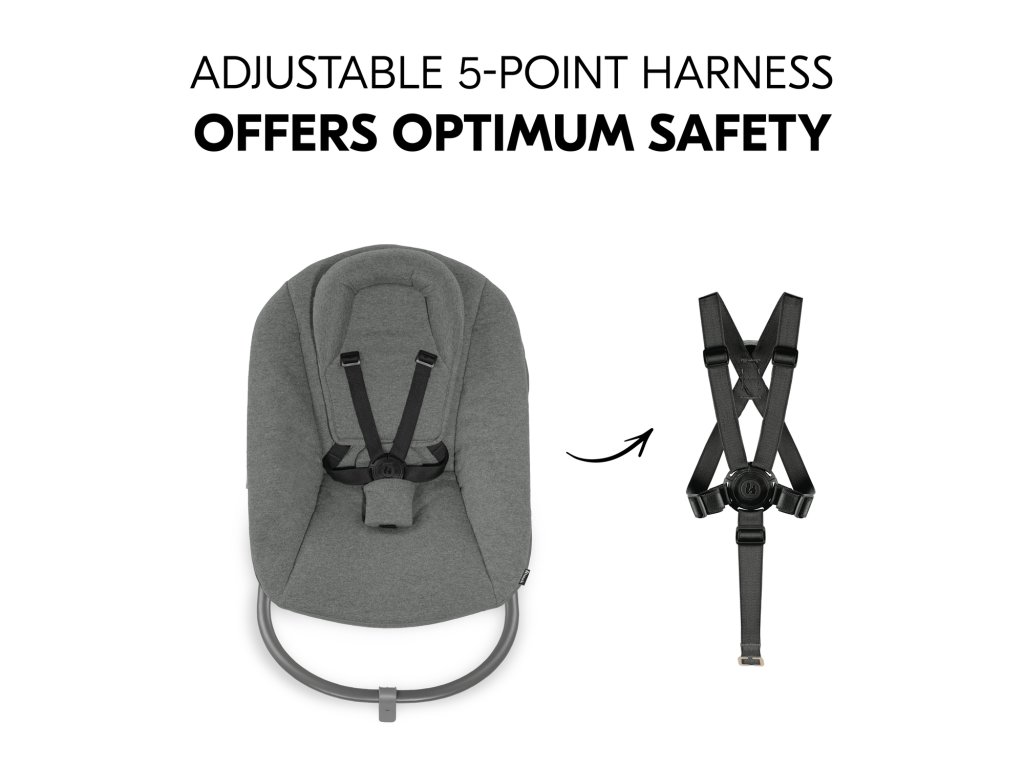 NASTAVITELNÝ A BEZPEČNÝ // Součástí křesílka je 5bodový bezpečnostní pás, který je možné nastavit podle tělíčka vašeho dítěte. Tak ať už máte doma malého neposedu, nebo vaše děťátko odpočívá, bude vždy v bezpečí.