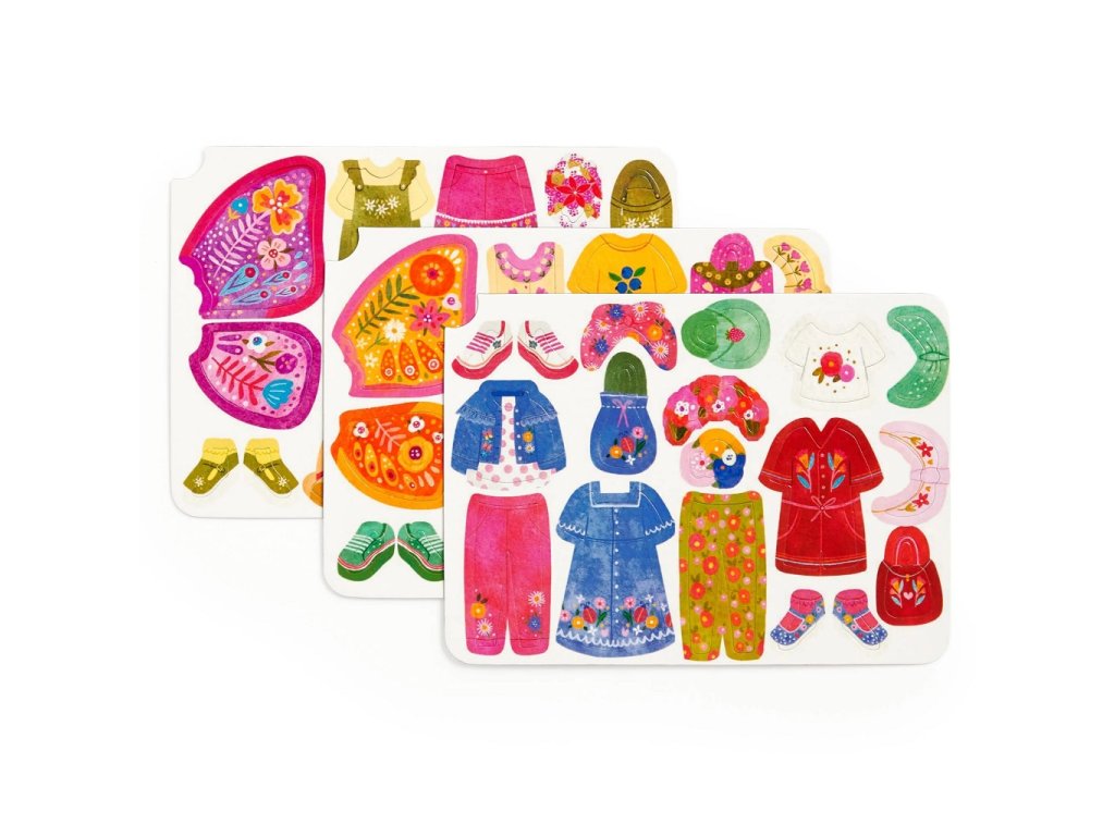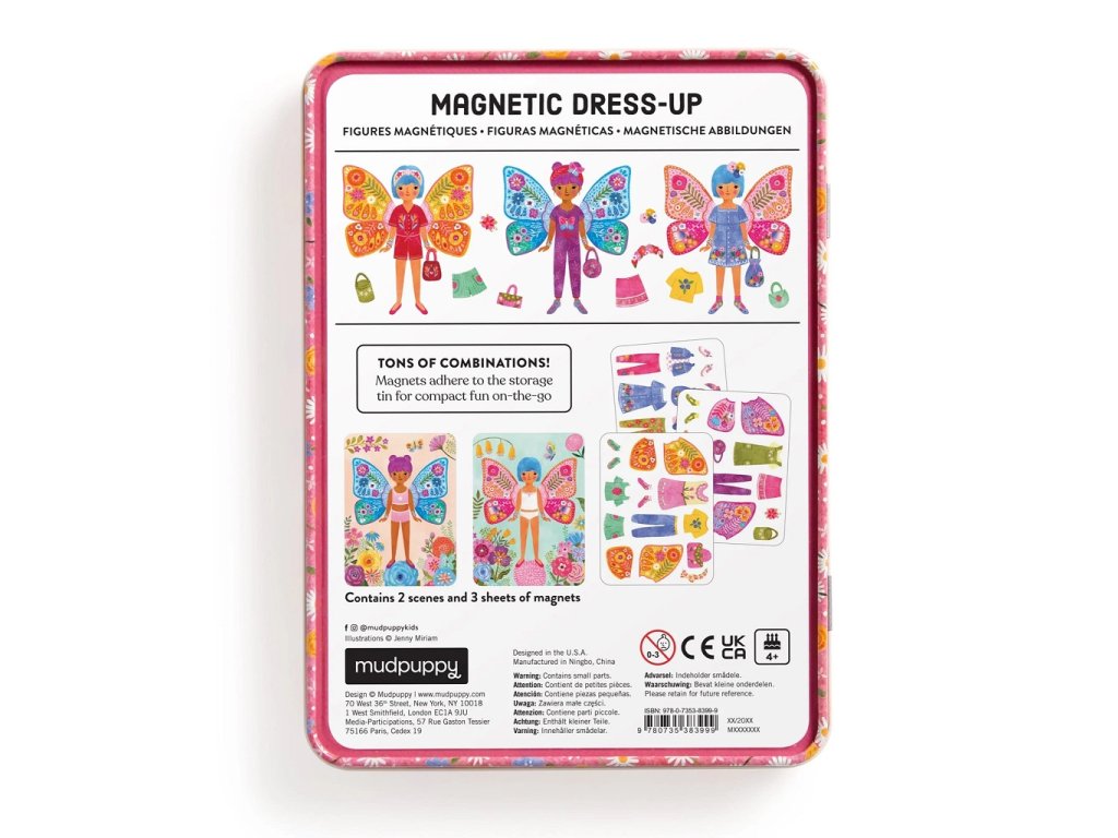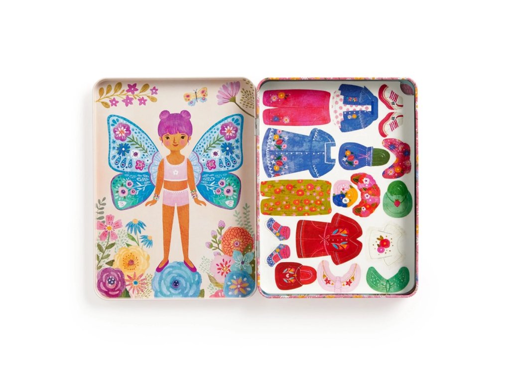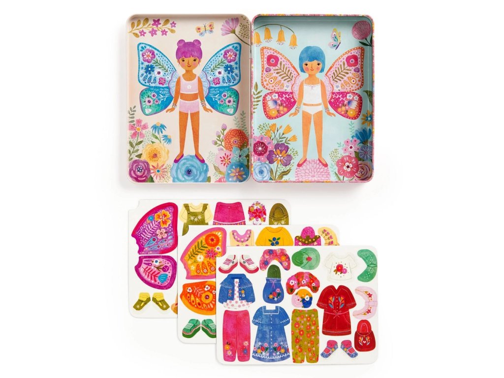 Ponořte se do světa módy s touto magnetickou sadou, která byla navržená k tomu, aby inspirovala děti ke kreativitě. Prozkoumejte svůj smysl pro styl a představivost a nakombinujte oblečení dle své vlastní fantazie. Hra obsahuje 2 ilustrované scény na pozadí, v každé části je jedna motýlí slečna, která čeká na své oblečení. K dispozici je na 3 kartách více než 40 magnetů s oblečením či motýlími křídly. Kombinujte vše dle svých představ. Vhodné na doma i na cesty. Hlavní vlastnosti: praktická kovová krabičkavíce než 40 magnetů na 3 kartách2 ilustrované scény pozadí se 2 postavamisada vhodná pro hru na cestáchSizing info