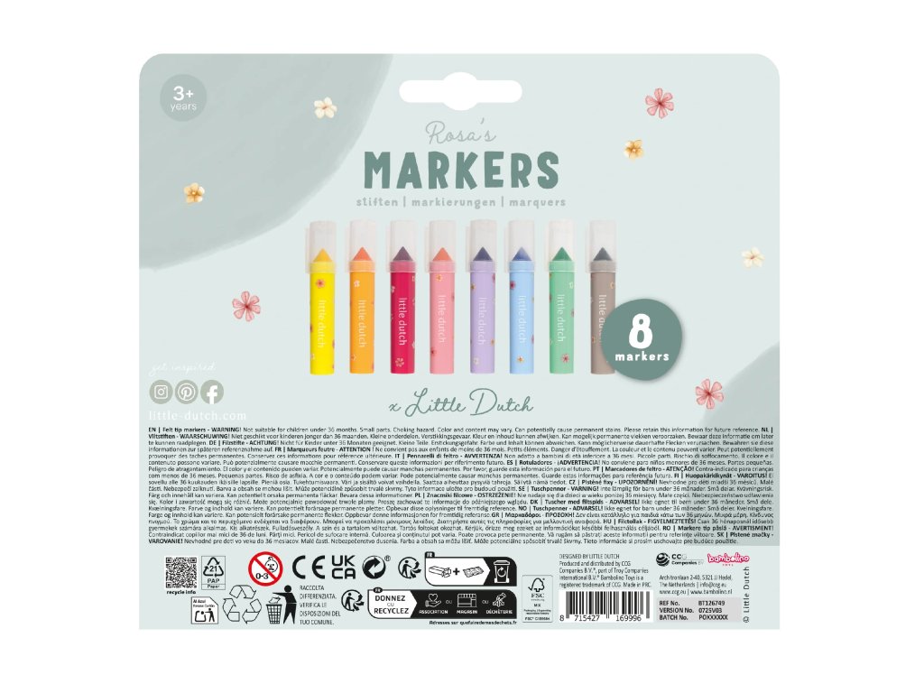 Nechte své dítě tvořit ty nejkrásnější obrázky s touto Little Dutch sadou 8 krátkých silnějších fixů v jemných odstínech. Jsou ideální pro malé dětské ruce, které teprve objevují radost z kreslení a vybarvování. Fixy podporují kreativitu, rozvíjejí jemnou motoriku a díky svým silnému provedení se snadno drží. Perfektní pro hodiny společného tvoření, hraní si s barvami a objevování fantazie. Skvěle ladí s ostatními výtvarnými doplňky Little Dutch. Vhodné pro děti od 3 let.Doplňkové parametry