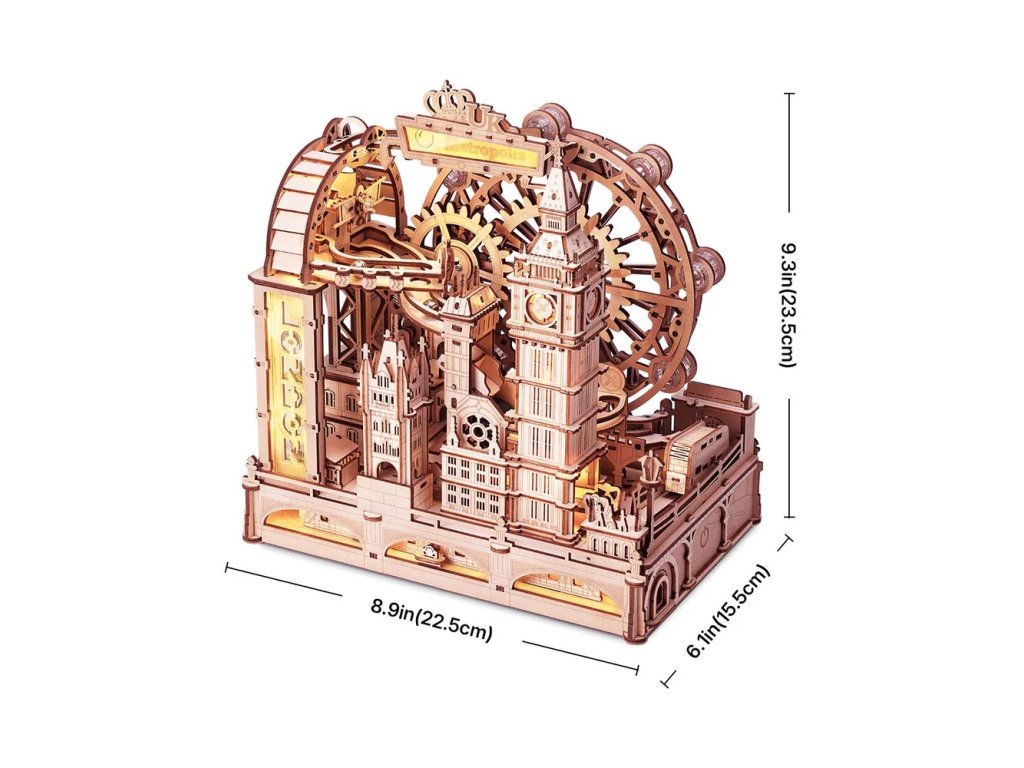 Připravte se na dynamickou prohlídku britské metropole, aniž byste museli opustit svůj pokoj, s tímto mechanickým zázrakem - 3D dřevěnou skládačkou a kuličkovou dráhou Londýn. Tento detailně zpracovaný model vás provede ikonickými londýnskými památkami díky preciznímu inženýrství a promyšlené mechanice. Během stavby i následného provozu se setkáte s miniaturami Big Benu, Tower Bridge či London Eye. Překročíte Temži, nastoupíte do dvoupatrového autobusu nebo metra a během okamžiku dorazíte do cíle, zatímco kovové kuličky sviští rampami, spirálami a tunely, poháněné kombinací gravitace a vestavěného USB-C motoru. Nechybí ani hravé detaily, včetně korunovačních klenotů, které se objeví bez rizika spuštění královského alarmu. Stavebnice obsahuje 431 precizně laserem vyřezaných dílů, které do sebe přesně zapadají a zaručují uspokojivou a obohacující stavbu. Po sestavení se model promění v plynule fungující kuličkovou dráhu, která je nejen zábavná, ale také působí jako originální mechanická dekorace. Hra je živá a nepřetržitá - na čaj se zastavíte až ve chvíli, kdy dráhu vypnete. Do té doby si můžete Londýn projet znovu a znovu, pokaždé z jiného úhlu. Hlavní vlastnosti: 431 přesných dílkůdoba sestavení 5 hodintěžká úroveň obtížnostibez použití lepidlarozvíjí logické a motorické dovednostipodporuje trpělivostLED osvětleník napájení slouží USB-C kabel, není součástí baleníobsahuje podrobný návod k sestaveníSizing info
