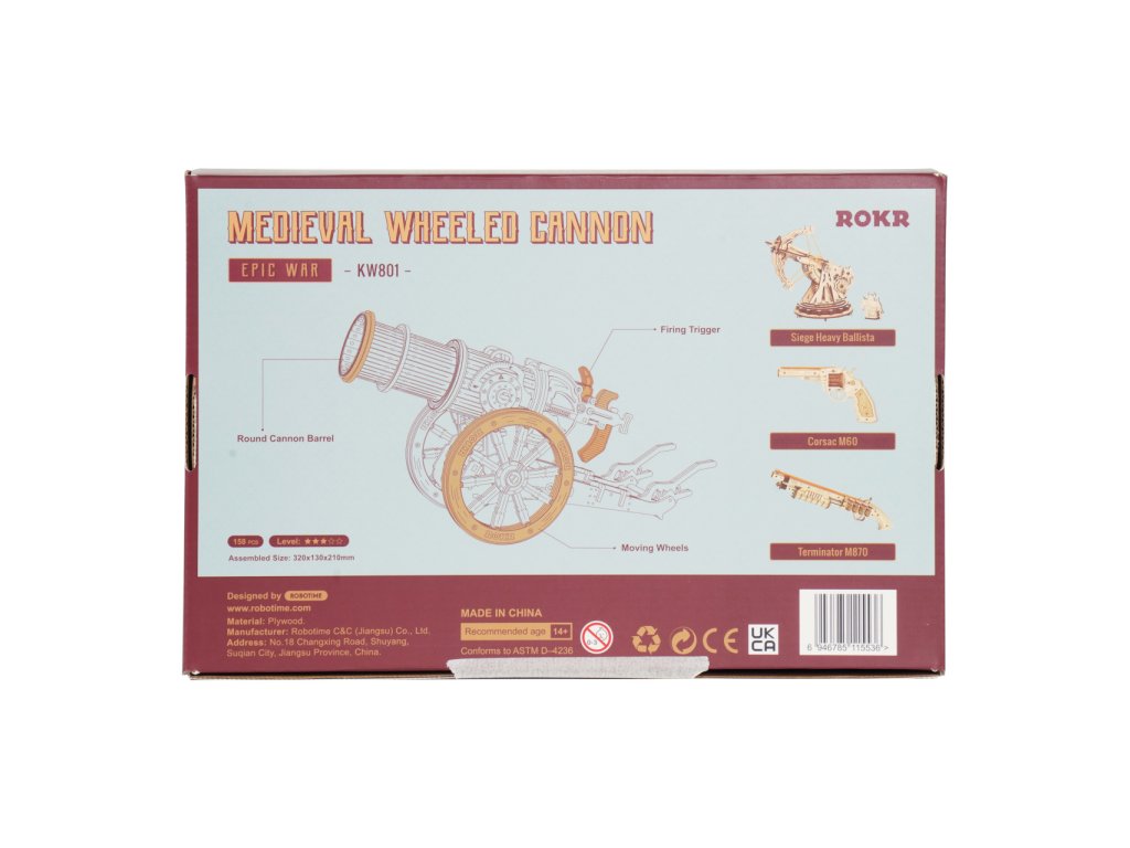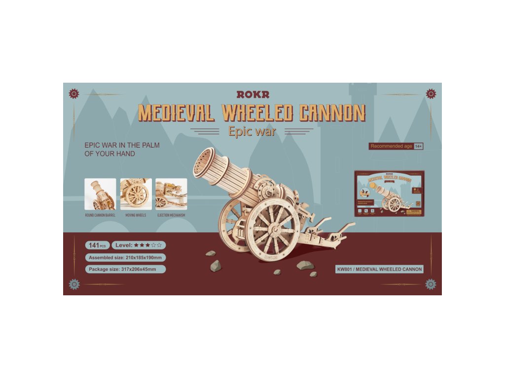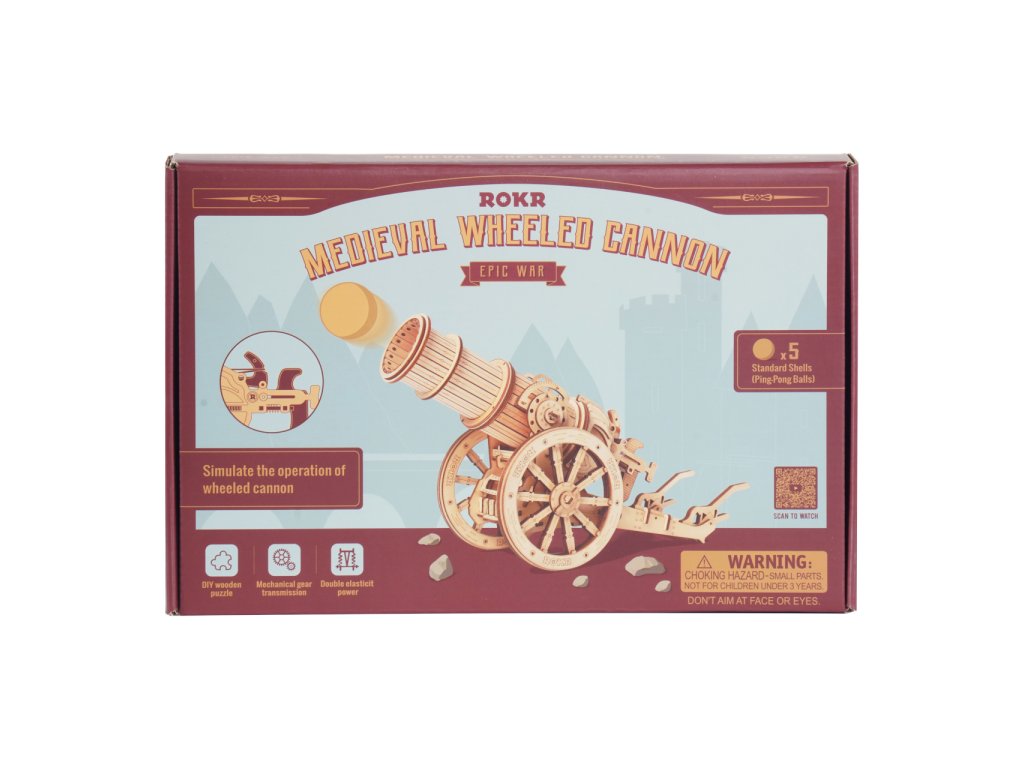 Staňte se slavnými dobyvateli prostřednictvím řady mechanických skládaček obléhacích strojů Robotime. Zakuste výzvu při jejich stavbě, procvičujte logiku i zručnost, a s pomocí hotových modelů pak uspořádejte ty nejpamátnější bitvy! Skvělý dárek pro všechny fanoušky válečných her, vojenství a historie! Obléhací kanón se může pyšnit mnoha atraktivními detaily věrně odrážejícími středověké zbraně. Jeho rozměrná hlaveň je přizpůsobena ke střelbě pingpongových míčků, což z něj dělá zvláště univerzální hračku. Mechanismus střelby je ručně natahován a je opatřen spouští, úhel odpalu je možno volně nastavit. Díky velkým kolům lze kanón snadno přemístit, a přizpůsobit tak situaci na bojišti. Skládačka je dodávána v nesloženém stavu, balena v krabici. Vybaveno detailním návodem k sestavení. Hlavní vlastnosti:158 precizně vyřezaných dílkůstřední obtížnost sestavenívýsledný model je schopen střelby pingpongových míčkůSizing info