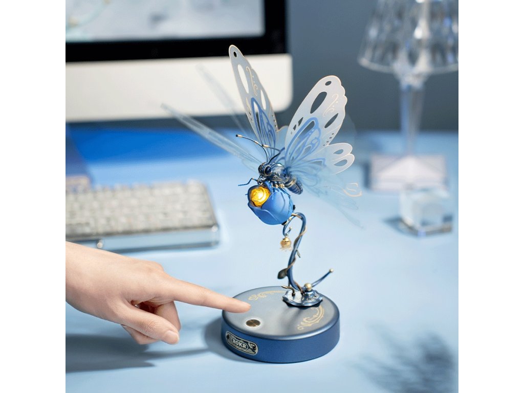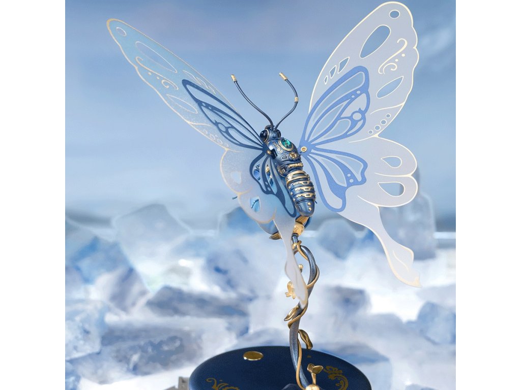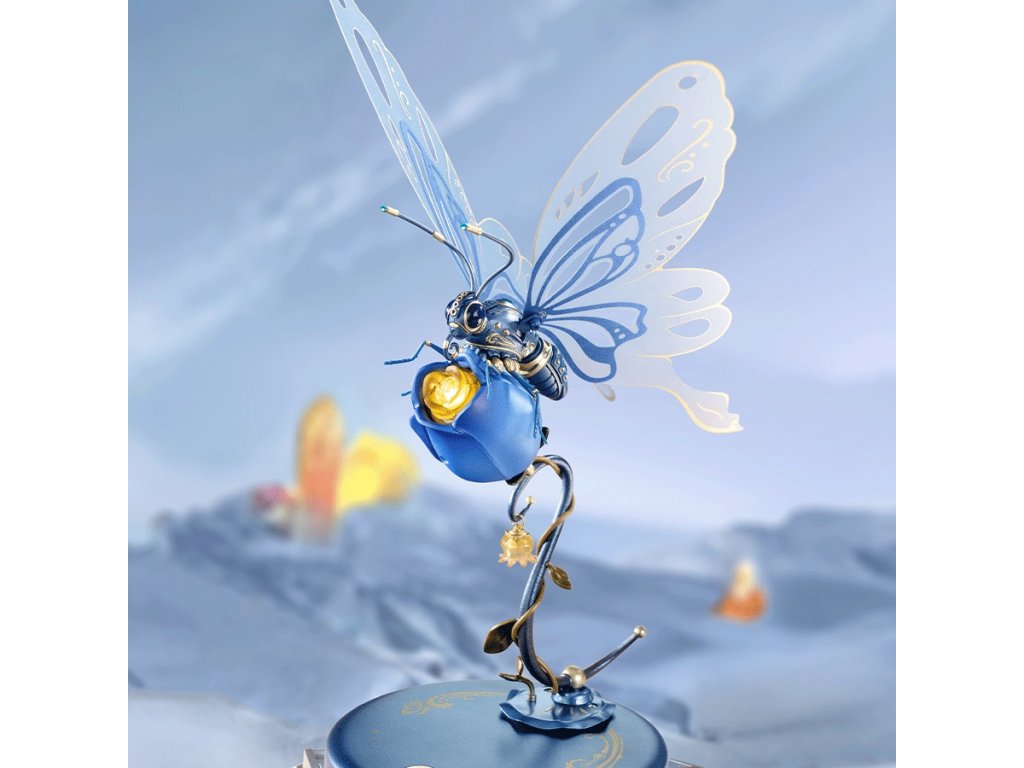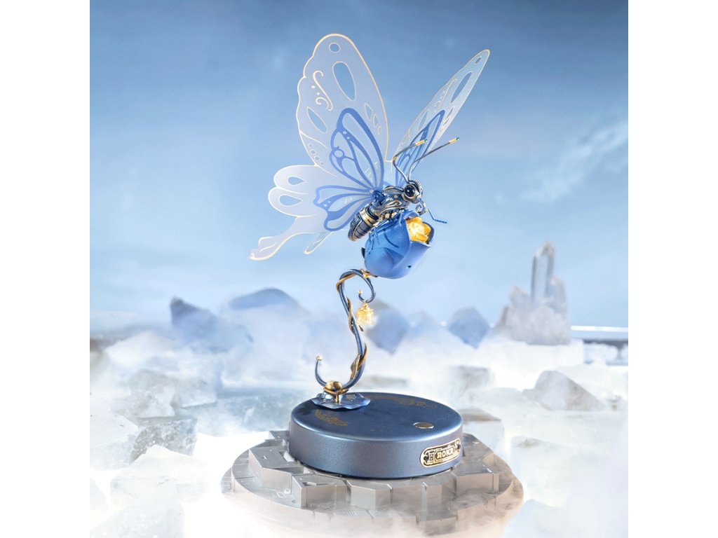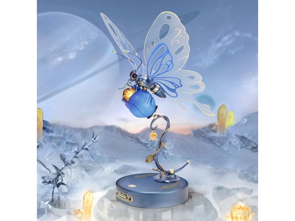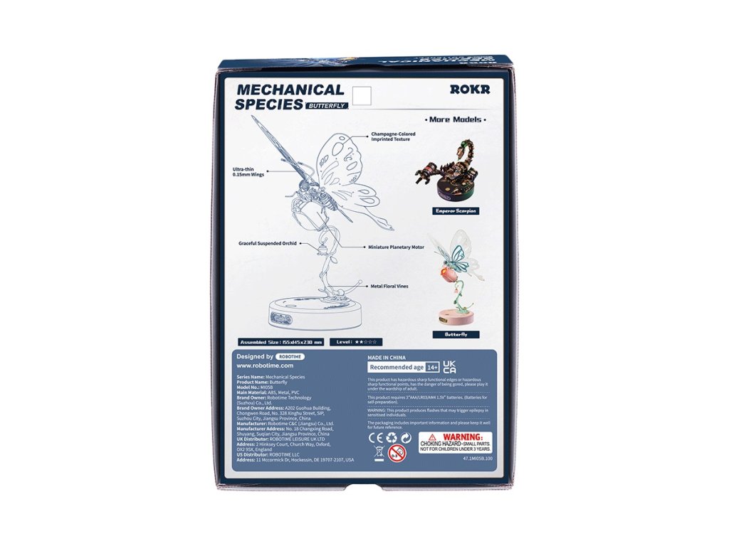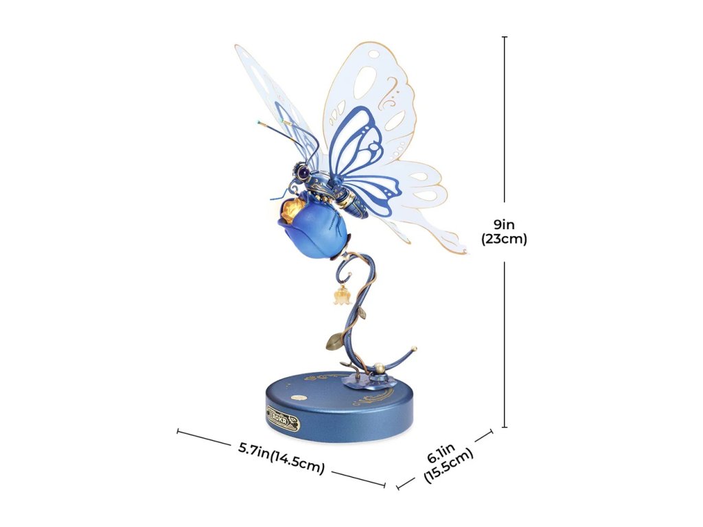Příroda je plná tajemství a krásy. Detailně propracovaný mechanický motýl je navržen tak, aby ožil před Vašima očima. Tělo motýla je vyrobeno z pevného ABS plastu a jeho měkká třpytivá křídla z tenkého poddajného PVC (0,15 mm). Speciální tiskovou metodou byly vytvořeny efektní jemné vzory v barvě šampaňského na křídlech a zadní stranu tělíčka zdobí třpytivý drahokam, který září ve slunečním světle. Motýl sedí na poupěti růže, a ta je zakrouceným kovovým stonkem spojená s pevnou a stabilní základnou. Na stonku je zavěšený květ orchideje. Když motýla zapnete, začne mávat svými bionickými křídly, růže zlatavě svítí a tykadla se rozblikají, jakoby se třpytila ve slunečním světle. Motýl je poháněn miniaturním planetárním motorem (rychlost 9000 otáček za minutu, převodový poměr 1 : 171, točivý moment 333 g/cm). Pozvěte svou rodinu nebo přátele a užijte si zábavné tvoření. Výsledek bude stát za to! Dodáváno s podrobným návodem k sestavení. Hlavní vlastnosti: 79 dílkůstřední obtížnostrozvíjí logické a motorické dovednostipodporuje trpělivost dětíideální jako dárek nebo jedinečná dekoracepodrobný návod k sestavení součástí baleníminiaturní planetární motorvyžaduje 3 kusy baterií AAA/LR03/AM4 1,5V - nejsou součástí baleníSizing info