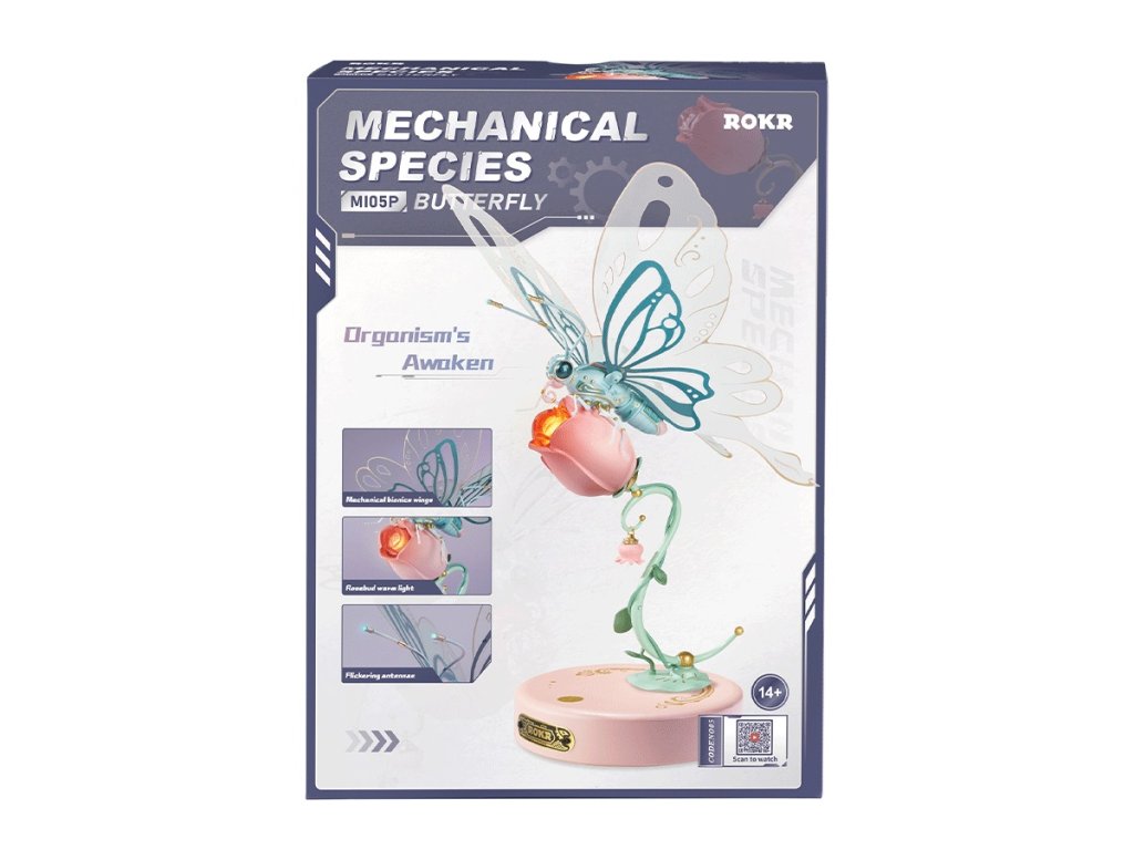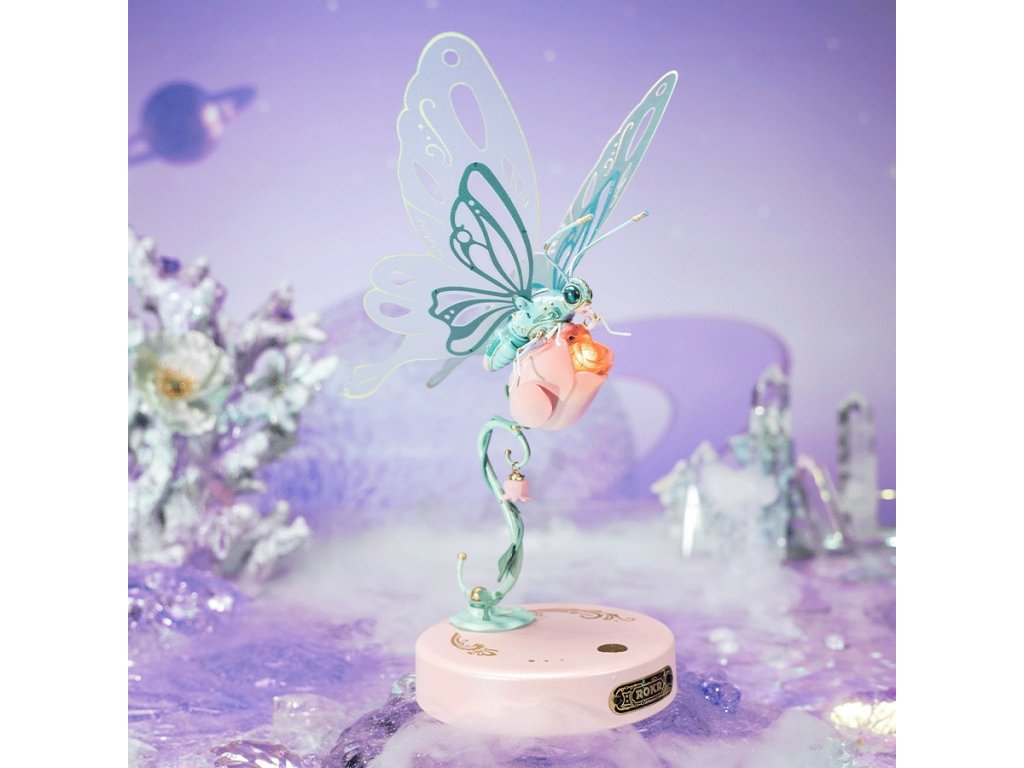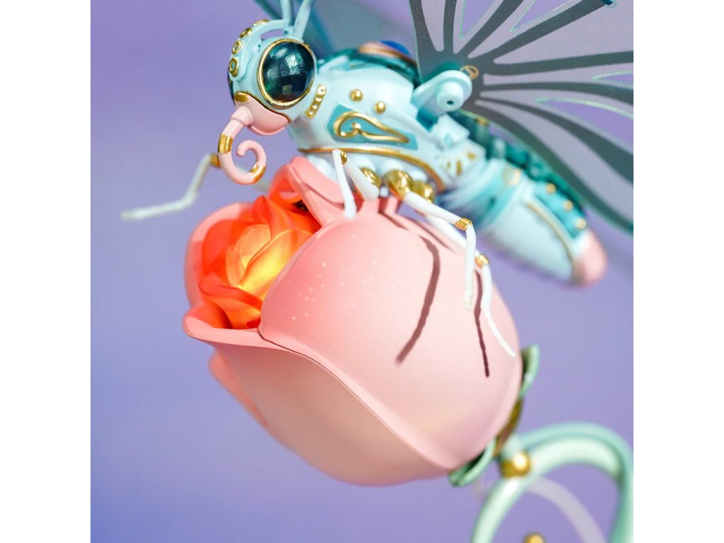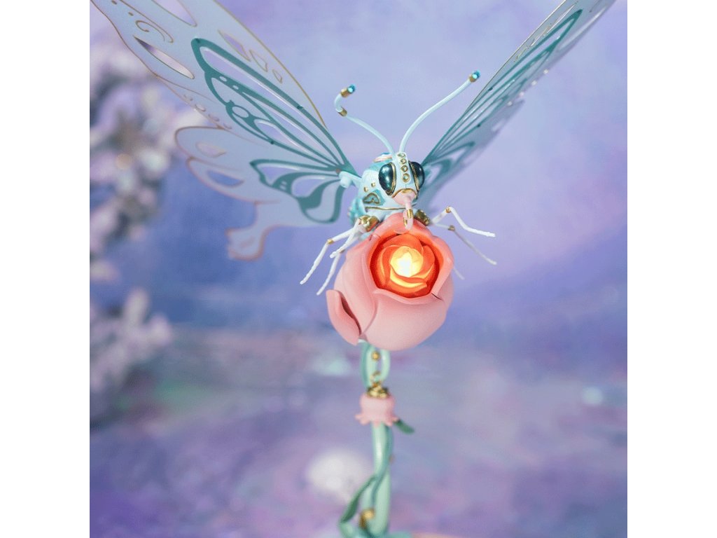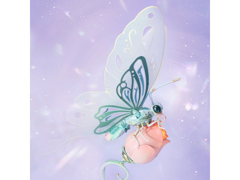 Příroda je plná tajemství a krásy. Detailně propracovaný mechanický motýl je navržen tak, aby ožil před Vašima očima. Tělo motýla je vyrobeno z pevného ABS plastu a jeho měkká třpytivá křídla z tenkého poddajného PVC (0,15 mm). Speciální tiskovou metodou byly vytvořeny efektní jemné vzory v barvě šampaňského na křídlech a zadní stranu tělíčka zdobí třpytivý drahokam, který září ve slunečním světle. Motýl sedí na poupěti růže, a ta je zakrouceným kovovým stonkem spojená s pevnou a stabilní základnou. Na stonku je zavěšený květ orchideje. Když motýla zapnete, začne mávat svými bionickými křídly, růže zlatavě svítí a tykadla se rozblikají, jakoby se třpytila ve slunečním světle. Motýl je poháněn miniaturním planetárním motorem (rychlost 9000 otáček za minutu, převodový poměr 1 : 171, točivý moment 333 g/cm). Pozvěte svou rodinu nebo přátele a užijte si zábavné tvoření. Výsledek bude stát za to! Dodáváno s podrobným návodem k sestavení. Hlavní vlastnosti: 79 dílkůstřední obtížnostrozvíjí logické a motorické dovednostipodporuje trpělivost dětíideální jako dárek nebo jedinečná dekoracepodrobný návod k sestavení součástí baleníminiaturní planetární motorvyžaduje 3 kusy baterií AAA/LR03/AM4 1,5V - nejsou součástí baleníSizing info