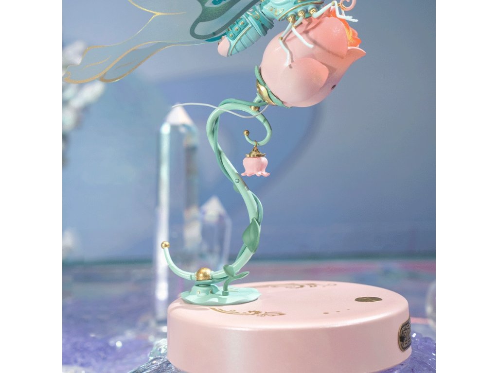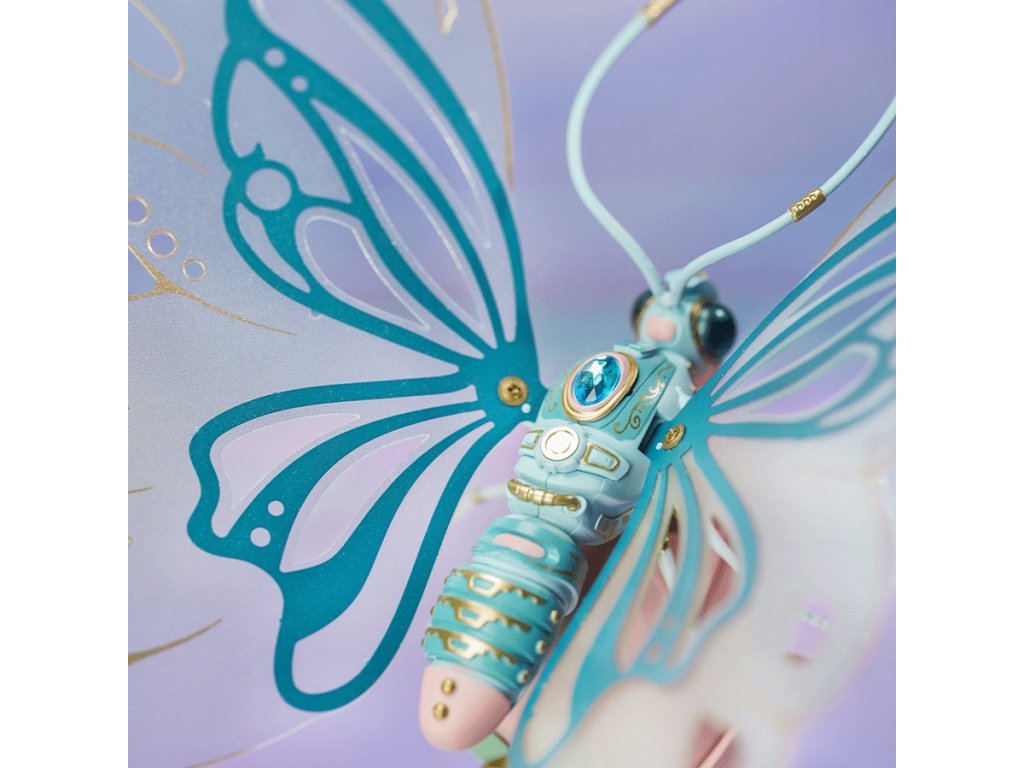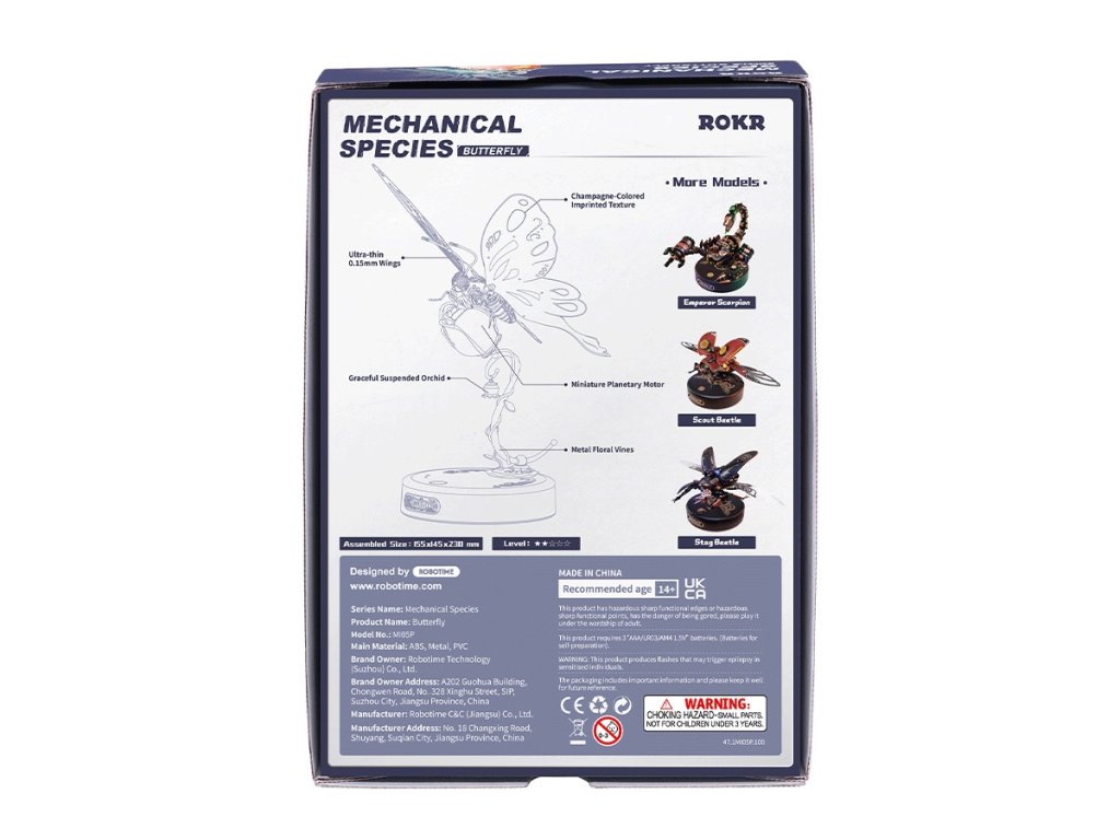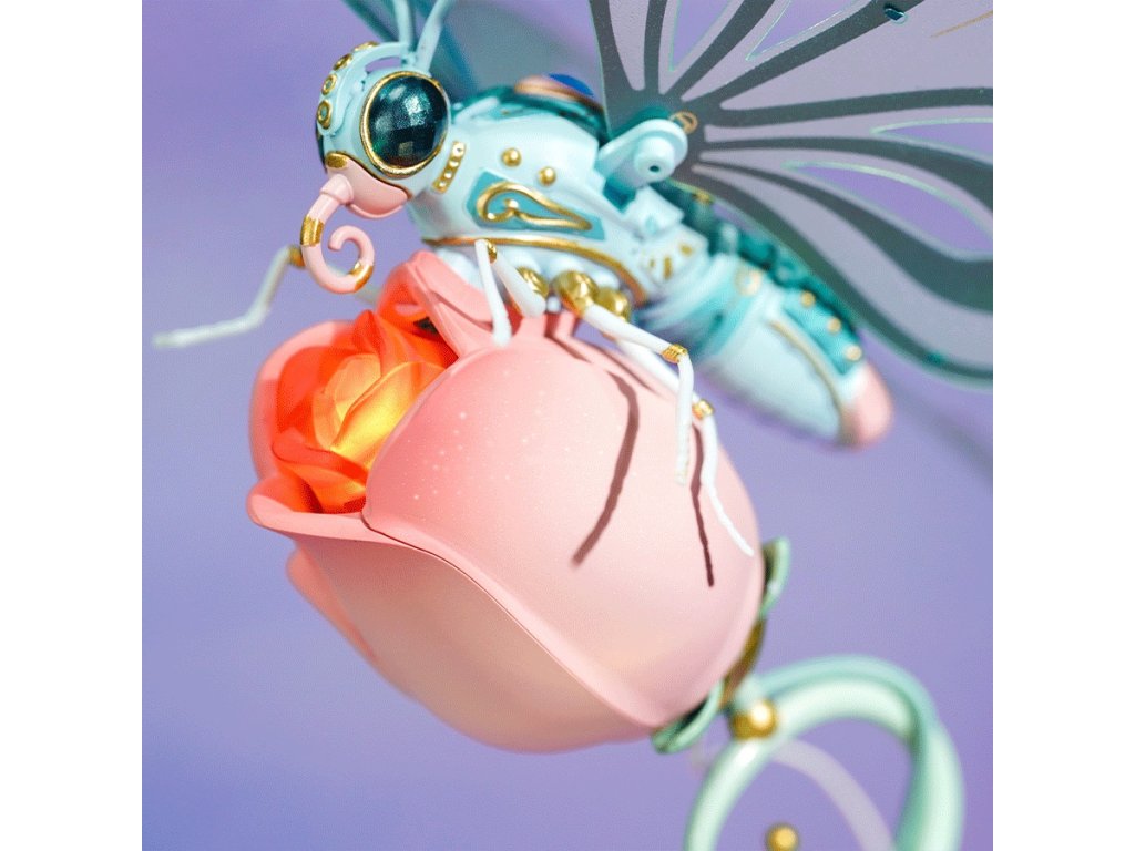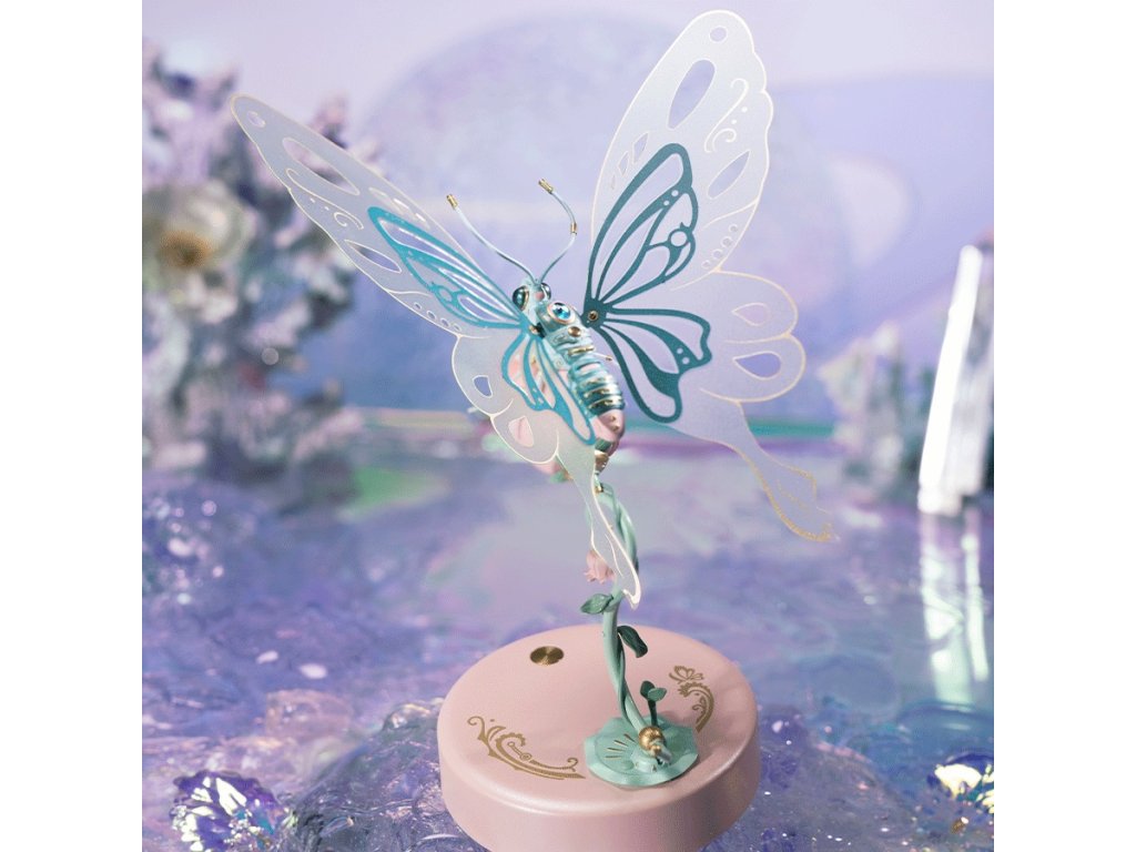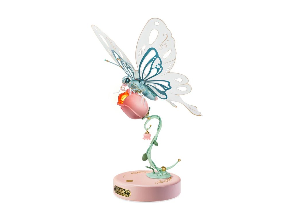 Příroda je plná tajemství a krásy. Detailně propracovaný mechanický motýl je navržen tak, aby ožil před Vašima očima. Tělo motýla je vyrobeno z pevného ABS plastu a jeho měkká třpytivá křídla z tenkého poddajného PVC (0,15 mm). Speciální tiskovou metodou byly vytvořeny efektní jemné vzory v barvě šampaňského na křídlech a zadní stranu tělíčka zdobí třpytivý drahokam, který září ve slunečním světle. Motýl sedí na poupěti růže, a ta je zakrouceným kovovým stonkem spojená s pevnou a stabilní základnou. Na stonku je zavěšený květ orchideje. Když motýla zapnete, začne mávat svými bionickými křídly, růže zlatavě svítí a tykadla se rozblikají, jakoby se třpytila ve slunečním světle. Motýl je poháněn miniaturním planetárním motorem (rychlost 9000 otáček za minutu, převodový poměr 1 : 171, točivý moment 333 g/cm). Pozvěte svou rodinu nebo přátele a užijte si zábavné tvoření. Výsledek bude stát za to! Dodáváno s podrobným návodem k sestavení. Hlavní vlastnosti: 79 dílkůstřední obtížnostrozvíjí logické a motorické dovednostipodporuje trpělivost dětíideální jako dárek nebo jedinečná dekoracepodrobný návod k sestavení součástí baleníminiaturní planetární motorvyžaduje 3 kusy baterií AAA/LR03/AM4 1,5V - nejsou součástí baleníSizing info