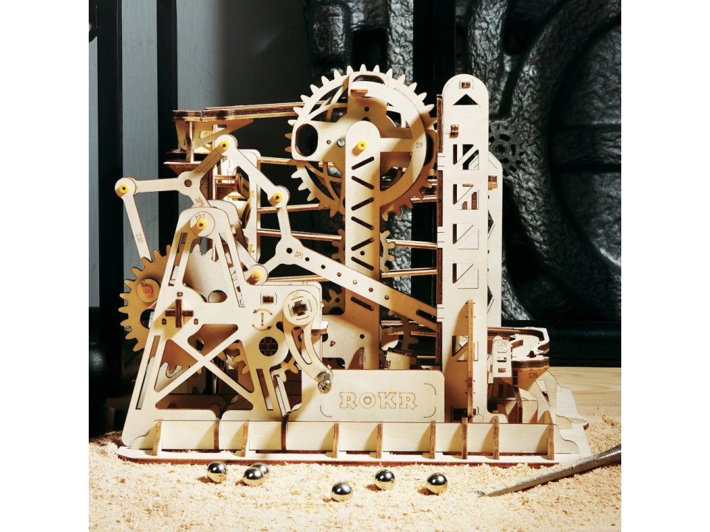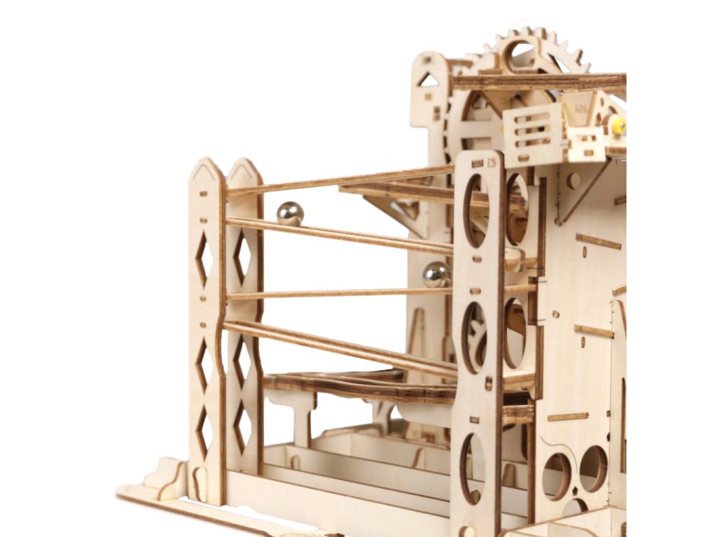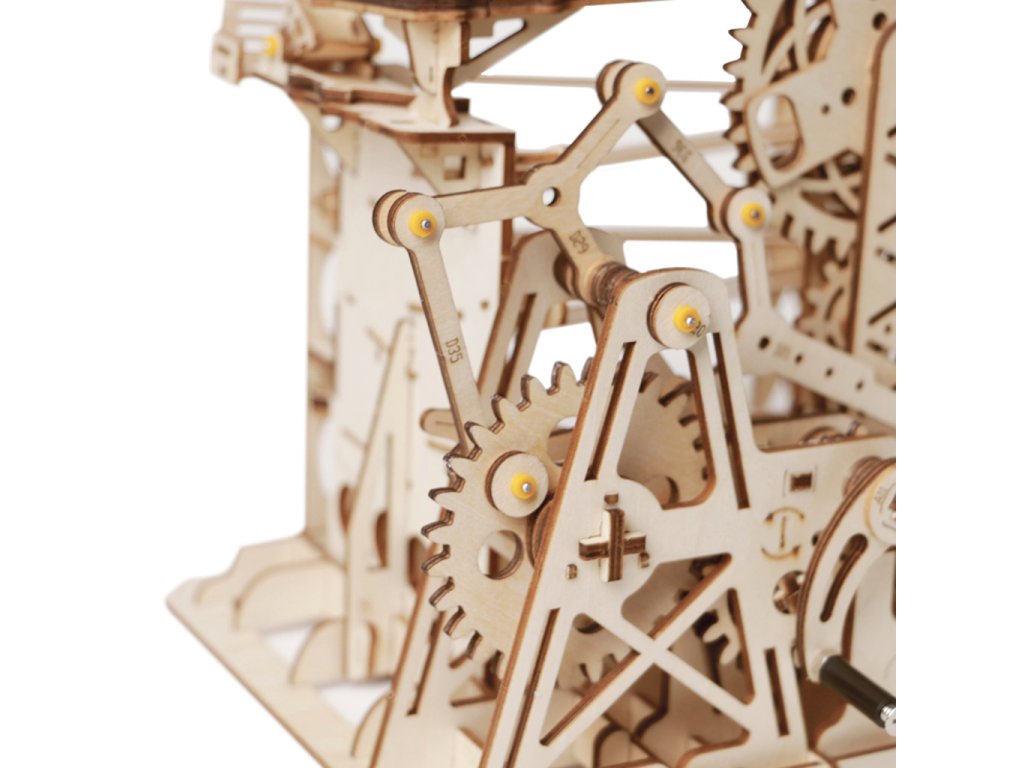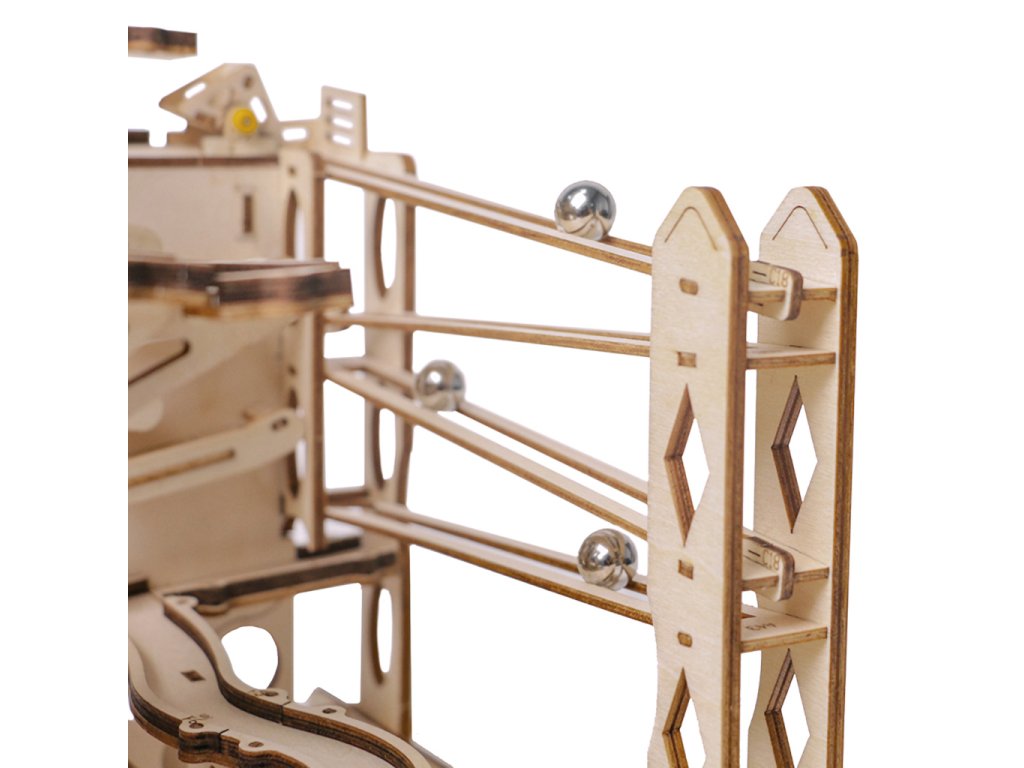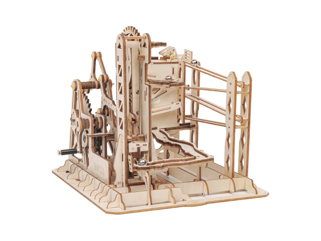 Kuličková dráha s výtahem v šachtě a velkou kaskádou. Skládačky kuličkových drah Robotime nabízejí jinde nevídané podrobnosti a variabilitu. Každá se může pyšnit originálními funkčními detaily a roztodivnými překážkami, které často nápaditě změní dráhu kuličky, a přinášejí tak výjimečnou zábavu. Mechanika je poháněna ručním pohonem, otáčením klikou, kterým jsou také vynášeny a na cestu pravidelně spouštěny kuličky. Skládačka je dodávána v nesloženém stavu, balena v krabici. Vybaveno detailním návodem k sestavení. Hlavní vlastnosti:skládačka dráhy a 10 kuliček219 precizně vyřezaných dílkůstřední obtížnost sestaveníSizing info