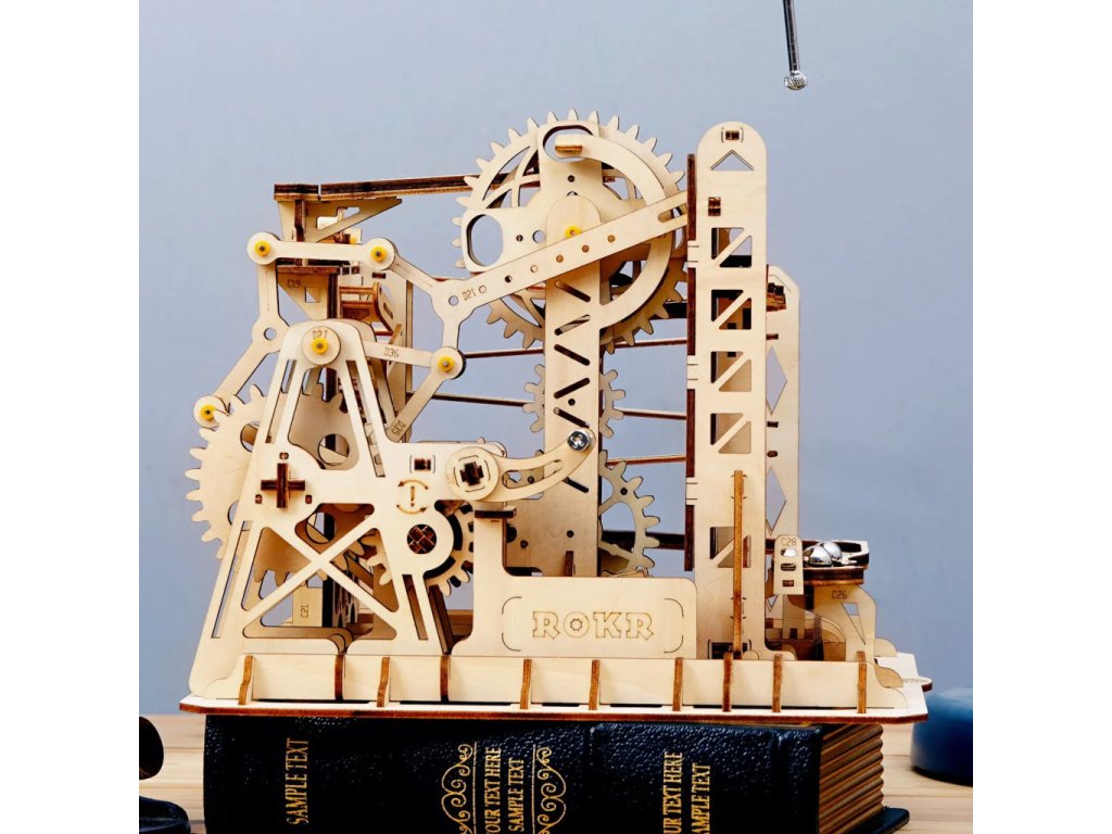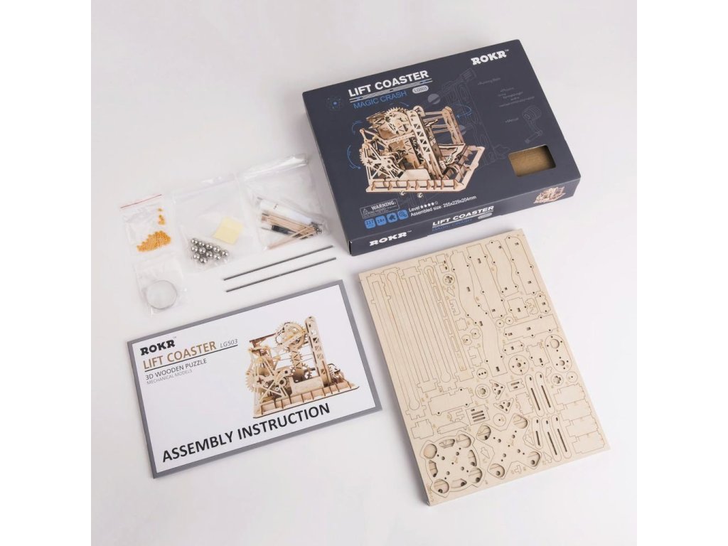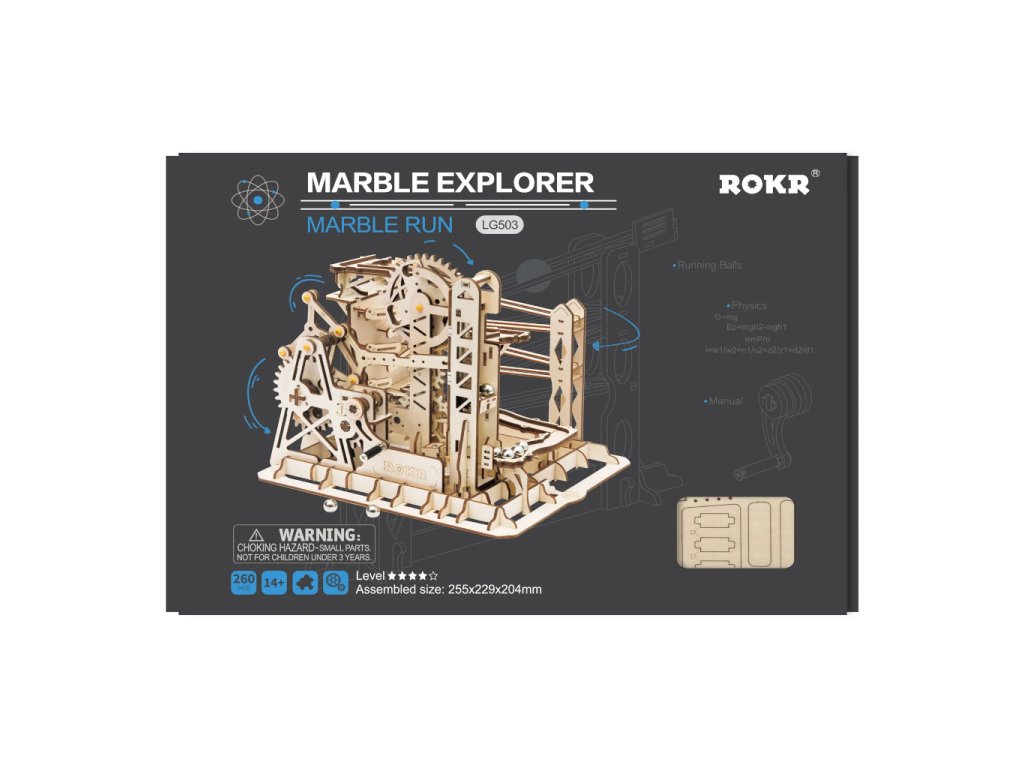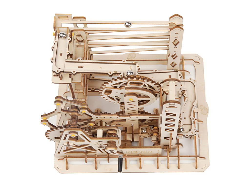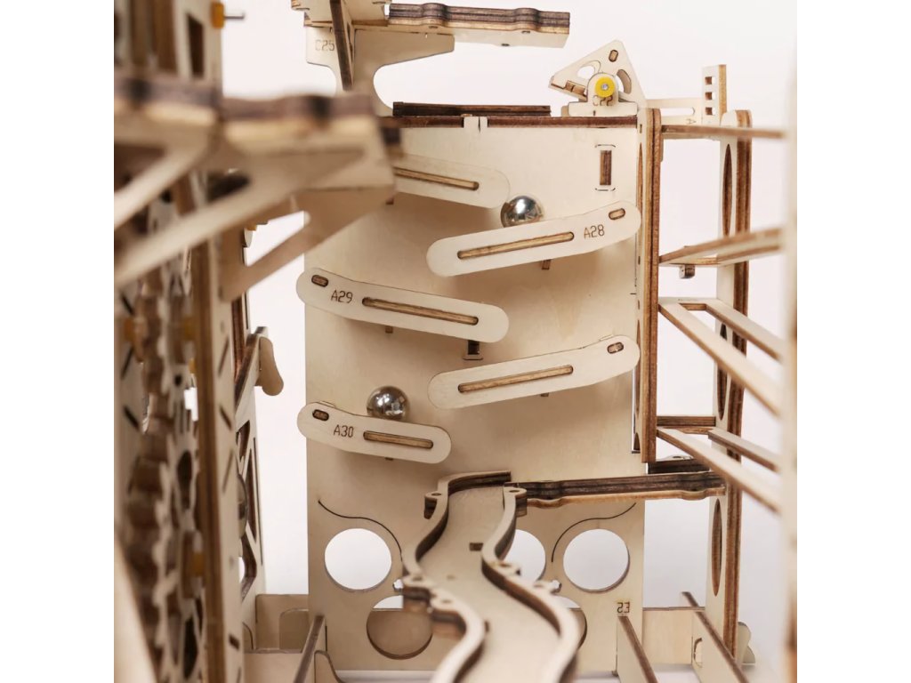 Kuličková dráha s výtahem v šachtě a velkou kaskádou. Skládačky kuličkových drah Robotime nabízejí jinde nevídané podrobnosti a variabilitu. Každá se může pyšnit originálními funkčními detaily a roztodivnými překážkami, které často nápaditě změní dráhu kuličky, a přinášejí tak výjimečnou zábavu. Mechanika je poháněna ručním pohonem, otáčením klikou, kterým jsou také vynášeny a na cestu pravidelně spouštěny kuličky. Skládačka je dodávána v nesloženém stavu, balena v krabici. Vybaveno detailním návodem k sestavení. Hlavní vlastnosti:skládačka dráhy a 10 kuliček219 precizně vyřezaných dílkůstřední obtížnost sestaveníSizing info
