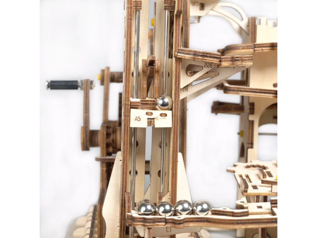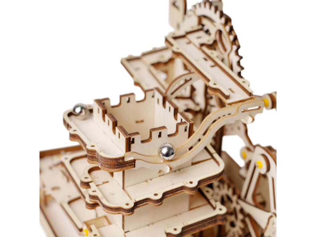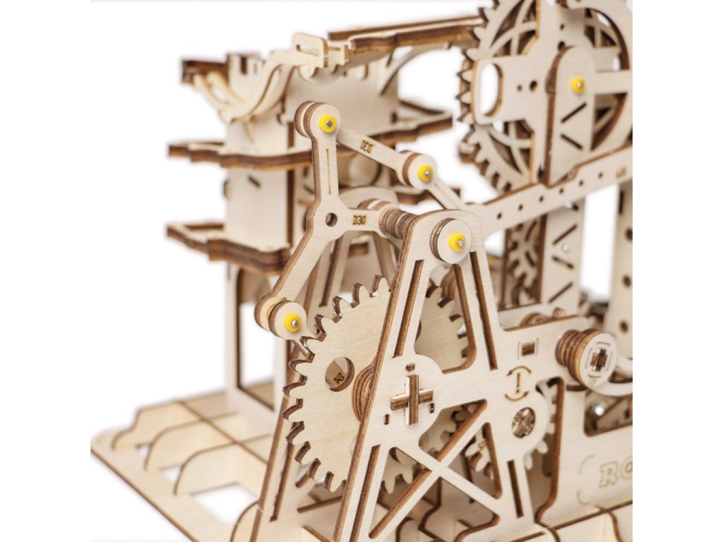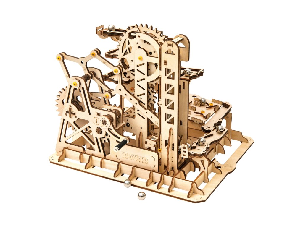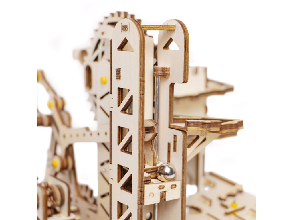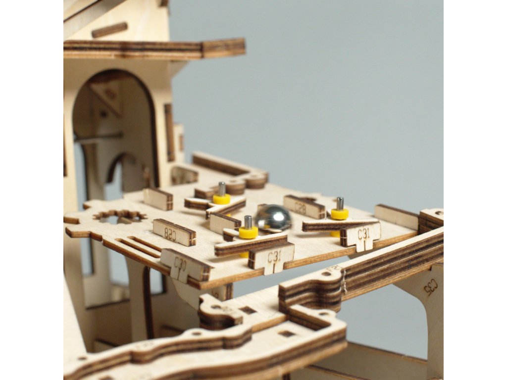 Kuličková dráha s výtahem v šachtě a překážkovou věží. Skládačky kuličkových drah Robotime nabízejí jinde nevídané podrobnosti a variabilitu. Každá se může pyšnit originálními funkčními detaily a roztodivnými překážkami, které často nápaditě změní dráhu kuličky, a přinášejí tak výjimečnou zábavu. Mechanika je poháněna ručním pohonem, otáčením klikou, kterým jsou také vynášeny a na cestu pravidelně spouštěny kuličky. Skládačka je dodávána v nesloženém stavu, balena v krabici. Vybaveno detailním návodem k sestavení. Hlavní vlastnosti:skládačka dráhy a 10 kuliček227 precizně vyřezaných dílkůstřední obtížnost sestaveníSizing info