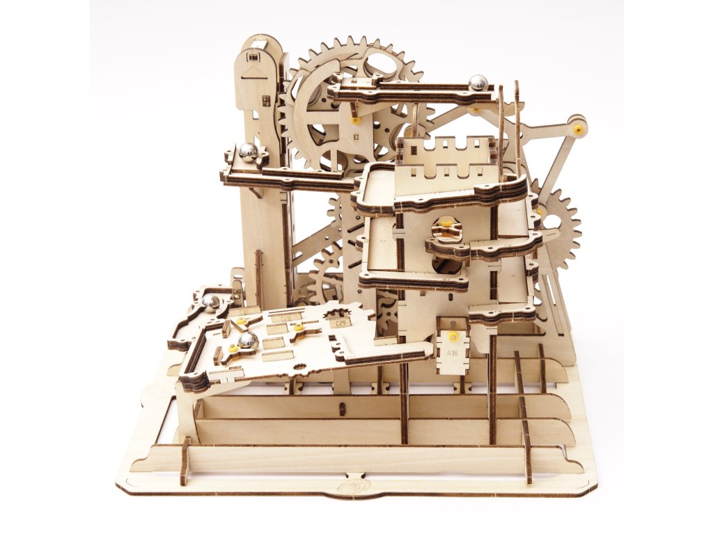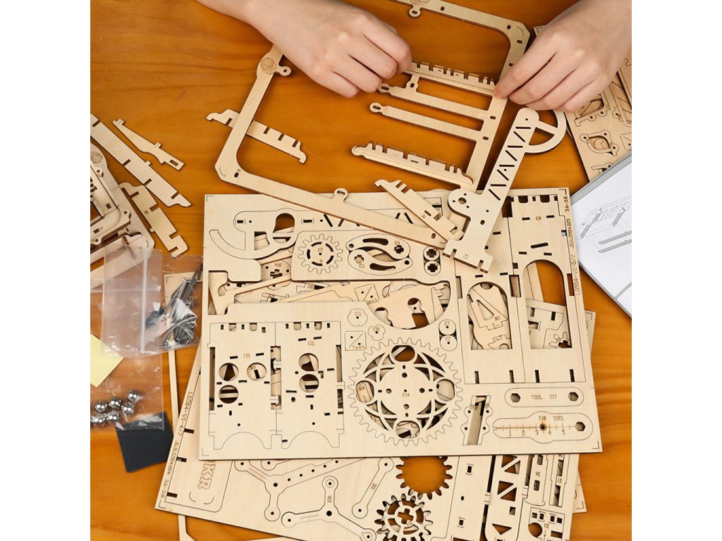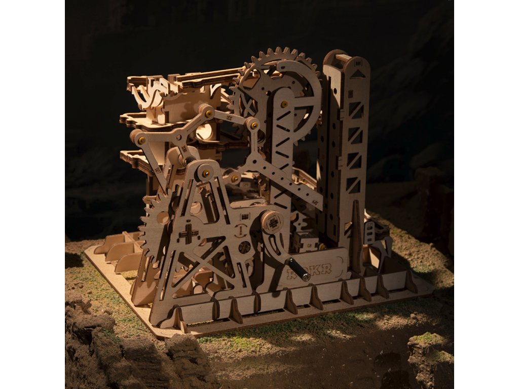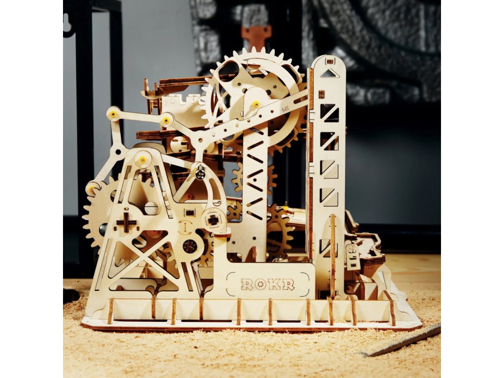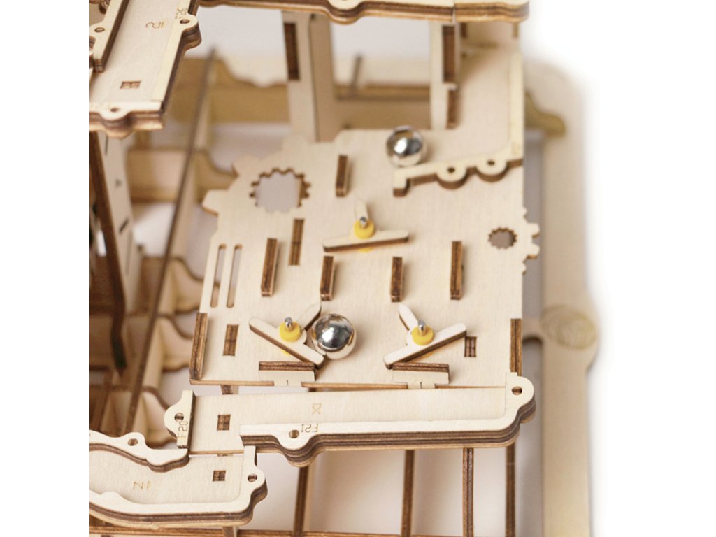 Kuličková dráha s výtahem v šachtě a překážkovou věží. Skládačky kuličkových drah Robotime nabízejí jinde nevídané podrobnosti a variabilitu. Každá se může pyšnit originálními funkčními detaily a roztodivnými překážkami, které často nápaditě změní dráhu kuličky, a přinášejí tak výjimečnou zábavu. Mechanika je poháněna ručním pohonem, otáčením klikou, kterým jsou také vynášeny a na cestu pravidelně spouštěny kuličky. Skládačka je dodávána v nesloženém stavu, balena v krabici. Vybaveno detailním návodem k sestavení. Hlavní vlastnosti:skládačka dráhy a 10 kuliček227 precizně vyřezaných dílkůstřední obtížnost sestaveníSizing info