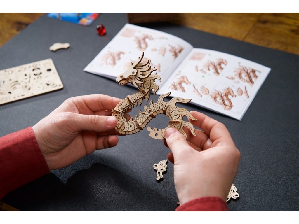 Rok 2024 patří Dřevěnému Drakovi! Tento magický tvor, symbol síly, štěstí a prosperity, se objevuje pouze jednou za 60 let. Tento elegantní model draka, inspirovaný staletími čínského umění, Vás okouzlí svou krásou a propracovaností. Jeho dlouhé, stočené tělo spočívá na zdobeném podstavci, který v sobě ukrývá tajnou schránku. Stačí stisknout nenápadné tlačítko ukryté v květu a odhalíte prostor pro Vaše nejcennější poklady. Uložte do něj tajný vzkaz, osobní amulet nebo speciální červenou obálku "hóngbāo" s darem pro štěstí v novém roce. Ať už ho darujete jako symbol štěstí a prosperity blízkým, nebo si ho postavíte sami a obohatíte jím svůj domov, Dřevěný drak se stane nepřehlédnutelným klenotem Vaší sbírky. Žádné lepidlo, žádné složitosti. Stačí dílky snadno vyjmout a sestavit podle přehledného návodu v 11 jazycích. Drak je plně pohyblivý a lze ho z podstavce odejmout. Hlavní vlastnosti: rozvíjí kreativitu, trpělivost a technické myšleníautentický design inspirovaný tradičním čínským uměnímimpozantní dekoracekvalitní materiály a zpracovánípočet dílků 141doba sestavení cca 2 hodinyobtížnost jednoducháSizing info
