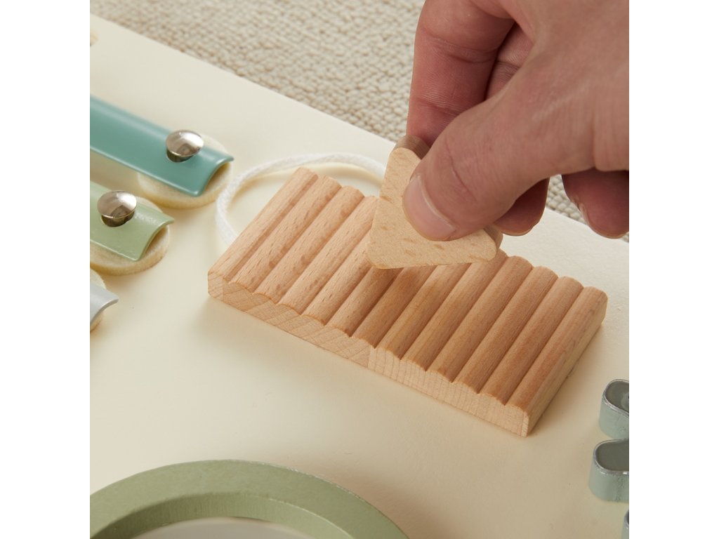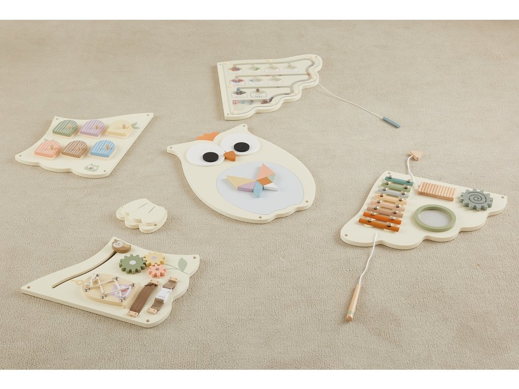 Tato velká dřevěná motorická deska ve tvaru sovy v jemných pastelových barvách zaujme děti už na první pohled. A to nejen svým roztomilým vzhledem, ale hlavně pestrou nabídkou aktivit. Na roztažených křídlech najdou děti více než deset různorodých herních prvků: xylofon, ozubená kolečka, zrcátko, bludiště, posuvné a otevírací prvky, magnetickou tabulku s magnety, dvířka s hmatovým překvapením uvnitř a různě barevné korálky. Všechny tyto detaily děti motivují ke zkoumání, objevování a hravému učení. Děti si při hře procvičí jemnou motoriku, logické myšlení, smyslové vnímání i koordinaci ruka–oko a to vše zábavnou formou. Deska je dostatečně velká pro skupinovou hru. Zároveň působí jako stylová dekorace do dětského pokoje nebo herny. Hlavní vlastnosti: velká motorická deska ve tvaru sovyjemné pastelové barvy v kombinaci s přírodním dřevemvíce než 10 různorodých aktivitrozvíjí motoriku, logiku a smyslové vnímáníkvalitní a bezpečné zpracovánívhodná od 3 letedukativní hračka i stylová dekoraceSizing info