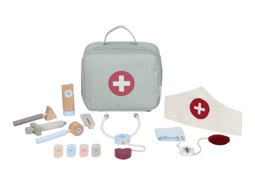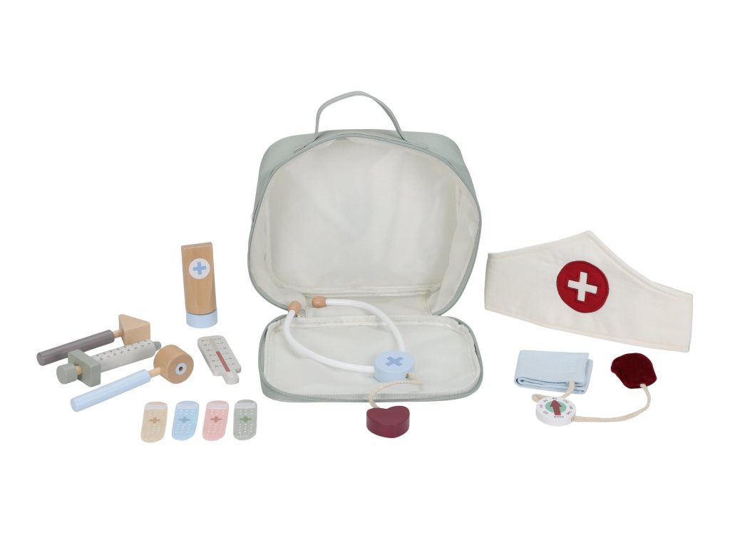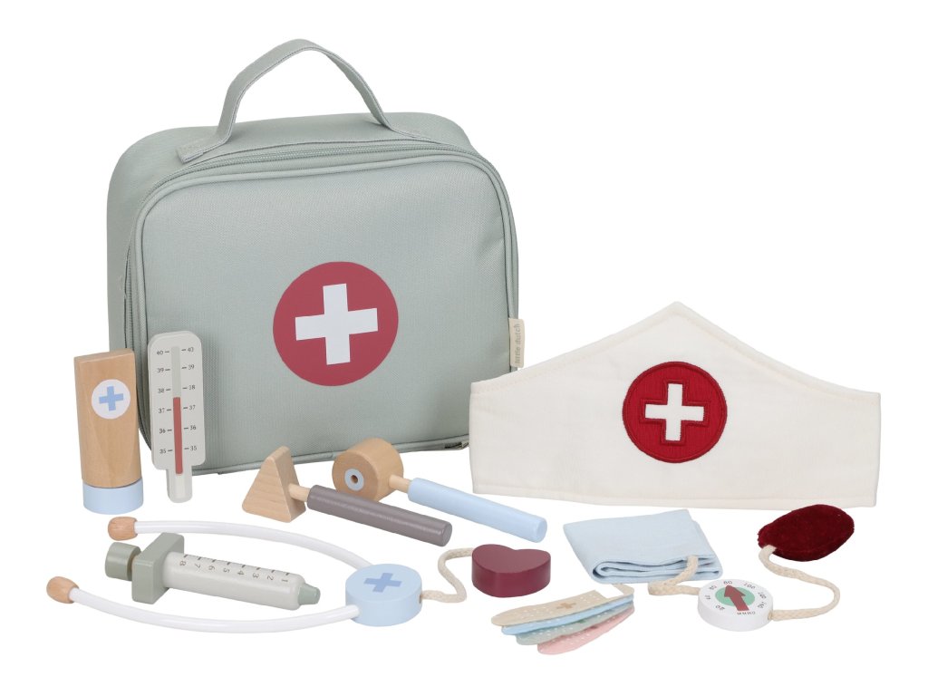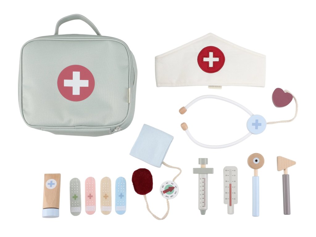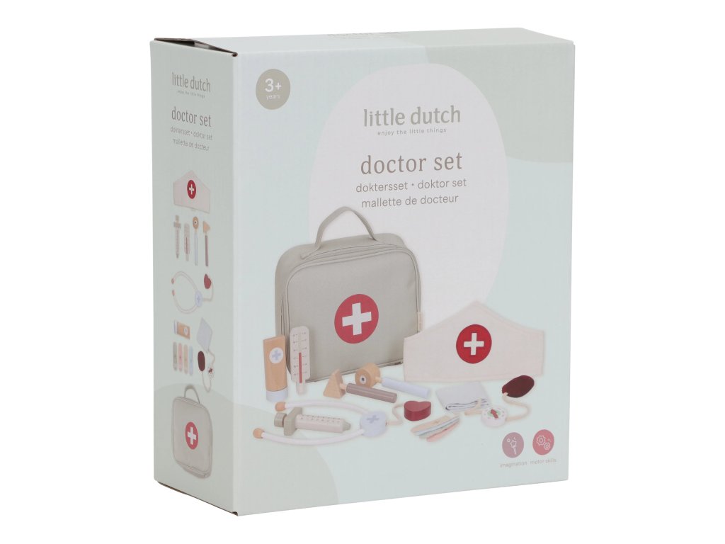 Paní doktorko, pane doktore – mohl/a byste se na mě podívat? S touto krásnou dřevěnou doktorskou sadou bude vaše dítě připravené postarat se o každého pacienta. Textilní lékařská taška ukrývá veškeré základní vybavení: teploměr, injekci, obvazy, stetoskop, tlakoměr a dokonce i doktorskou čepici. Hra na lékaře podporuje rozvoj empatie, fantazie a pomáhá dětem lépe porozumět tomu, co se děje při skutečné návštěvě ordinace. Ideální hračka pro všechny malé ošetřovatele a lékaře. Hračka je součástí kolekce vysoce kvalitních dřevěných hraček Little Dutch, navržených s důrazem na bezpečnost a originální design. Dřevěné části jsou vyrobené z odolného FSC certifikovaného dřeva. Rozměry: 23 x 19 x 9,4 cm Vhodné pro děti od 3 let.Doplňkové parametry