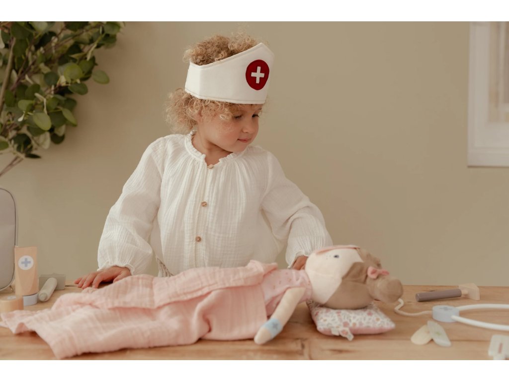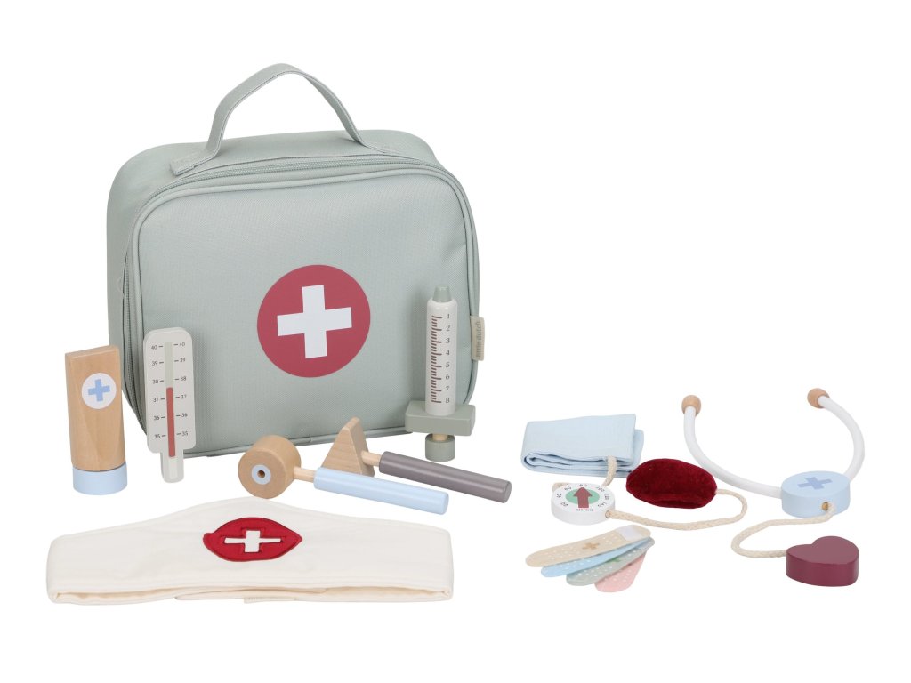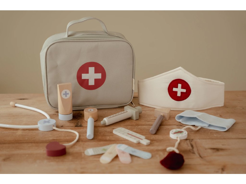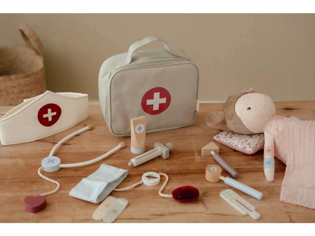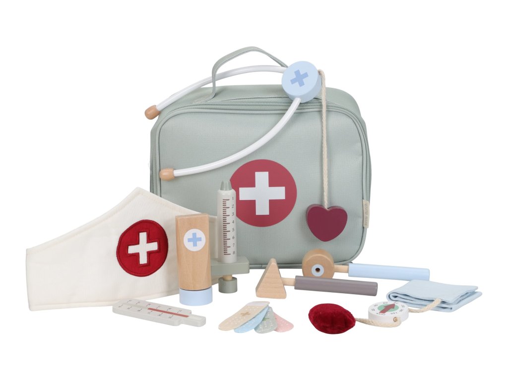 Paní doktorko, pane doktore – mohl/a byste se na mě podívat? S touto krásnou dřevěnou doktorskou sadou bude vaše dítě připravené postarat se o každého pacienta. Textilní lékařská taška ukrývá veškeré základní vybavení: teploměr, injekci, obvazy, stetoskop, tlakoměr a dokonce i doktorskou čepici. Hra na lékaře podporuje rozvoj empatie, fantazie a pomáhá dětem lépe porozumět tomu, co se děje při skutečné návštěvě ordinace. Ideální hračka pro všechny malé ošetřovatele a lékaře. Hračka je součástí kolekce vysoce kvalitních dřevěných hraček Little Dutch, navržených s důrazem na bezpečnost a originální design. Dřevěné části jsou vyrobené z odolného FSC certifikovaného dřeva. Rozměry: 23 x 19 x 9,4 cm Vhodné pro děti od 3 let.Doplňkové parametry