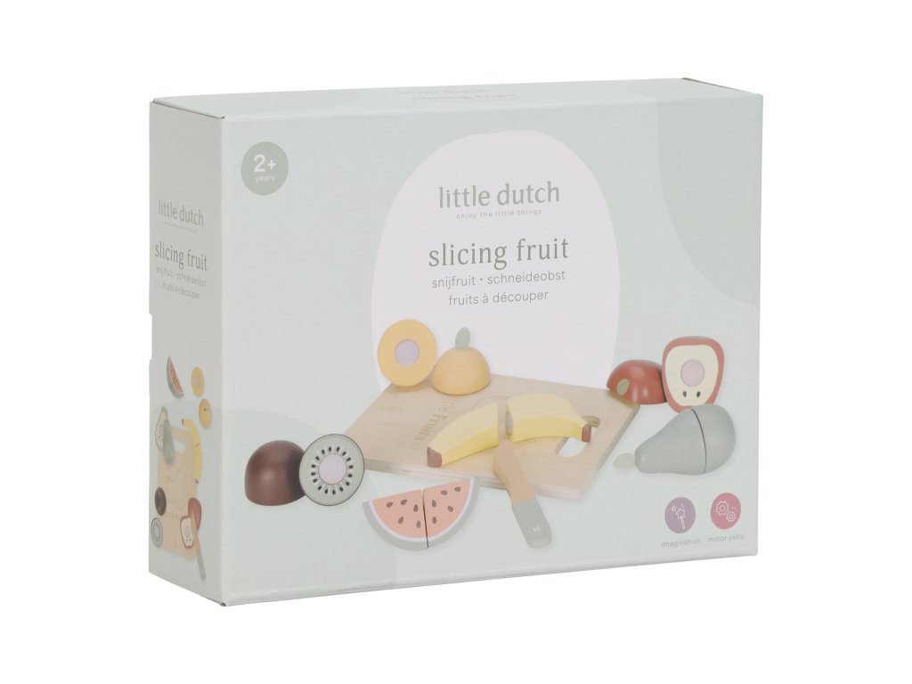 Připravte ovocnou svačinku s touto veselou sadou dřevěného krájecího ovoce! V sadě najdete šest druhů ovoce: jablko, hrušku, banán, kiwi, pomeranč a kousek melounu – každý z nich lze rozkrojit dřevěným nožíkem na dvě poloviny a díky suchému zipu je opět snadno spojíte zpět. Součástí sady je i krájecí prkénko a dřevěný nůž, takže si malí kuchaři mohou vyzkoušet přípravu zdravé svačiny přesně jako dospělí. Skvělý způsob, jak rozvíjet jemnou motoriku, koordinaci ruky a oka i hru na role. Hračka je součástí kolekce vysoce kvalitních dřevěných hraček Little Dutch, navržených s důrazem na bezpečnost a originální design. Vyrobeno z odolného FSC certifikovaného dřeva. Rozměry: 21 x 16,5 x 6 cm Vhodné pro děti od 2 let.Doplňkové parametry