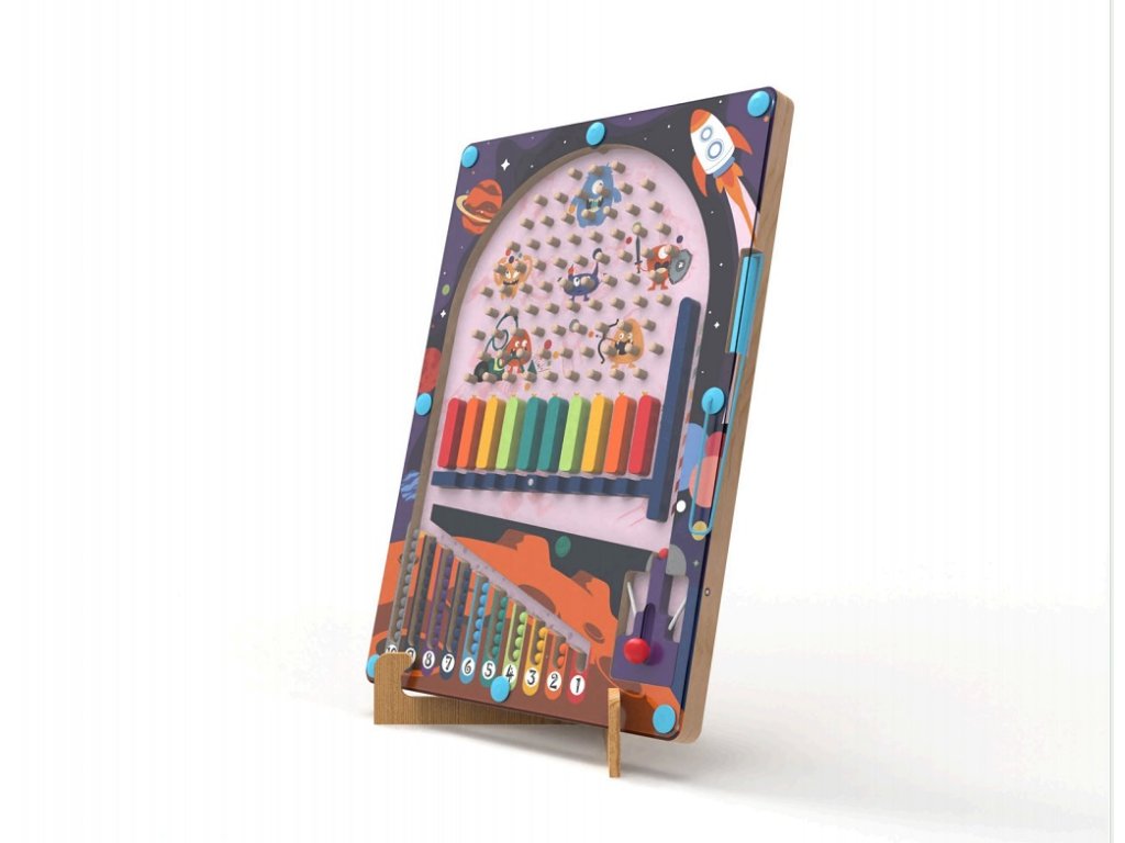 Originální dřevěná hra s vesmírným motivem nabízí dětem hned dvě možnosti, jak si užít spoustu zábavy: klasický pinball s vystřelováním kuliček a magnetickou hru se sbíráním bodů. Barevná hrací deska je navržena tak, aby podporovala zručnost, soustředění a trpělivost. Pomocí vystřelovače (katapultu) se hráči snaží dostat magnetické kuličky co nejpřesněji do vybraných polí a získat co nejvíce bodů. Přehledné uspořádání hrací plochy umožňuje snadné sledování výsledků a zároveň děti učí počítat body. Díky praktickému stojánku lze hru pohodlně postavit na stůl.Zábavná hra, která rozvíjí postřeh, jemnou motoriku a logické myšlení. Ideální pro samostatné hraní nebo zábavné soutěžení s kamarády a rodiči. Hlavní vlastnosti: 2 hry v 1 — pinball + magnetická hrarozvoj jemné motoriky a koordinace ruka–okopodpora trpělivosti, soustředění a logického myšleníprvní seznámení s jednoduchým bodováním a počítánímrobustní a kvalitní provedení ze dřevahravý design s vesmírnými motivySizing info
