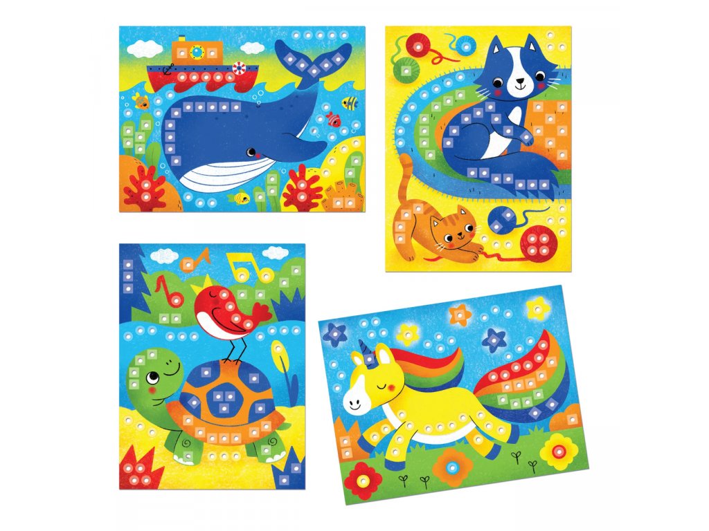 Poznejte podmořský svět, zahrajte si s roztomilými koťátky či proběhněte květinovým polem s jednorožcem! S touto sadou se nebudete nudit! Kolíčková mozaika obsahuje 4 předtištěné perforované karty, 180 barevných kolíčků, zapichovací podložky, úchytný rám a úložný košík. Mozaika rozvíjí jemnou motoriku, koordinaci ruka-oko a kreativní myšlení. Obsah balení:1 úložný košík1 zapichovací podložka s otvory na kolíčky1 úchytný rám4 předtištěné karty s obrázky180 barevných zapichovacích kolíčků ve 2 tvarech a 6 barvách Hlavní vlastnosti: podporuje jemnou motoriku, koordinaci ruka-oko a kreativní myšleníučí vnímat barvy a tvarypro děti od 3 letvyrobeno v ItáliiSizing info