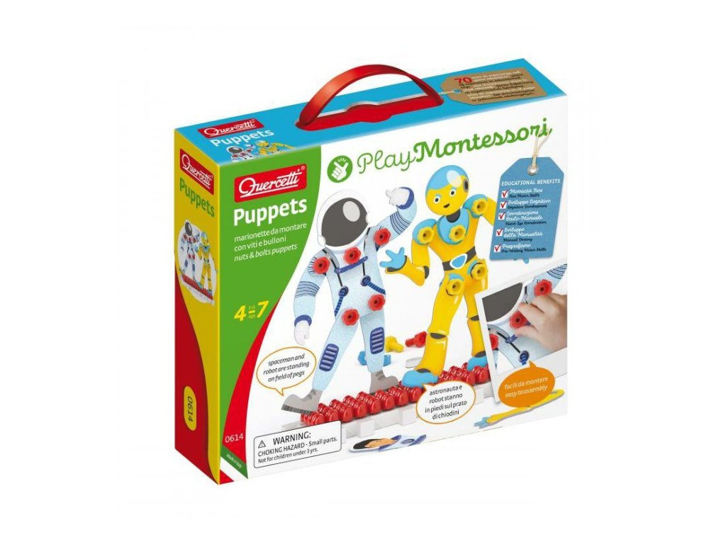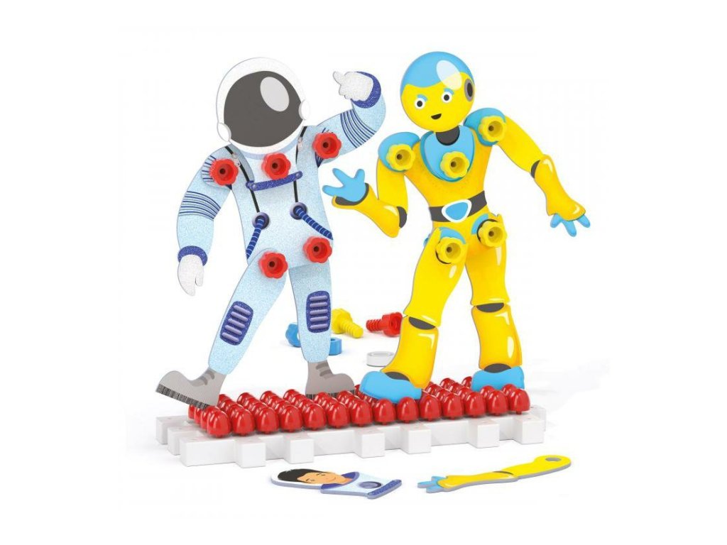 Sestav si dvě pohyblivé postavičky! Dvě postavičky – kosmonaut a robot – jsou vyrobeny z odolného masivního kartonu. Díky šroubkům a matičkám je lze snadno sestavit a nechat je zaujmout kteroukoli z tisíce různých pozic, v nichž dovedou stát mezi kolíčky zasunutými do podložky, která je součástí balení. Pohyblivé postavičky z nové řady Play Montessori pomáhají dětem od 4 do 7 let zábavným způsobem rozvíjet jejich poznávací schopnosti a vizuomotorickou koordinaci. Při jejich sestavování pomocí šroubků, podložek a matiček z trvanlivého plastu si děti zároveň procvičují a zdokonalují jemnou motoriku i manuální zručnost a rozvíjejí také svou grafomotoriku, což je soubor psychomotorických činností nezbytných k úspěšnému zvládnutí psaní a kreslení. Obsah balení: 2 postavičky z odolného masivního kartonu10 šroubků, 10 matic a 6 distančních podložek3 podstavné plochy a 56 kolíčků 1 příručka Play Montessori Hlavní vlastnosti: rozvíjí vizuomotorickou koordinacizdokonaluje jemnou motoriku i manuální zručnostpro děti od 4 do 7 letSizing info