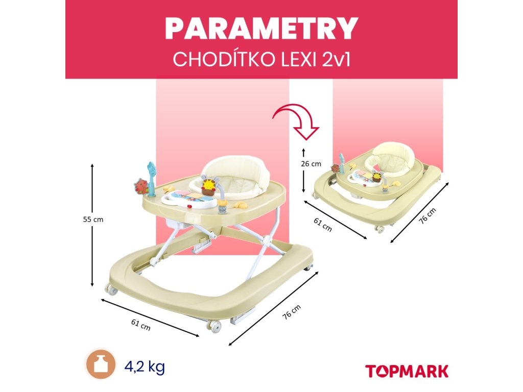 - Chodítko lze po vyjmutí zadní tyče přeměnit v chodítko aktivity pro první krůčky, chodítko je možné tlačit.