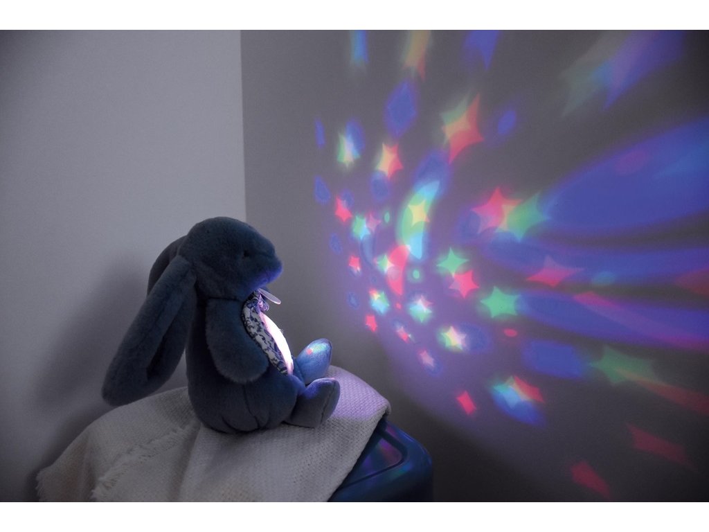 Kdopak tady ještě nespí? Díky tomuto roztomilému králíčkovi bude uspávání Vašeho děťátka hračkou. Králíček z jemného materiálu je vhodný na mazlení a na bříšku má hrací skříňku s projekcí vesmíru v 7 barvách. Přehrává 10 jemných melodií a 5 uklidňujících zvuků, které ukolébají Vaše miminko a podpoří jeho relaxaci a kvalitní spánek. Pomocí 4 tlačítek je možné nastavit hlasitost a různé režimy přehrávání melodií a jednotlivé barevné režimy. Na výběr je automatický režim, kdy se melodie přehrávají opakovaně nebo je možné zvolit konkrétní skladbu. Stejně tak můžete nastavit automatický režim světla, kdy se budou barvy plynule měnit anebo vybrat Vaši oblíbenou barvu. Vizuální a sluchová stimulace pomáhá smyslovému rozvoji dítěte. Tato hrací skříňka s projekcí je krásným dárkem pro každé dítě již od narození. ÚdržbaKrálíčka perte v lázni na 30° (před praním vyjměte hrací strojek). Sušte přirozeně nebo při nízké teplotě. Hlavní vlastnosti: plyšová hračka a hrací skříňka s projekcí v jednomhrací skříňka je odnímatelná pro snadnou údržbuvizuální a smyslová stimulaceměkký plyšv souladu s evropskými normami CEvhodné jako dárek nebo doplněk do dětského pokojíčkuk napájení slouží 3 baterie AAA/R03 (nejsou součástí balení)od narozeníSizing info