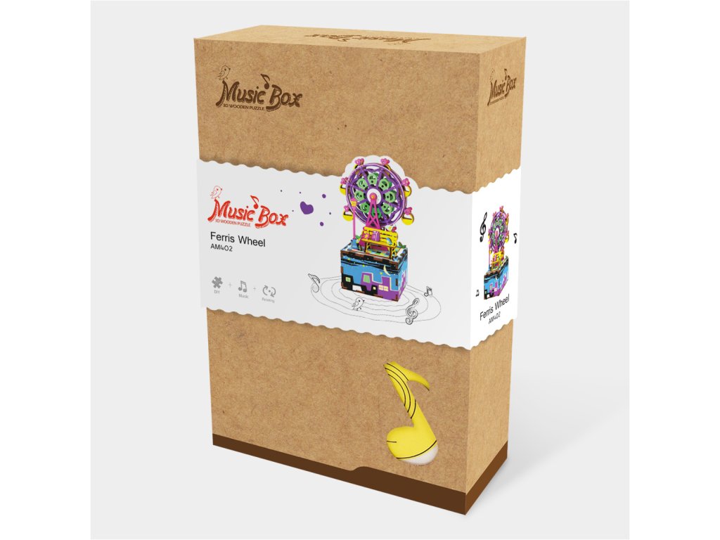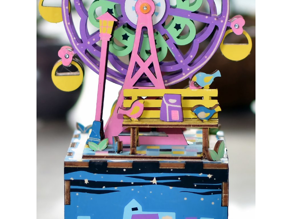 Detailní barevný model klasického kolotoče. Skládačky hracích skříněk Robotime jsou nabízeny v mnoha podobách, přírodních i barevných, lišících se nápaditými pohyblivými detaily doprovázejícími zvuk. Nezaskočí Vás svou náročností a po sestavení zkrášlí poličku. Nechte se unášet známými melodiemi, každá skříňka hraje jinou, odpovídající své výsledné podobě. Kvalitní natahovací 18 tónové strojky s japonskými komponenty zaručují čistý a dostatečně hlasitý projev. Skládačka je dodávána v nesloženém stavu, balena v krabici. Vybaveno detailním návodem k sestavení. Hlavní vlastnosti:melodie Castle In The Sky69 precizně vyřezaných potištěných dílkůstřední obtížnost sestaveníSizing info
