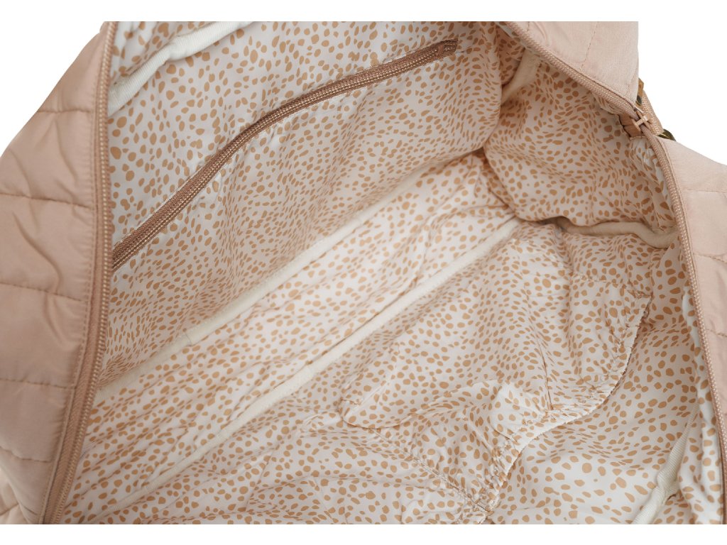 Přebalovací taška z příjemného prošívaného materiálu s výplní a s originální puntíkovanou podšívkou nabízí množství vnitřních i vnějších kapes pro přehledné uspořádání všeho potřebného na procházkách a výletech s vaším dítětem. Součástí tašky je i praktická přebalovací podložka. Ramenní popruh i držadla umožňují nošení přes rameno, v ruce i zavěšení na rukojeť kočárku. Taška se uzavírá na zip. Složení: 100% polyester Rozměry: 42 x 30 x 13 cmDoplňkové parametry
